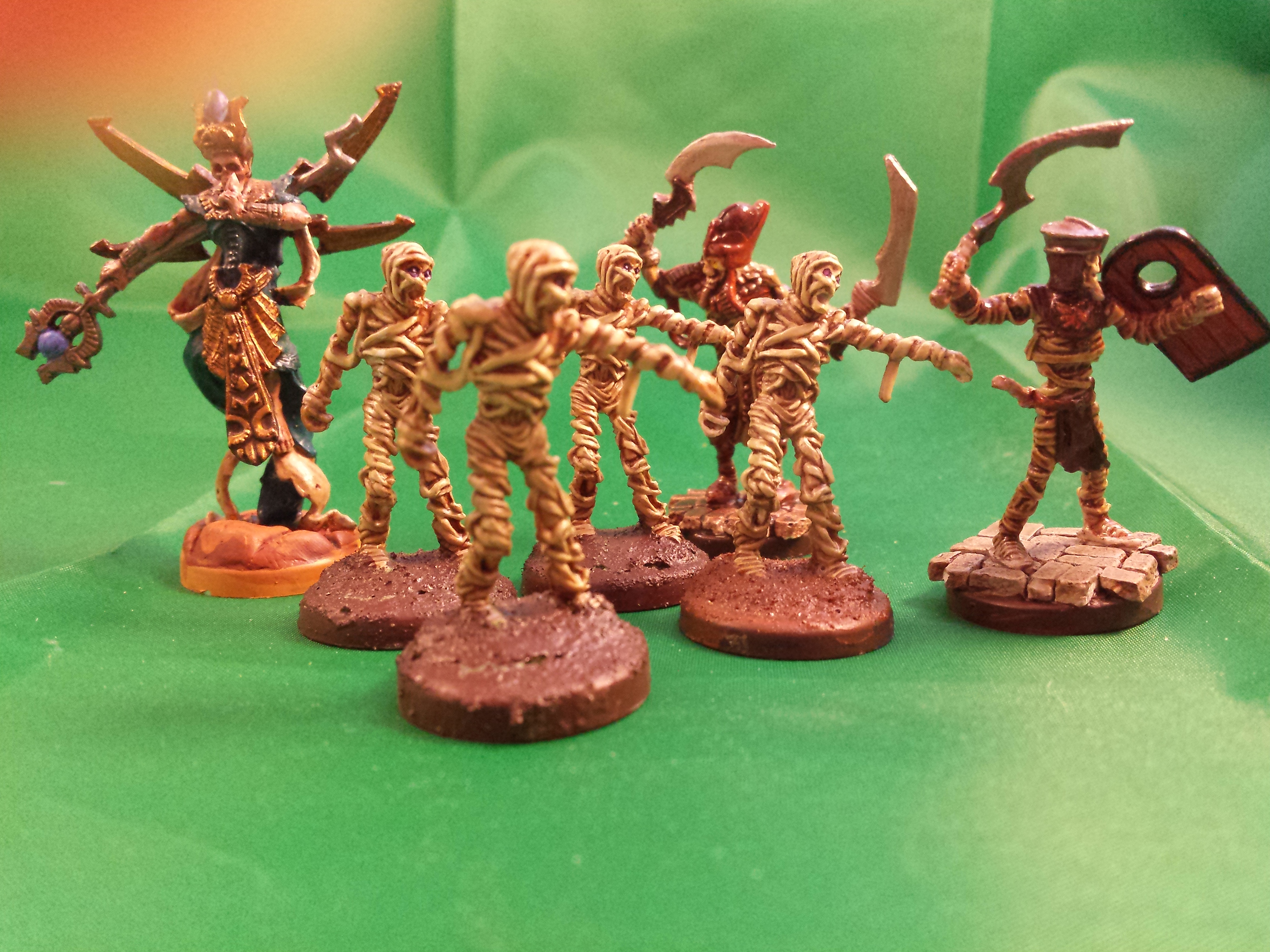 This is my undead horde! Mummies, mummies, and a lich! These were fun to paint. Layer of paint, ink wash, layer of paint, ink wash, then fine line. I just realized my finger is making an appearance in this picture.. My bad!
