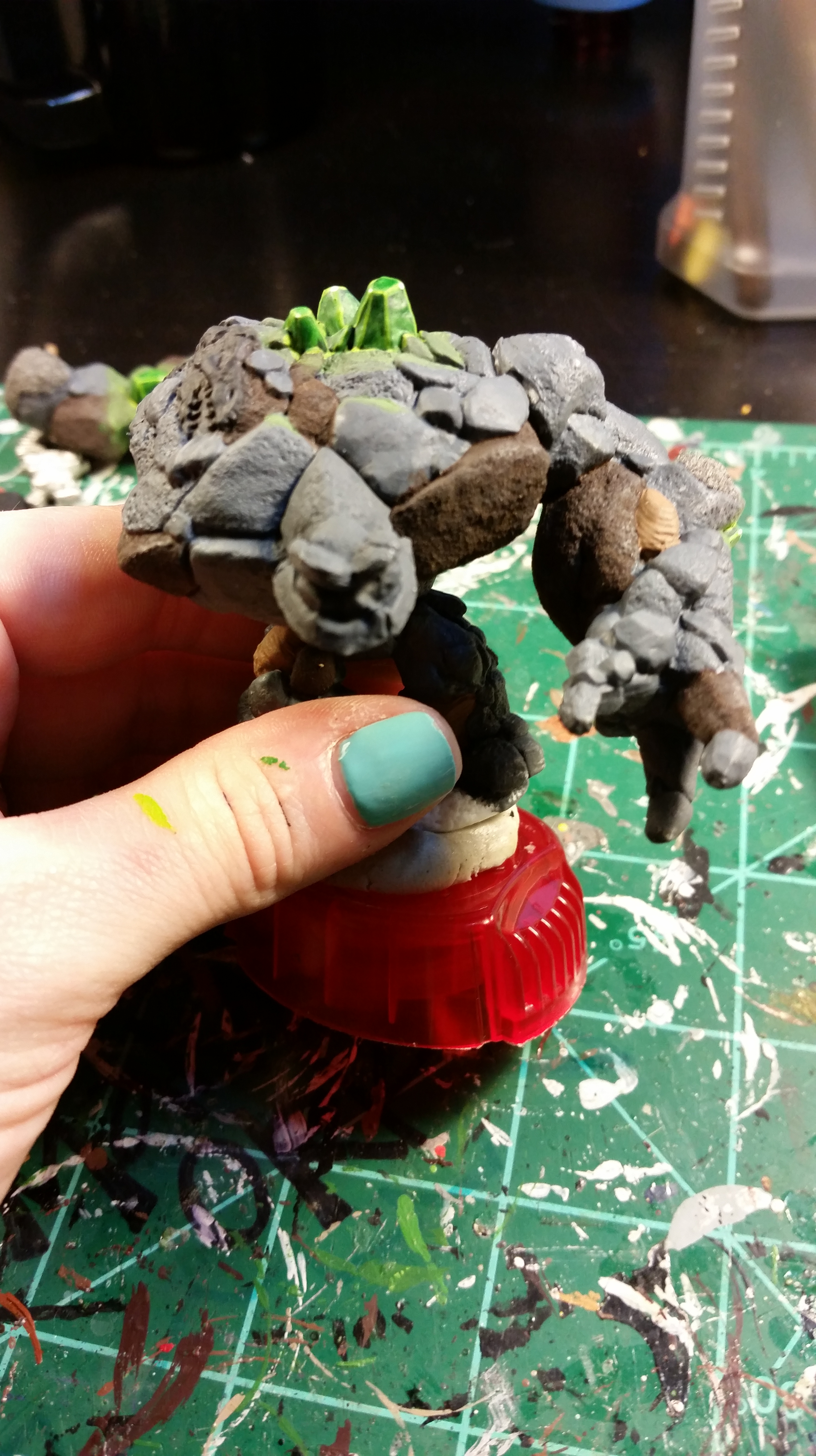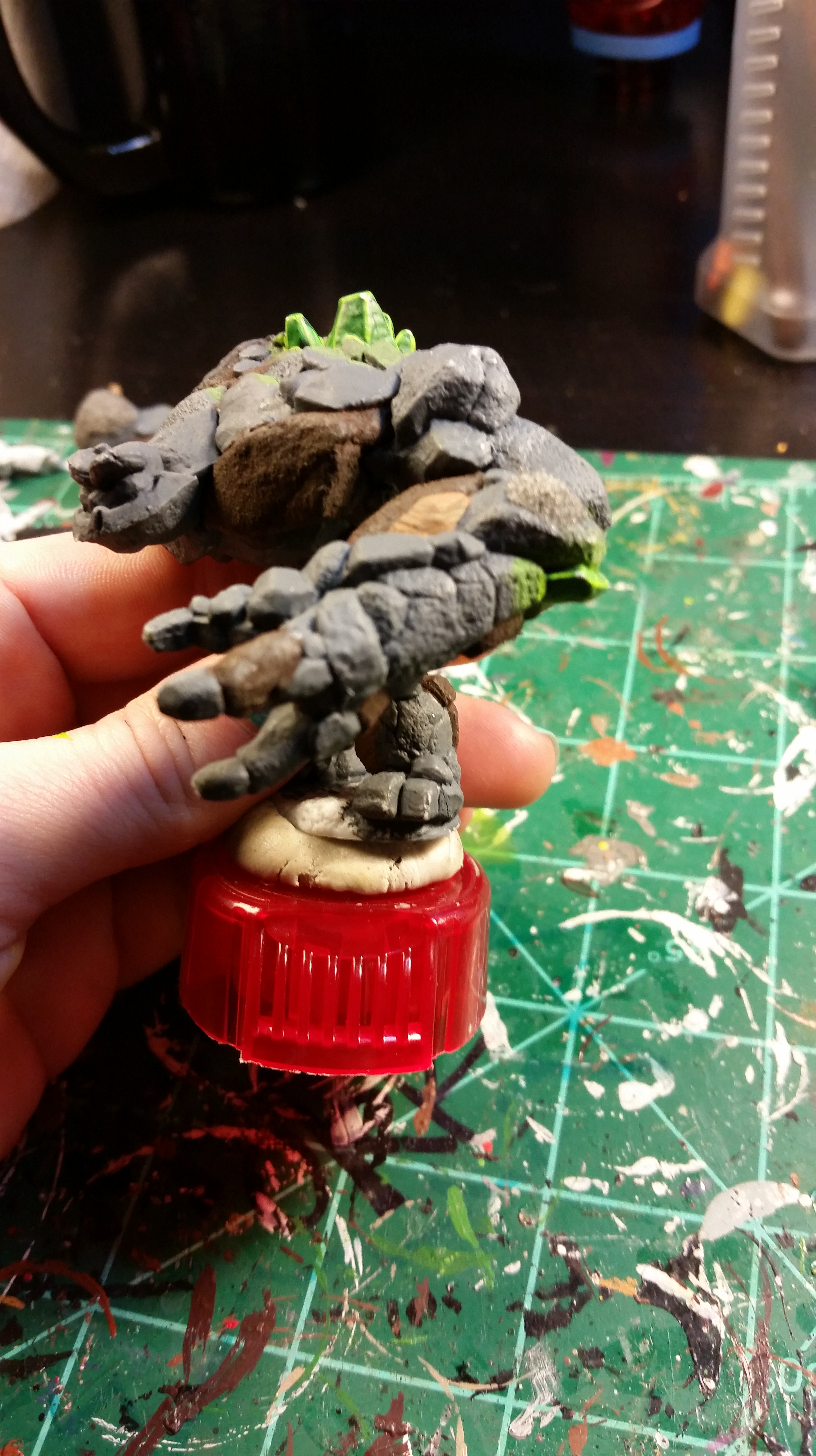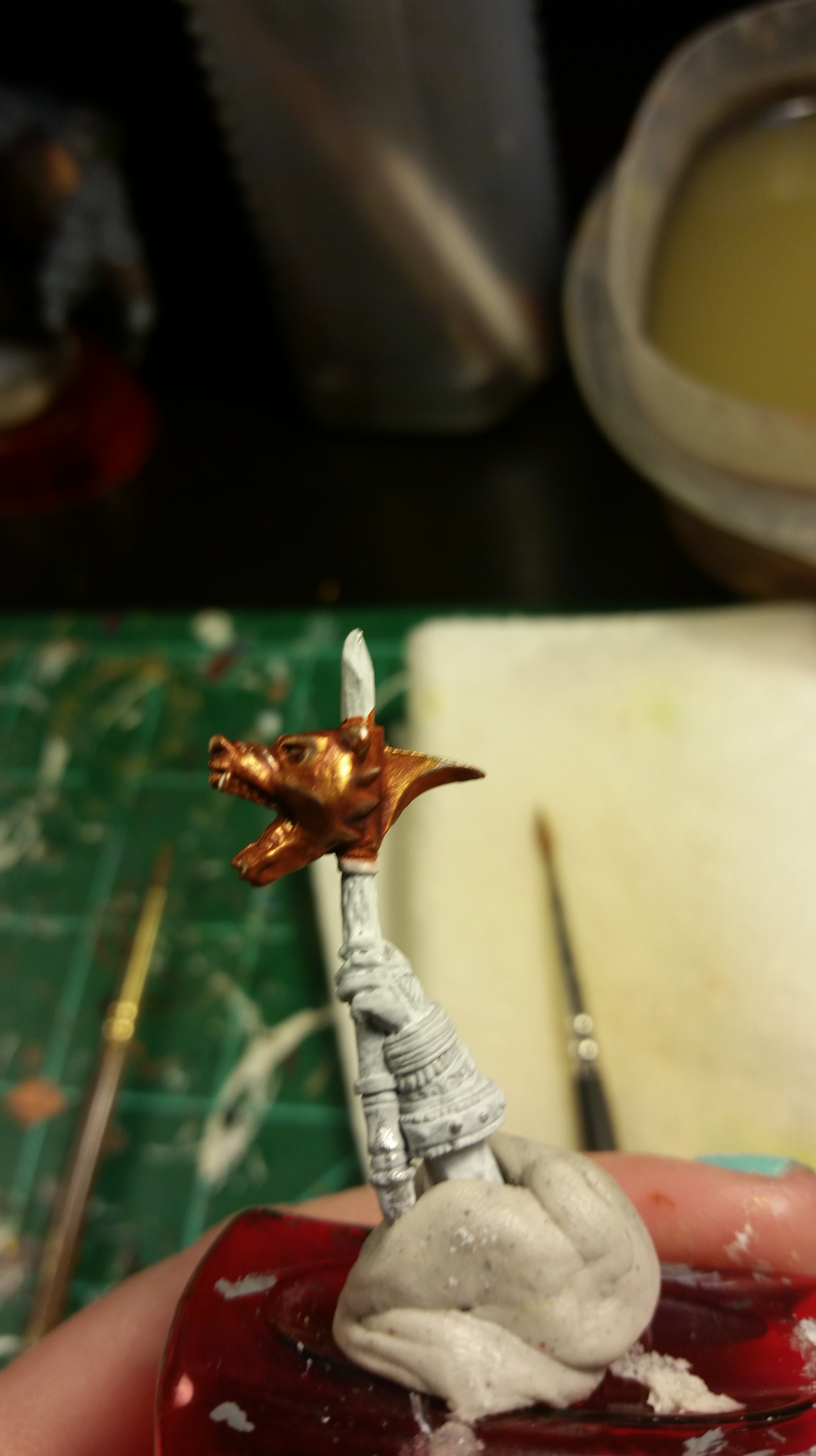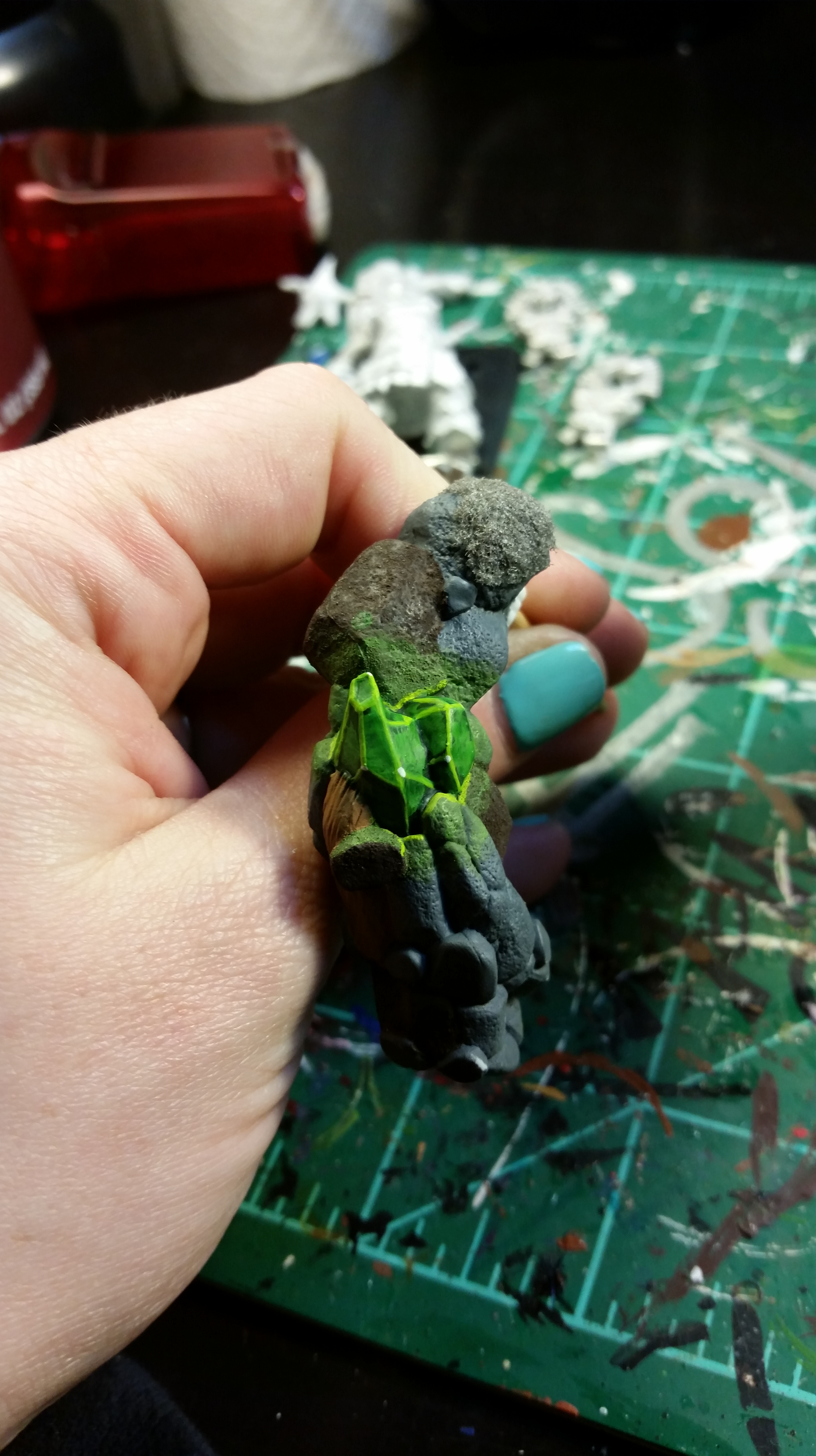 So, today I started a few new things. I got to cracking on my diorama for Reapercon, and discovered that my beautiful, beautiful Skadi was cracked. 😦 On the plus side, I emailed Reaper, and within an hour they shipped me a new one!! So great! Also, that gave me a chance to paint on her without worrying about ruining the one I was going to submit! So, I started playing around with colors and jewels. This is her bear hammer… I think it turned out pretty cool. And it will be even better when I do it for real!