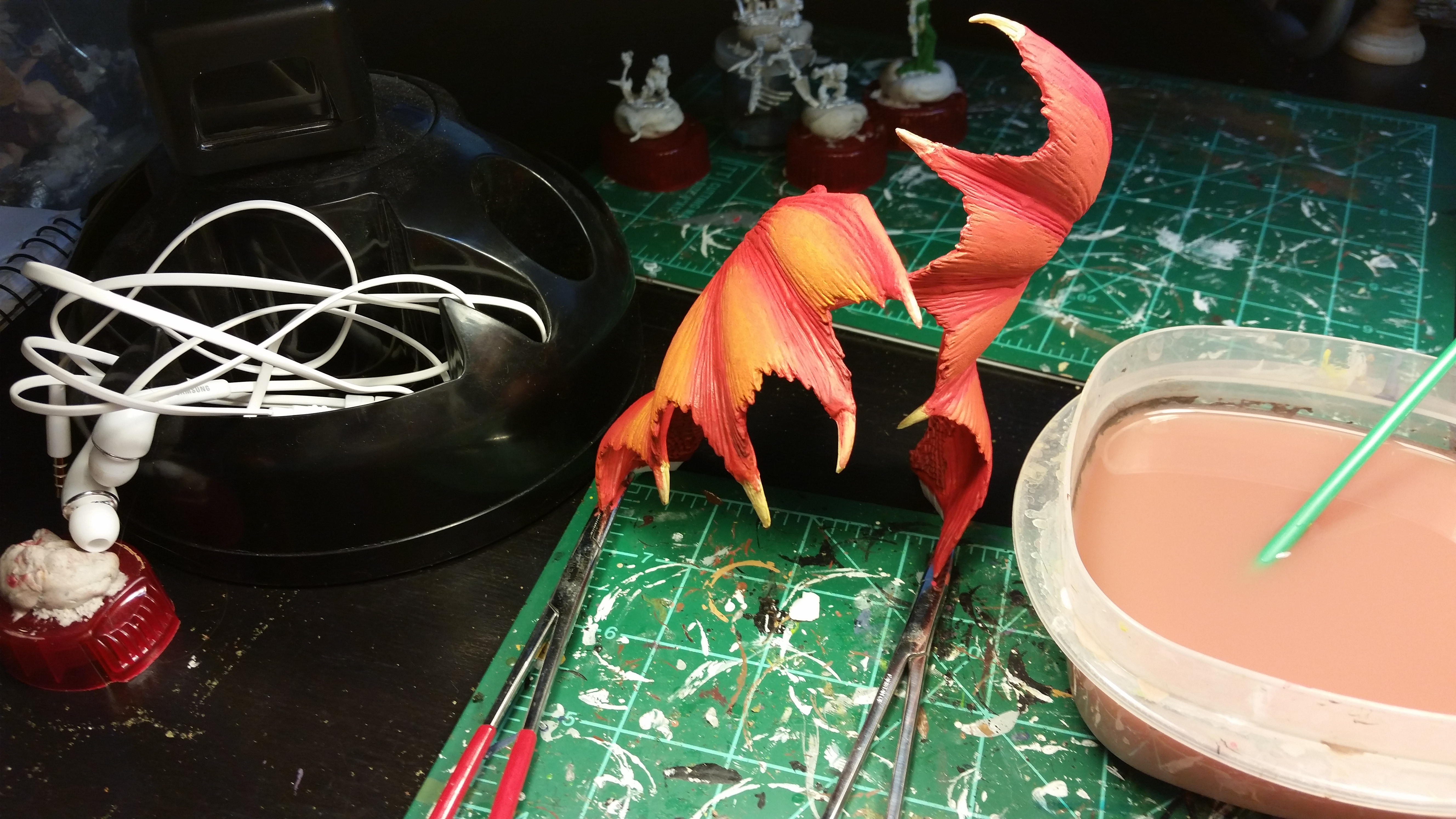 This is how the wings started. I held it up to the light so I could see where the light fell, and try to use that to do my highlights. I looked at bat wings, and the problem is, they don’t have a lot of contrast..ever. So I just kind of made it up. ๐