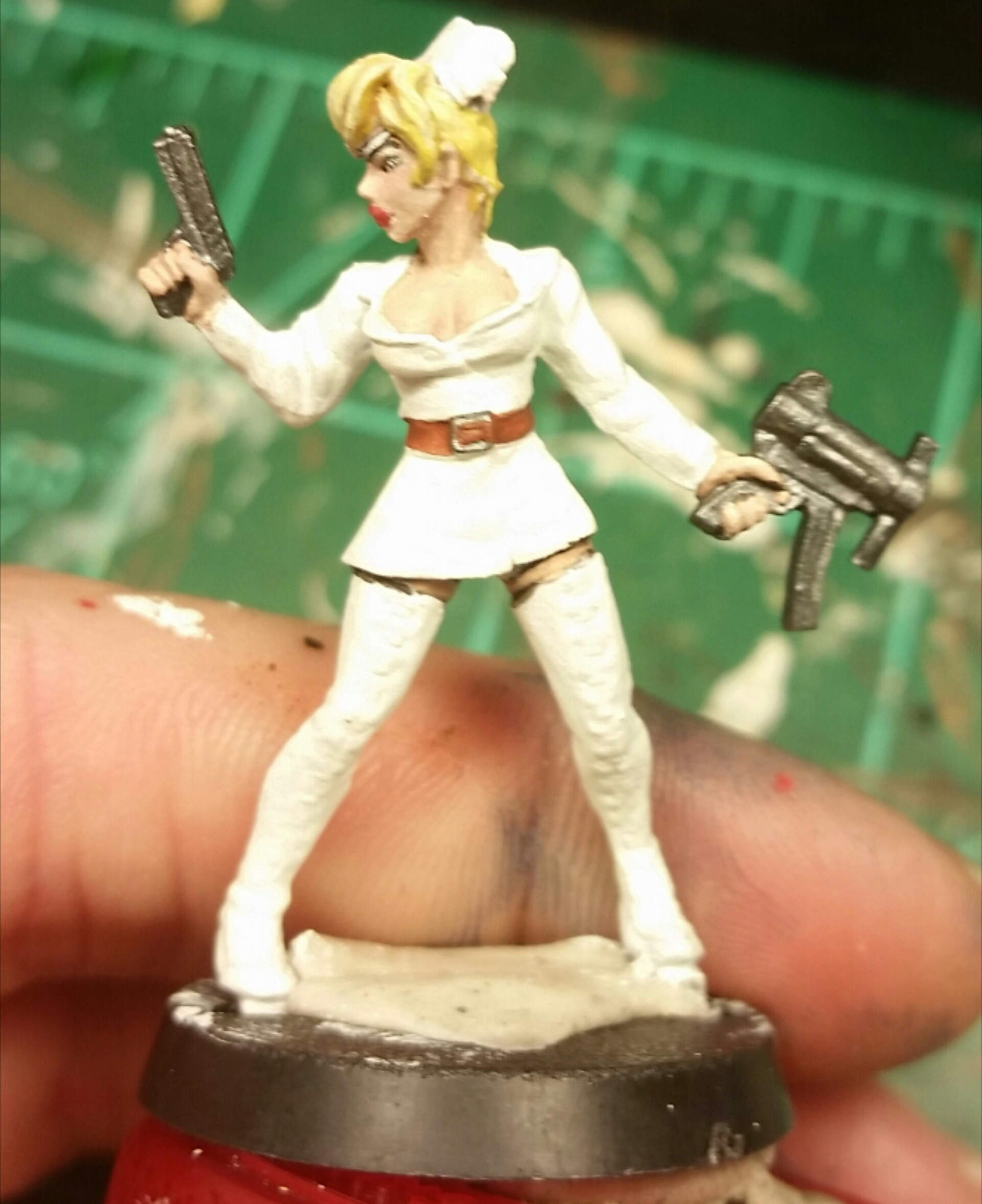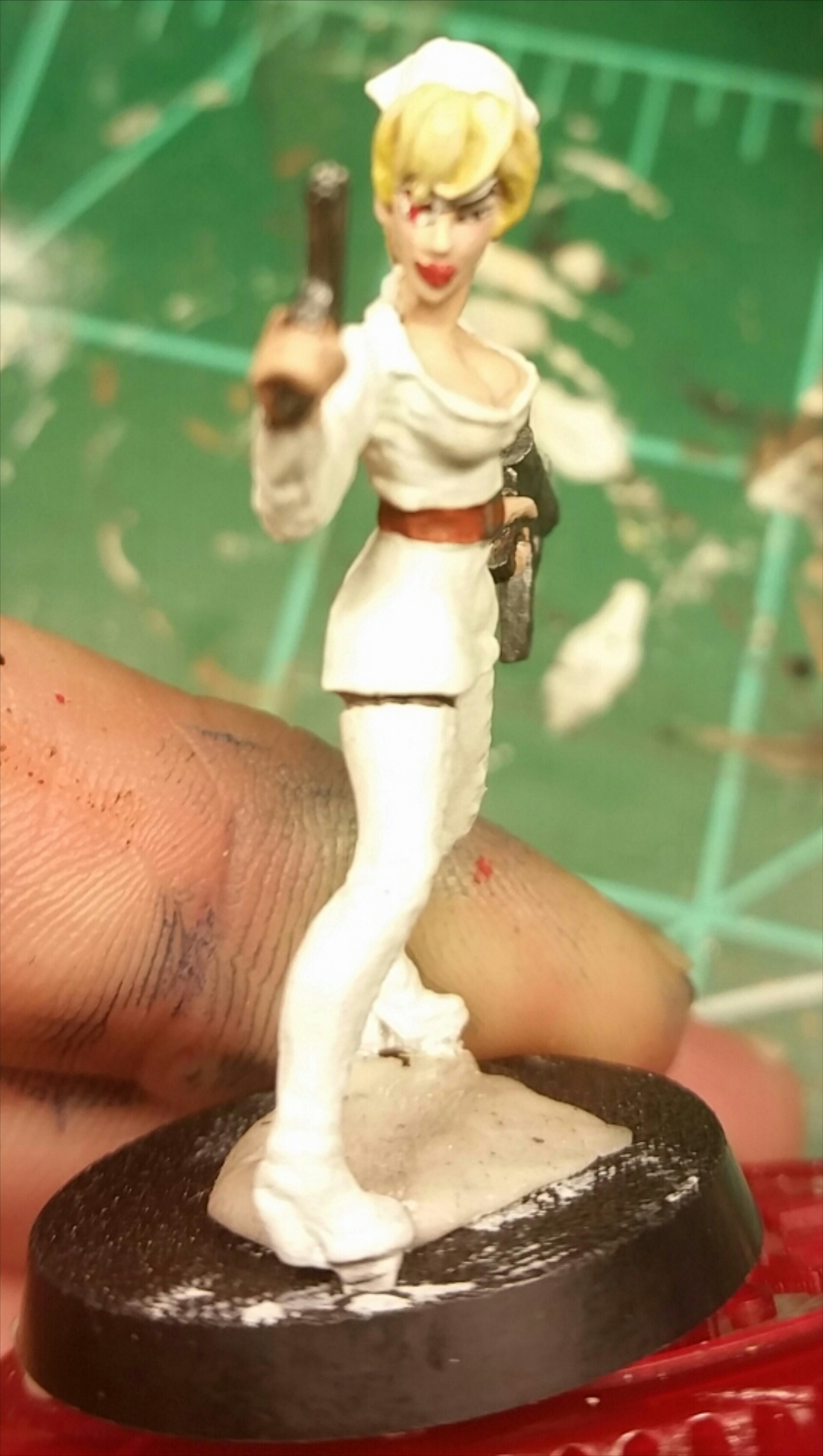 She’s obviously supposed to look like the nurse from Kill Bill. But I liked the fact that she looks a little alien. Her eyes were different sizes, so the eyepatch was an easy fix, and it made her other eye look reptilian. So then I gave her big gigantic lips (she kind of looks like Leelah from futurama to me now…) to emphasize that. I like the idea of a futuristic nurse in an old school getup.