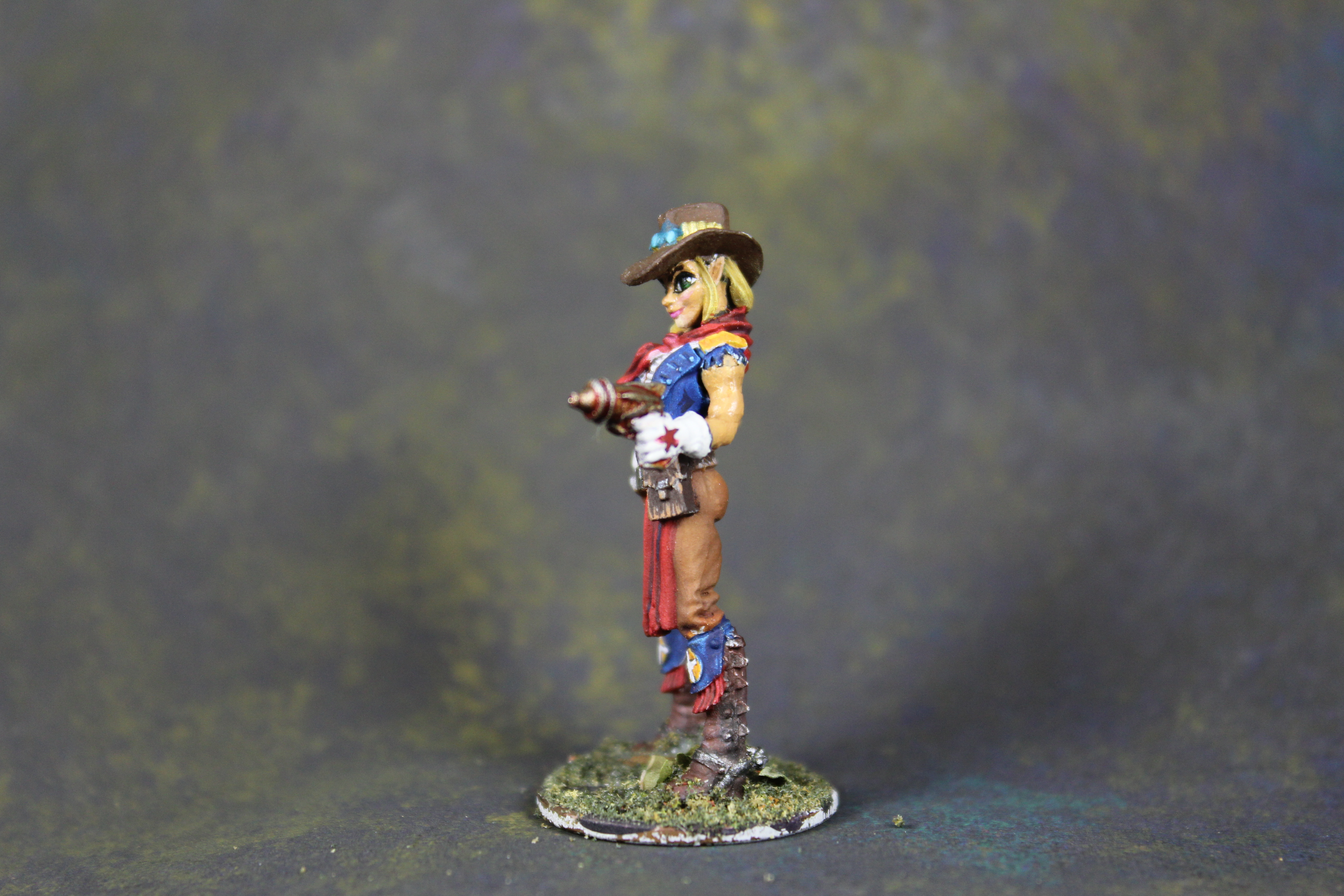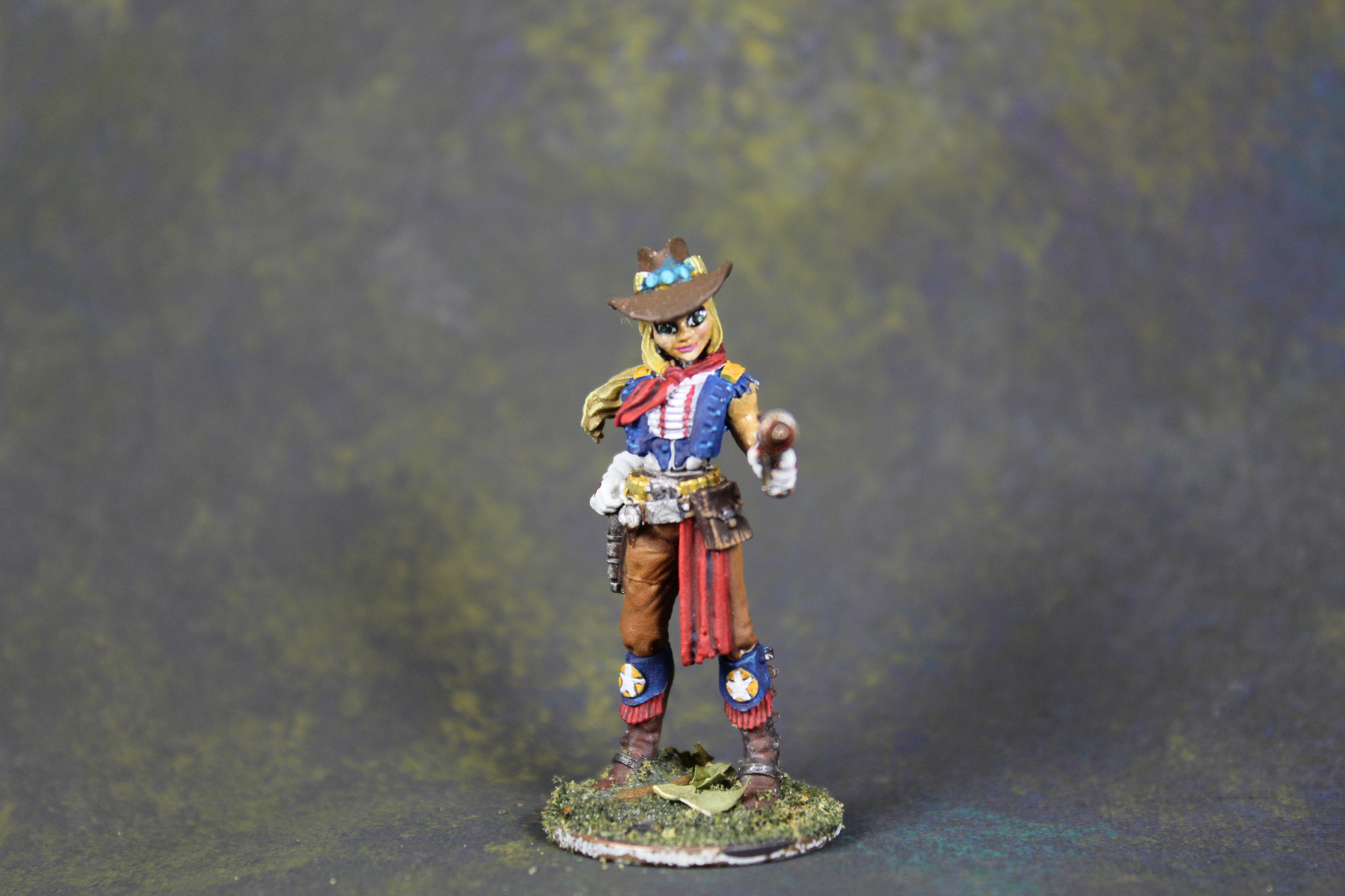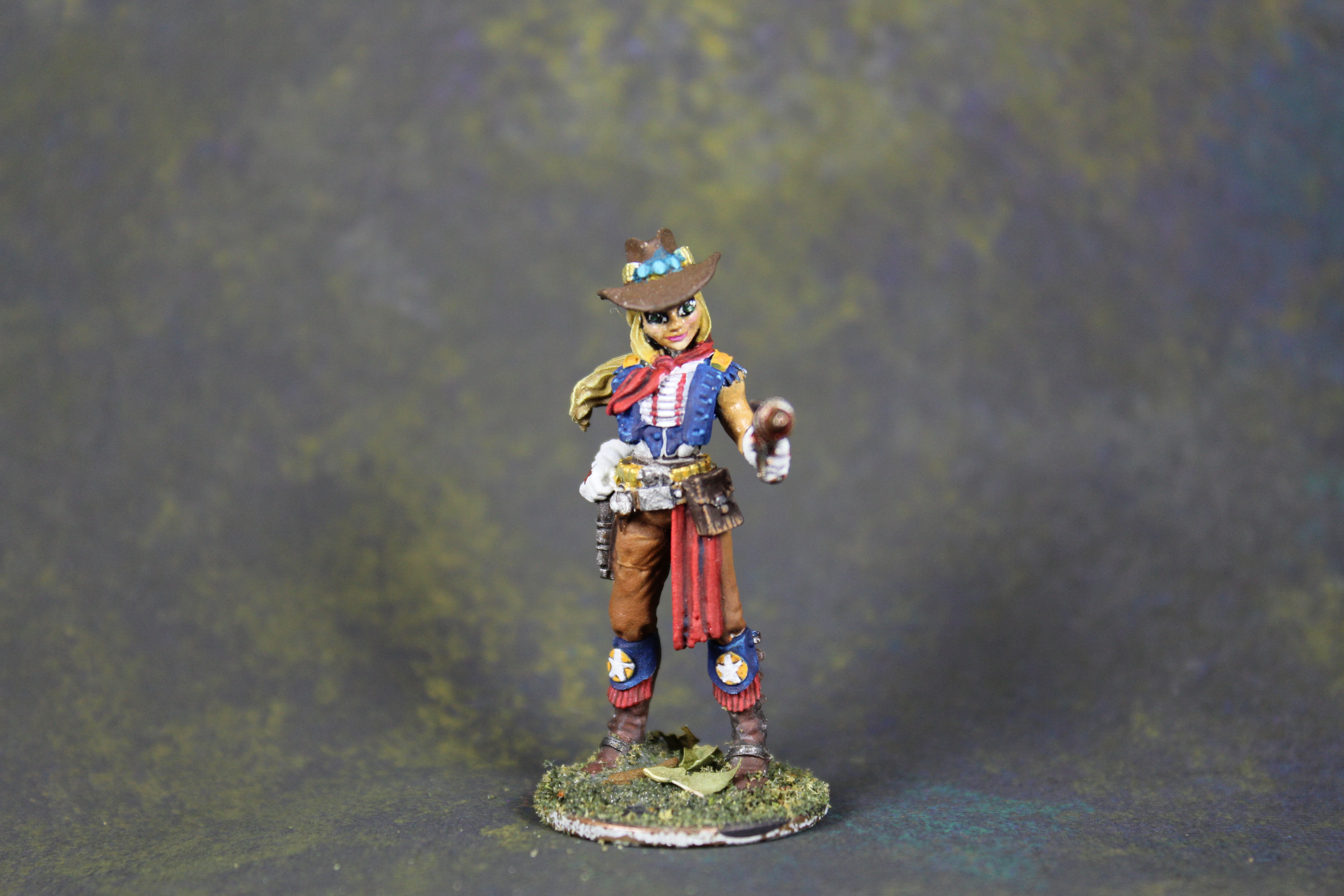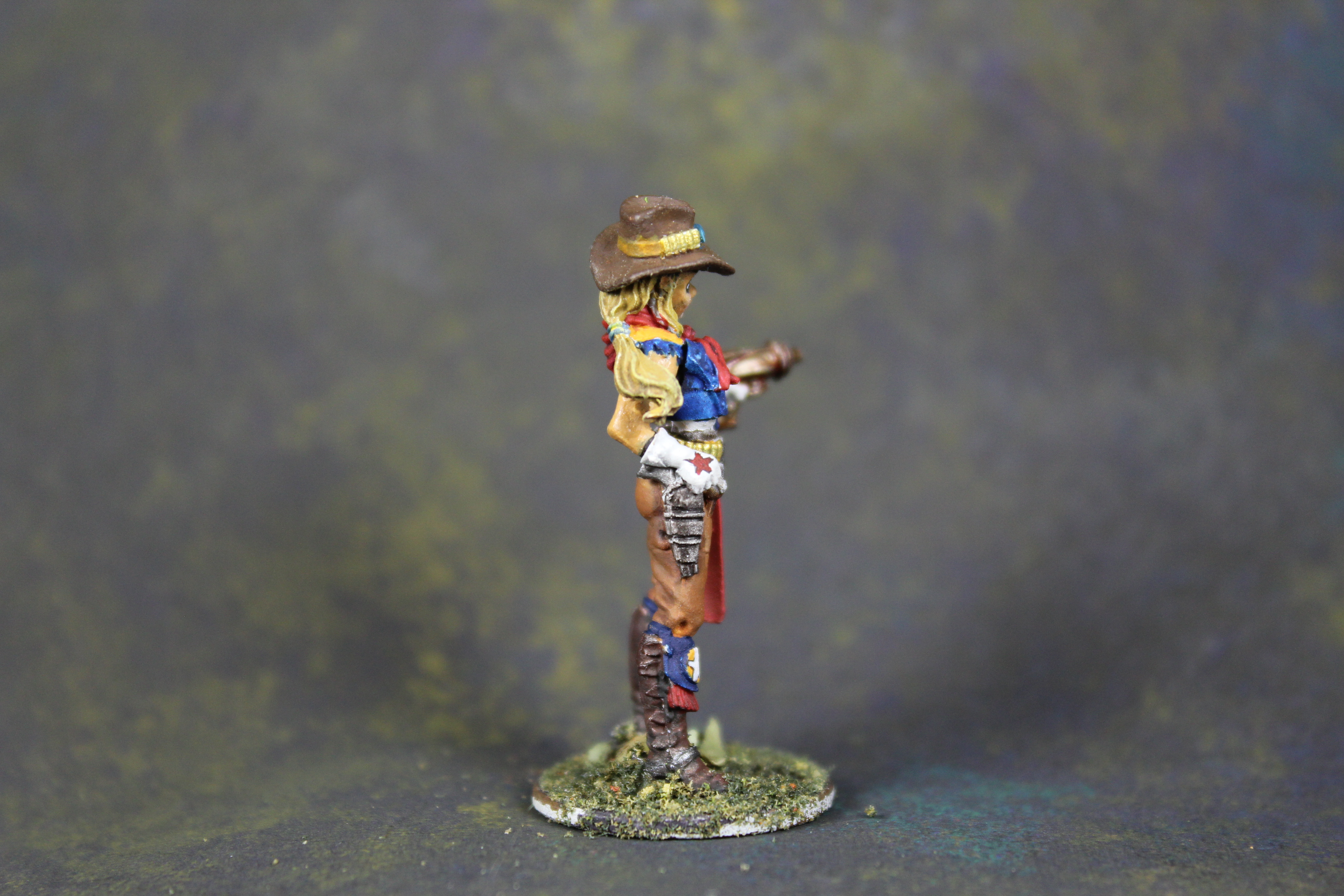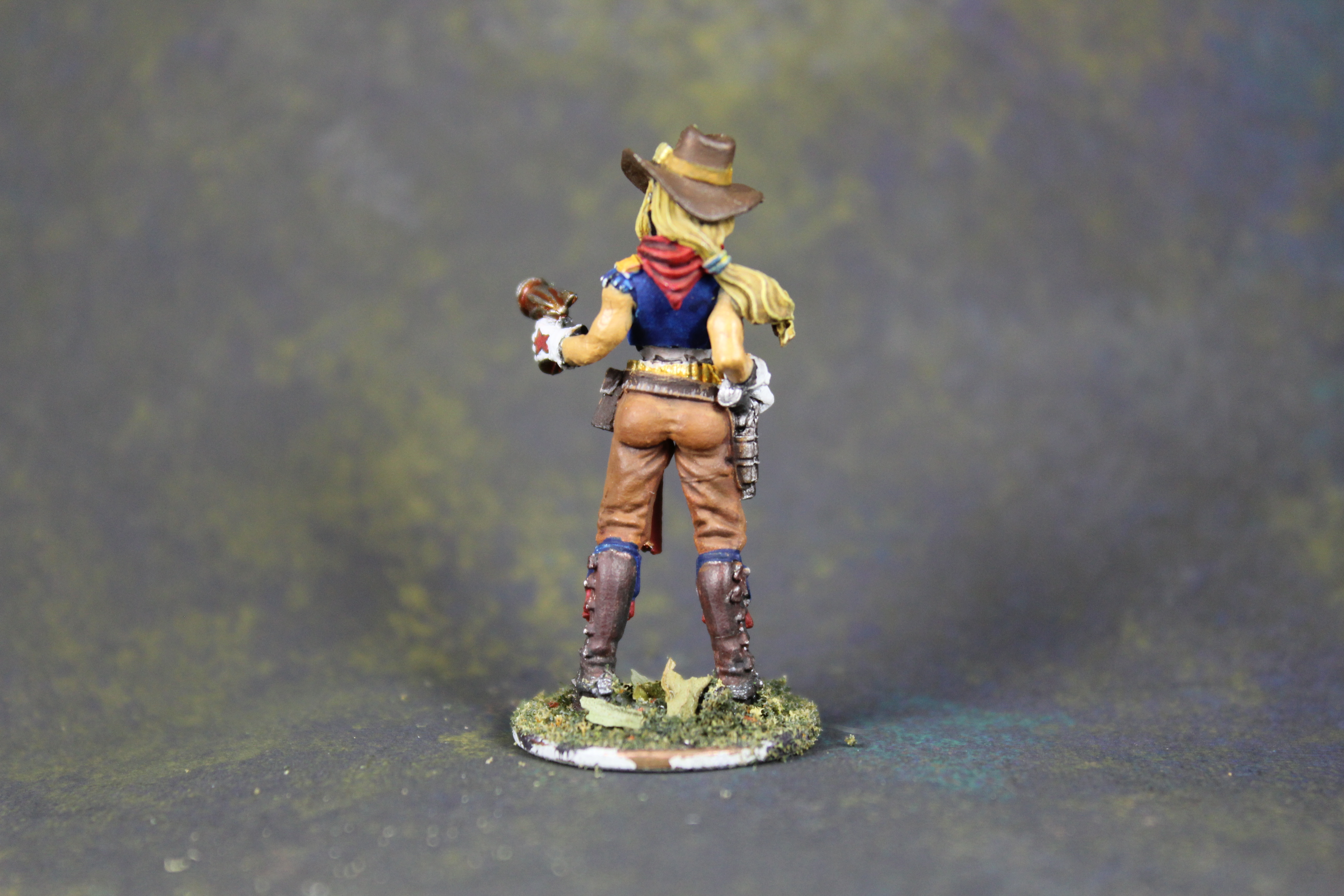 I finished this girl up the other day. She was our group paint for the box o’ goodwill. When I got her out to start painting on her, the Hubs saw her and loved her. He started planning to use her as the Sheriff for the Fallout game we’re playing, and I had to break the news to him that she wasn’t mine. Sad face. So I started looking around, and I couldn’t figure out where she came from! I emailed Froggy to find out, and he didn’t know either. He told me that as long as I finished her and sent him pictures, we could keep her! So I did! I love the Texas Ranger/ County Fair look she ended up having.