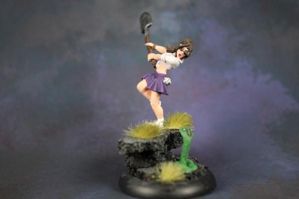 So, I got a bombshell babe from the melt table at Reapercon, and I decided to paint her up yesterday! She looked like a lot of fun to paint, and I want to work on blending anyways. She’s not the best job I’ve ever done, but I think I’m making progress. Once I was done painting her, I realized she needed something to be hitting with the shovel! So I dug through my familiar bag looking for something suitable. She’s billed as a zombie hunter, but I wasn’t in the mood to paint a zombie. So I found a little snake! Then it just got funnier. π