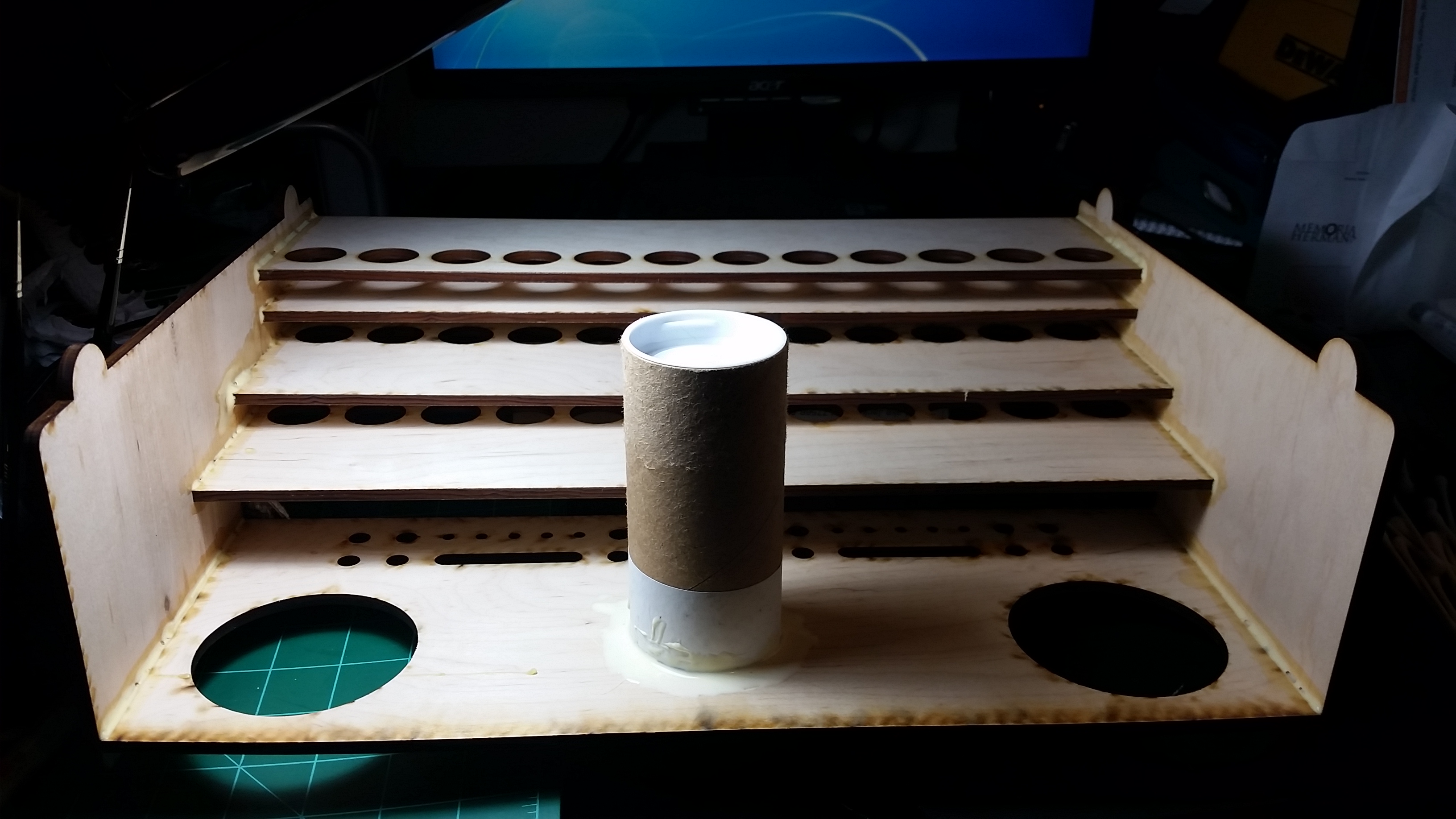 The basic rack gave me a bit more of a headache… First off, I feel like it was a little misleading to say it just snaps together and then you’re off… There was no way this was staying together without a significant amount of glue, and things to hold it in place while it dried. Also, you have to do one side, then the other so it will stay together. But, after that, it worked great. There was no way the top shelf was going to support my monitor by itself, so I found a handy little shipping roll that my hangar 18 backdrops came in, and hey presto! It worked! Overall, I’m very pleased with them. 🙂