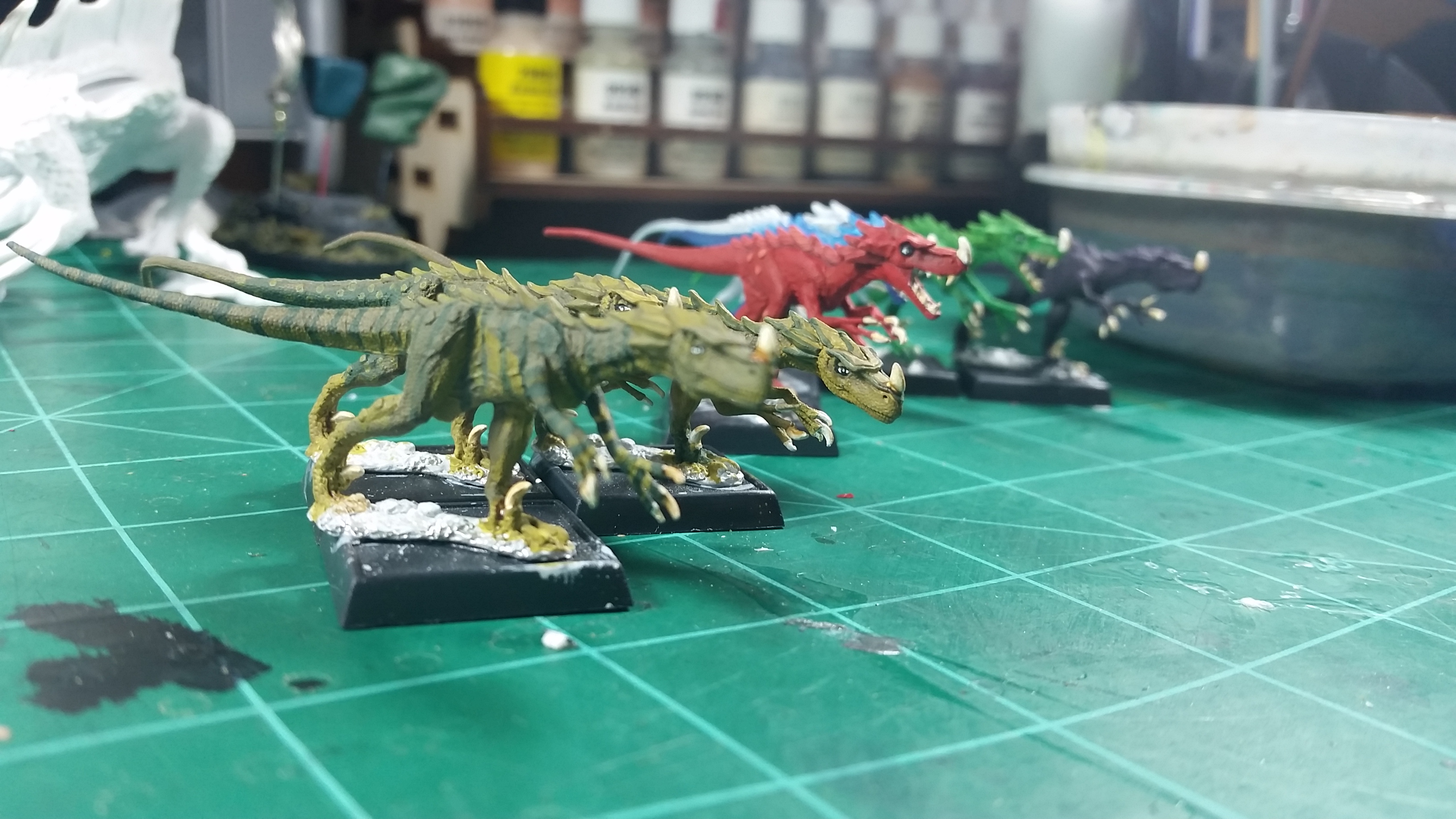 Then I had to do something to differentiate them on the game table. The worst thing ever is this conversation, “I hit the green one.” “Which green one?” “THAT green one. The one on the left.” “Which left?!” So yeah, I ended up with Stripe, Spot, and the Other One. (I am really bad at taking WIP pictures….)