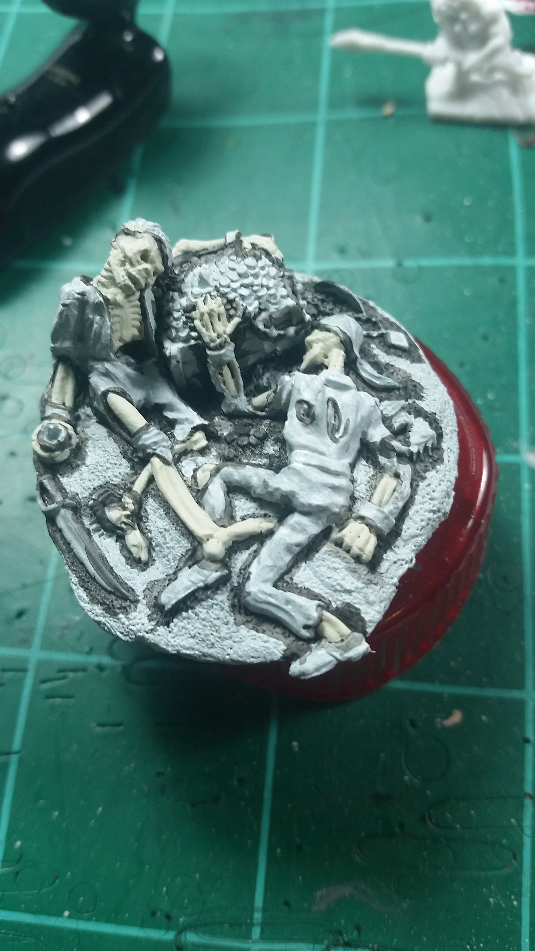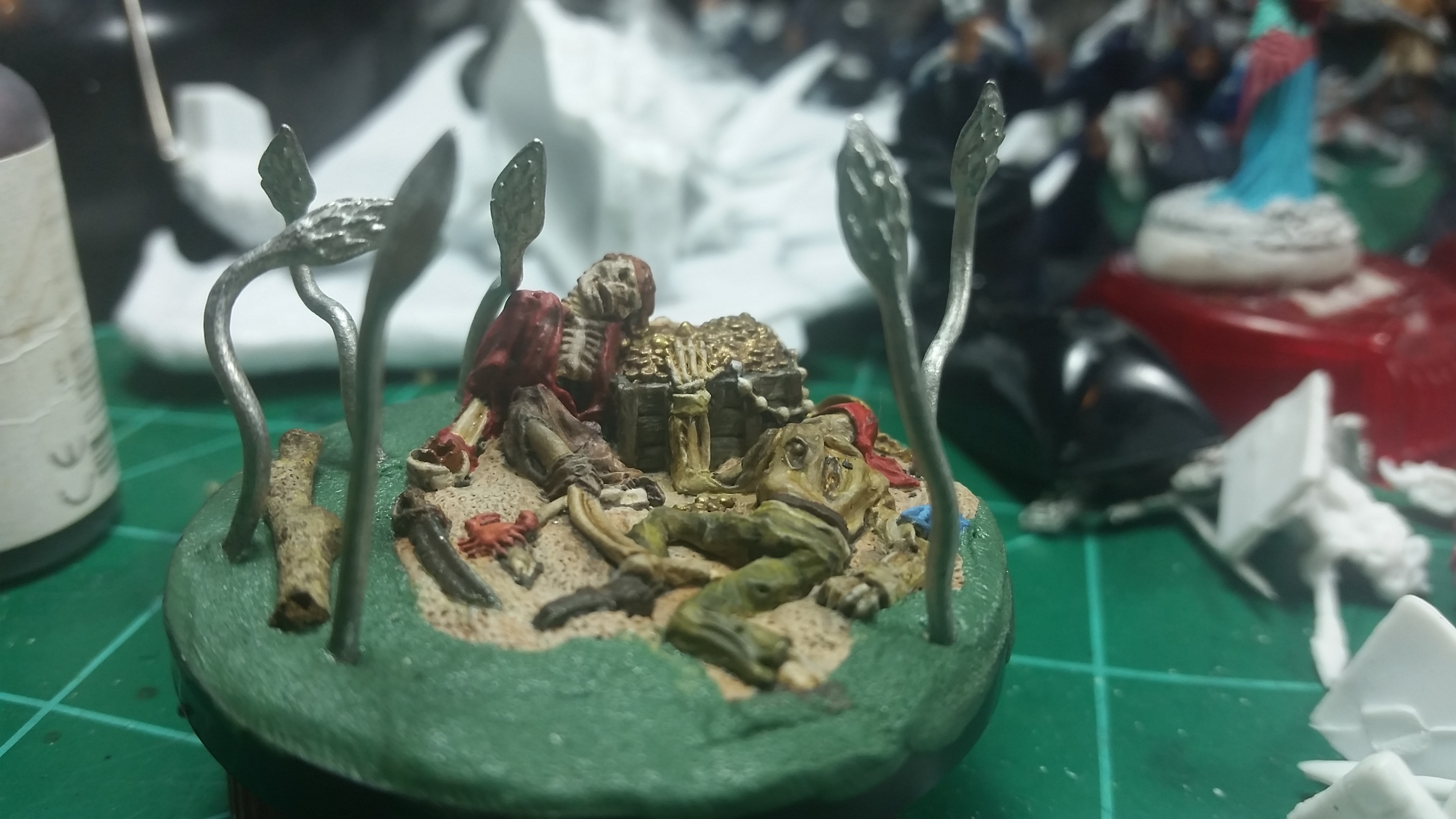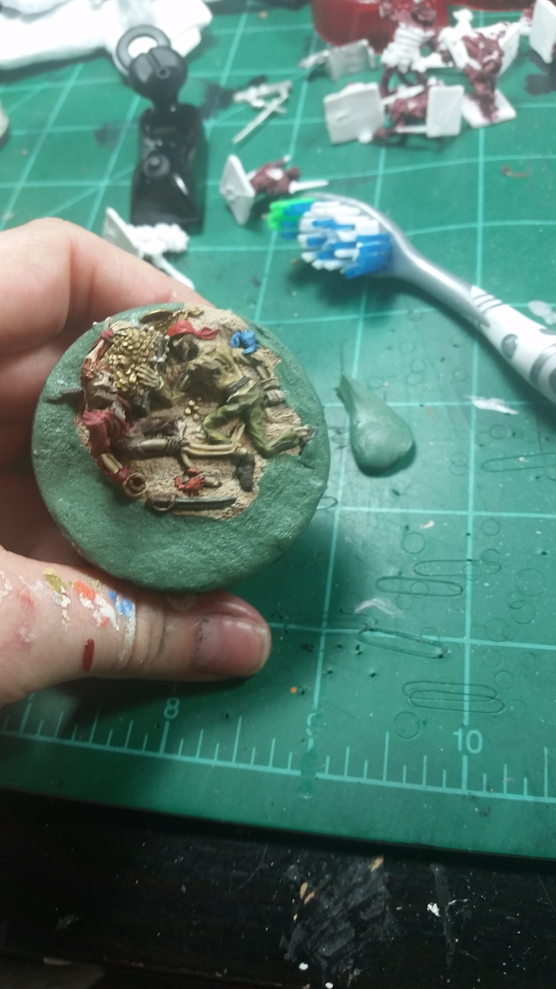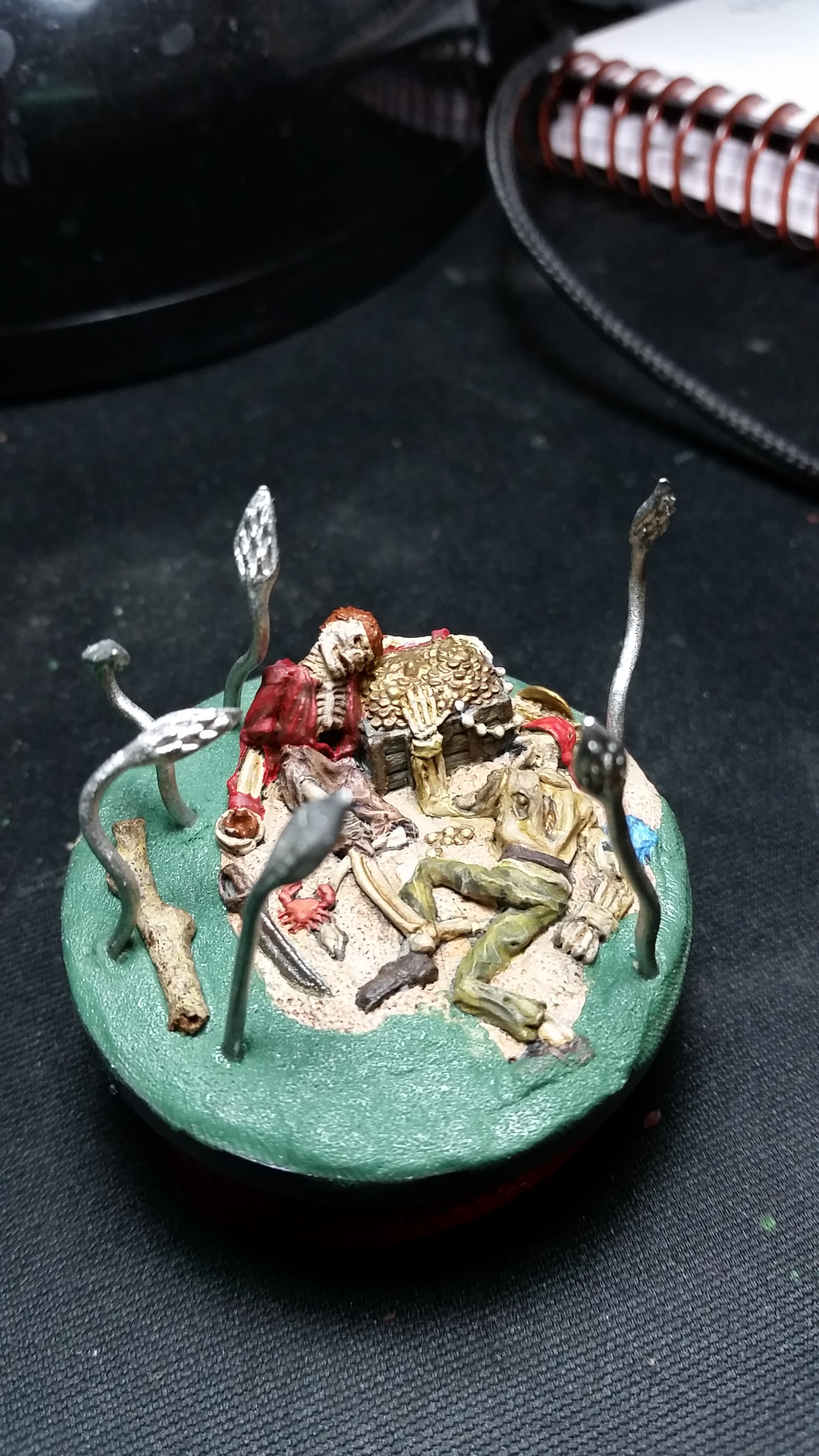 IMG_0428 IMG_0426 IMG_0431 IMG_0429Before I did them, I worked on that vignette. It is called “Dead Man’s Chest”. But, after painting it all up, I realized that it was too big for a medium base, and too small for a large base. So, I would have to do some sculpting if I wanted it to be anything other than just stuck on there… So I did!! I think it turned out pretty nice! It’s not done yet, but I envision it being fairly epic. 🙂 WIP pictures to follow.
