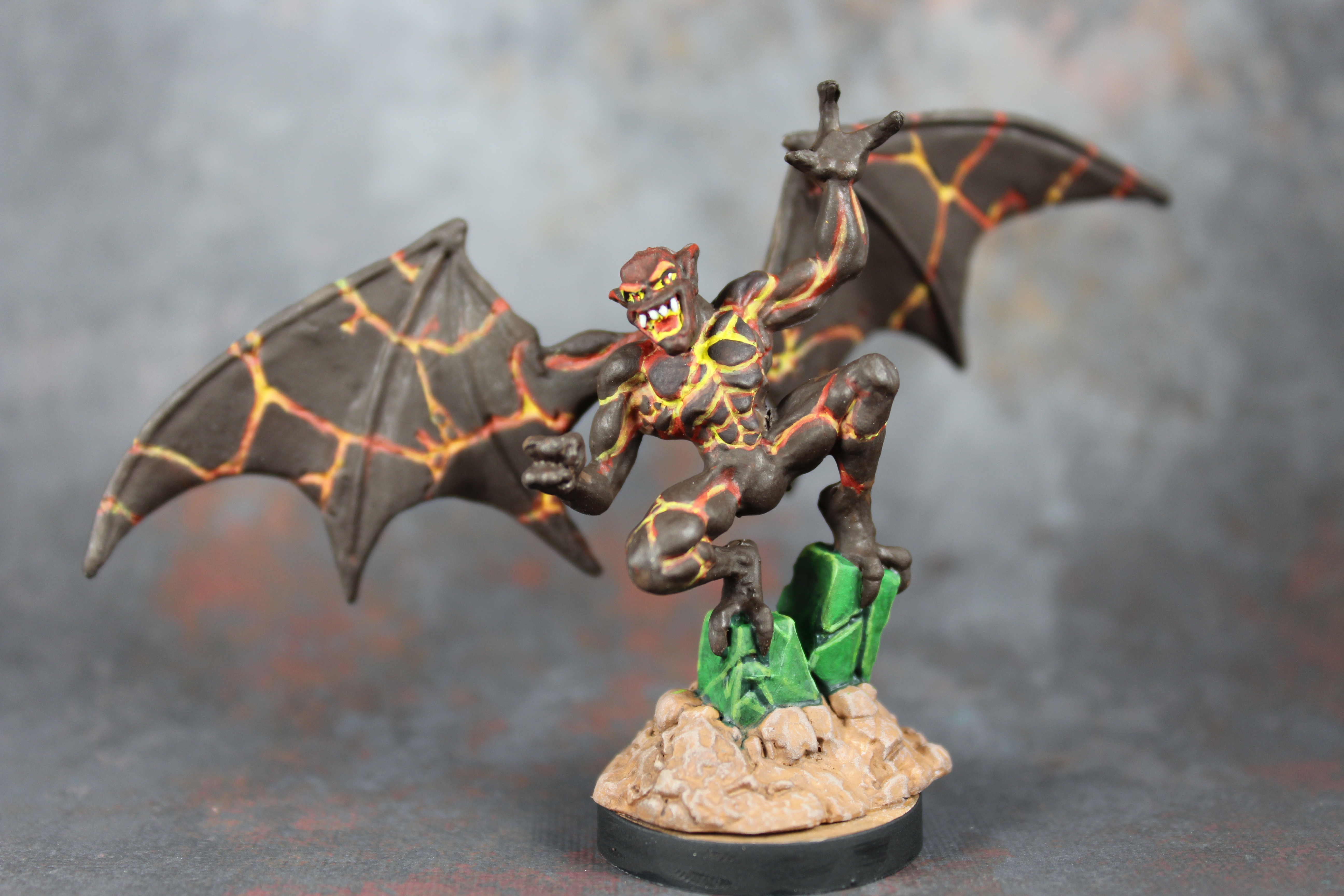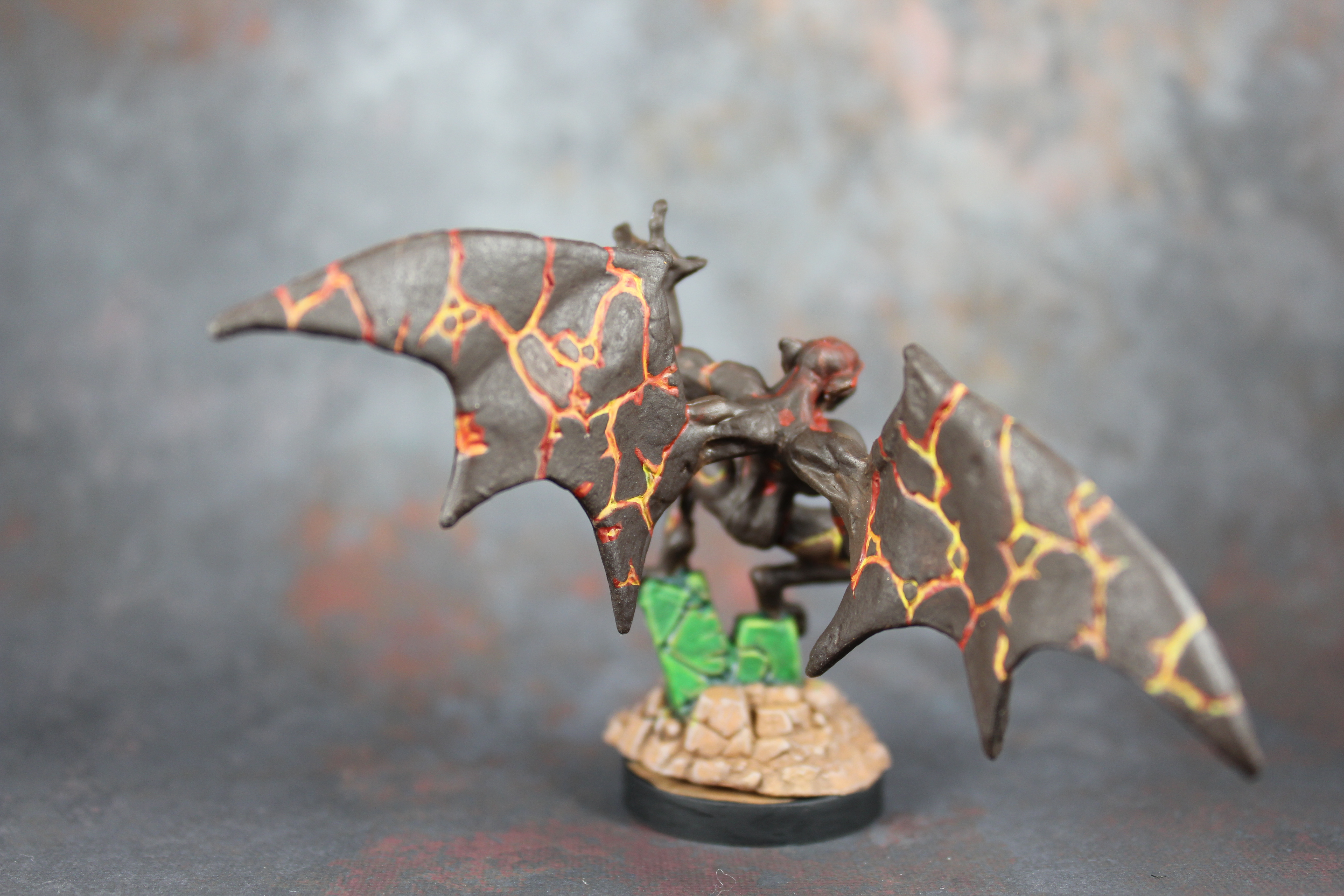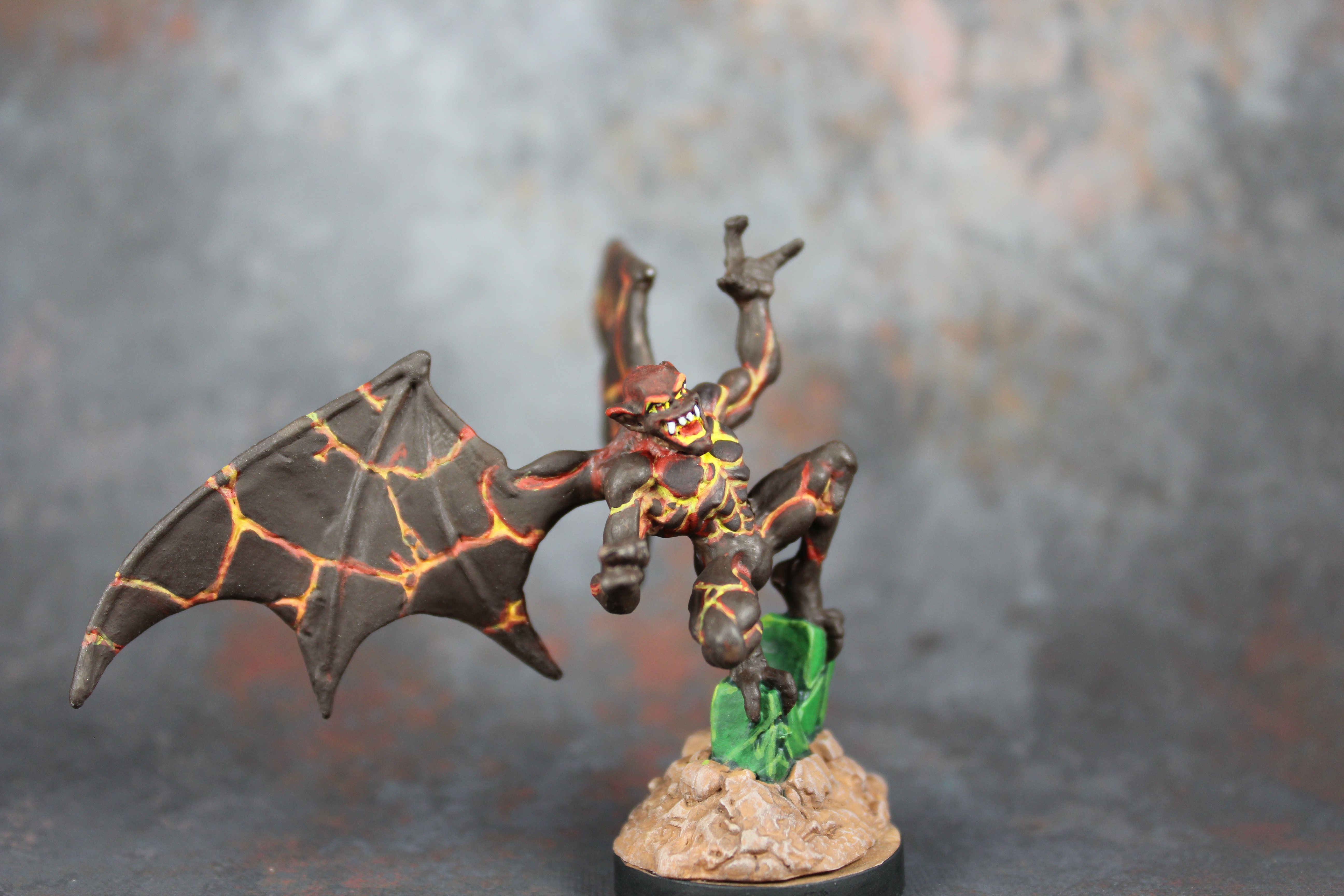 This is Pop, one of Kos’ 3 mephits. The other 2 are flame mephits, and I’ll be painting them with red flames and blue (think butane) flames. They should be cool. This guy was actually a lot of fun to paint. It was interesting though, because I wanted it to look like lava, I had to do my highlights all backwards… Painting bright colors in the ‘shadow’ areas was not easy. 🙂