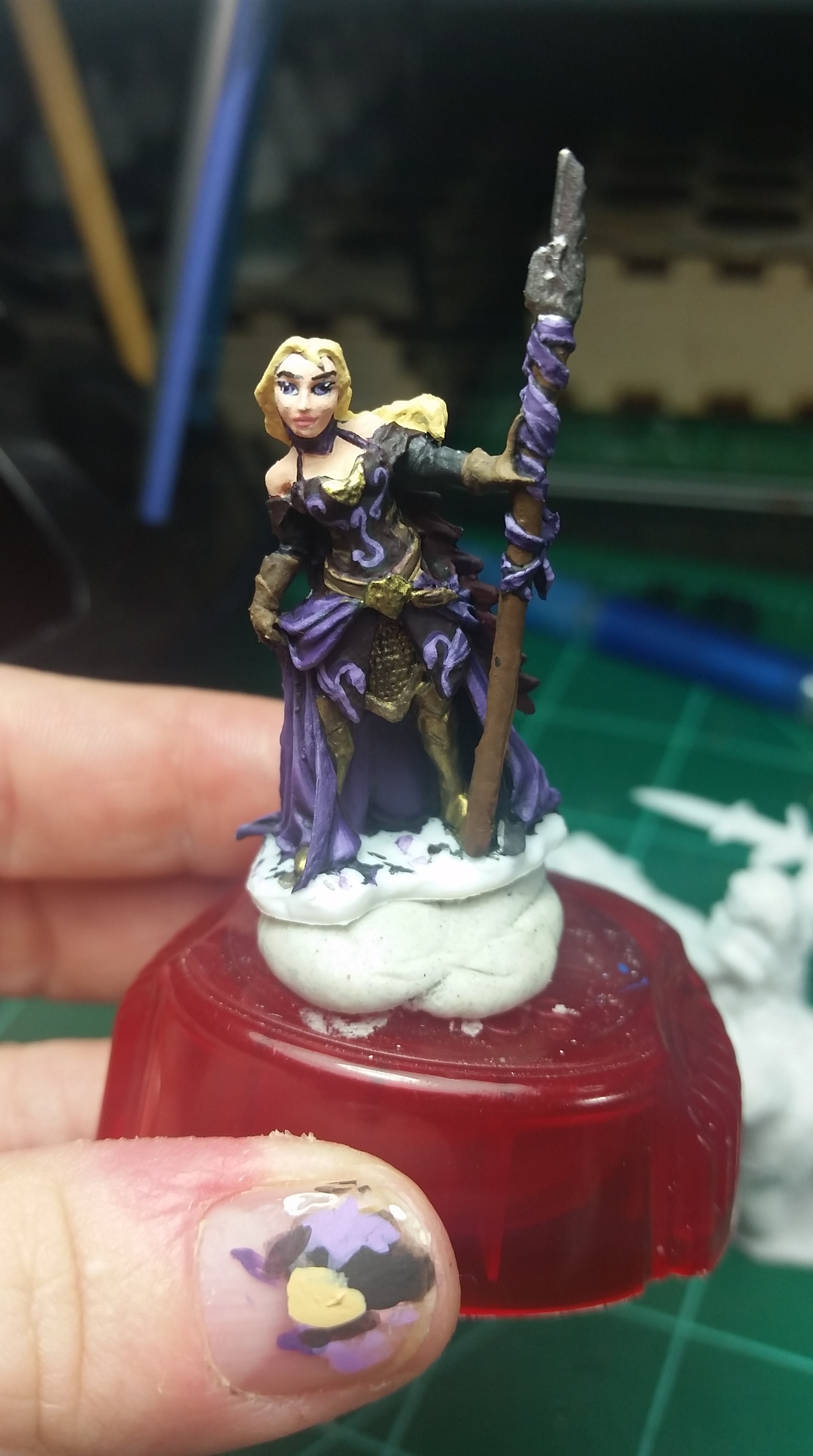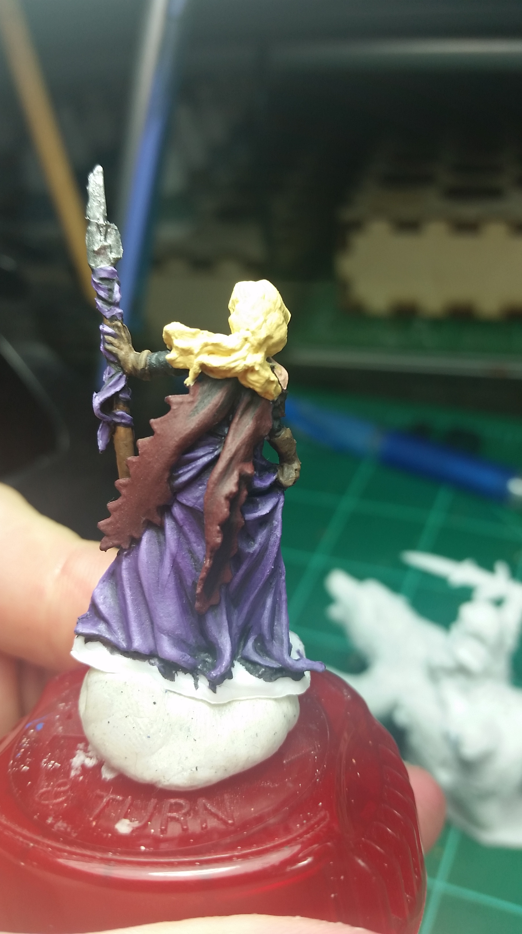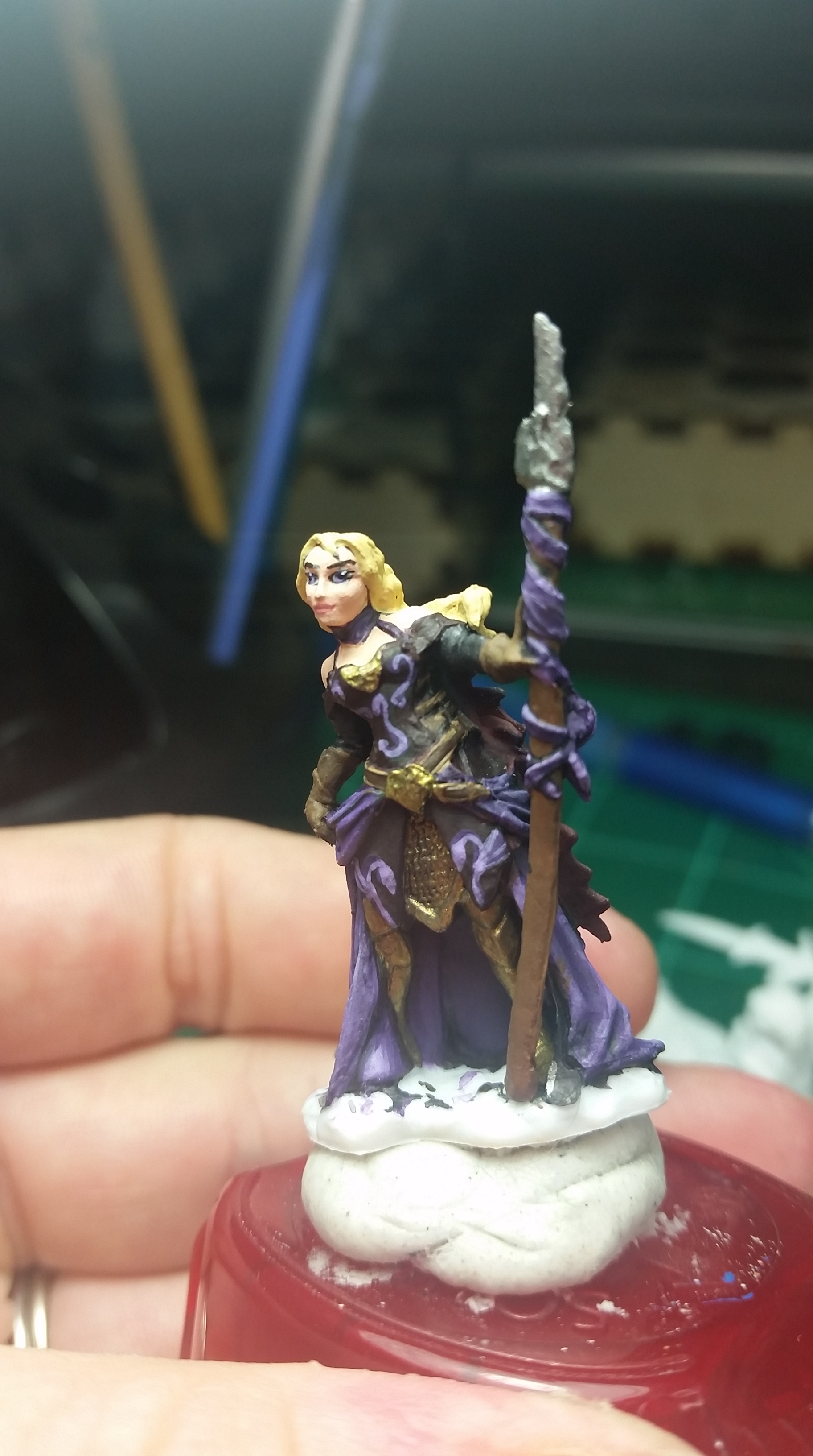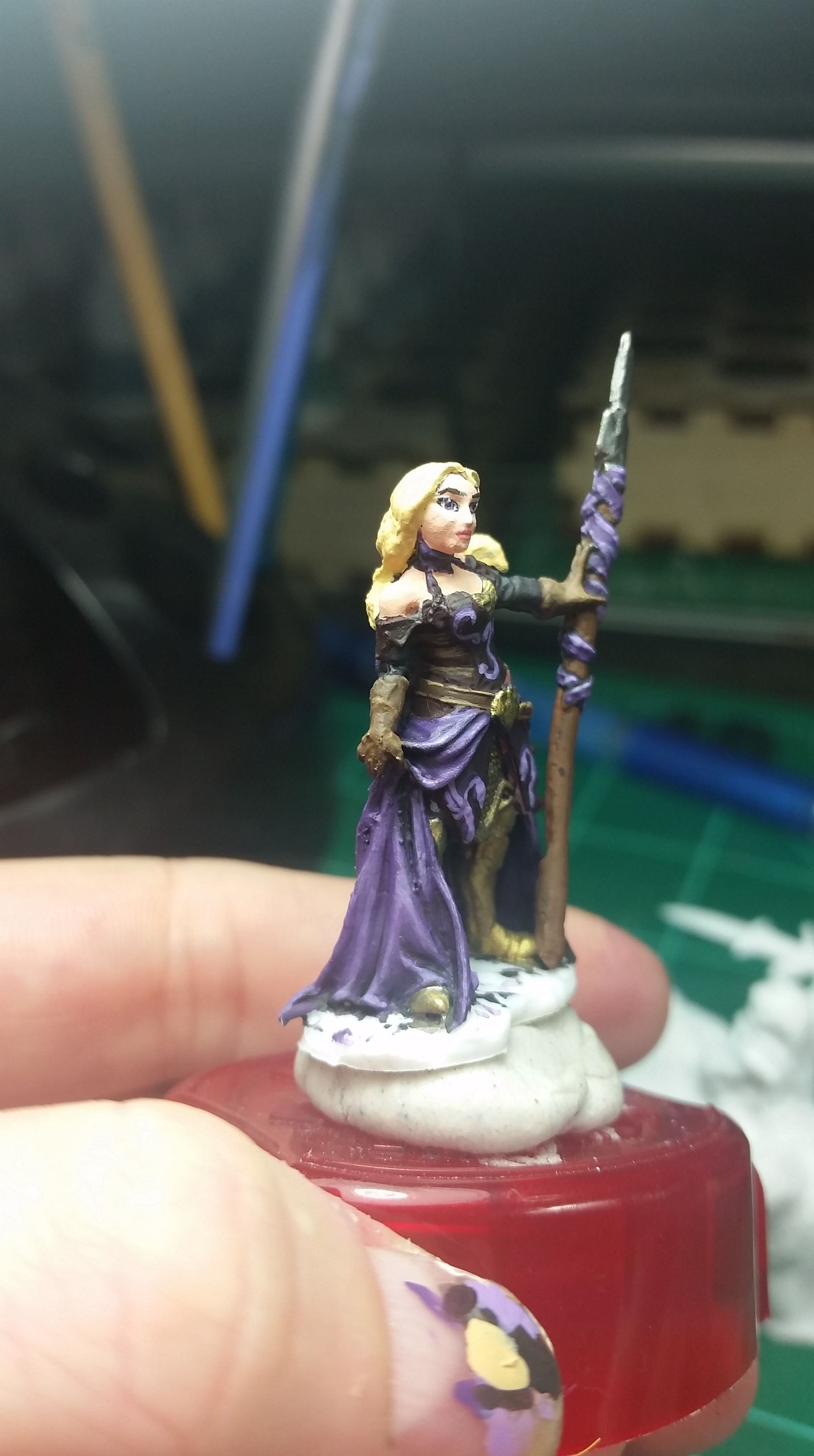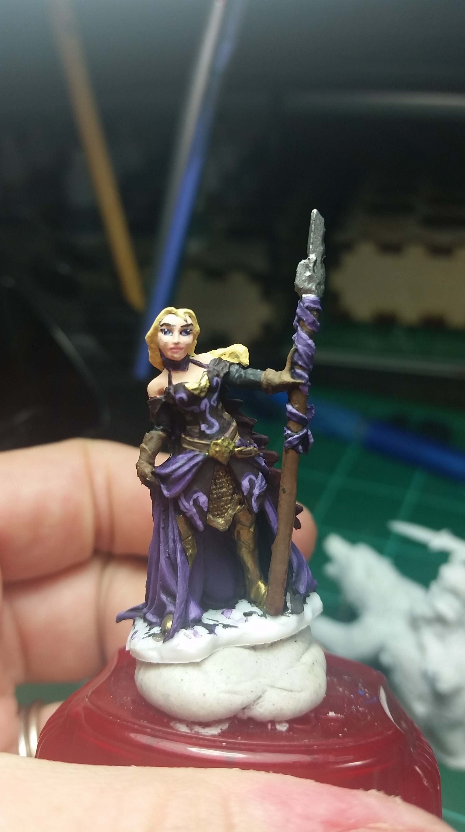 Also, I’ll change her from a blonde to a brunette. The really important part was to have her wearing purple and holding a halberd-y thing. She is fun, but I have the other 3 hordes of minis to paint hanging over my head…. bleh.