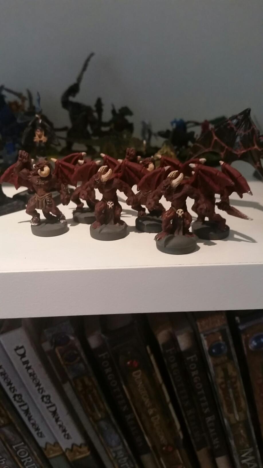 So, all of those except for a few prepaints (like Big Red up there) have been painted by me throughout the last decade. I’m gonna have to rearrange when we get Tianot, because he and Big Red are gonna have to have place of pride on that first shelf.