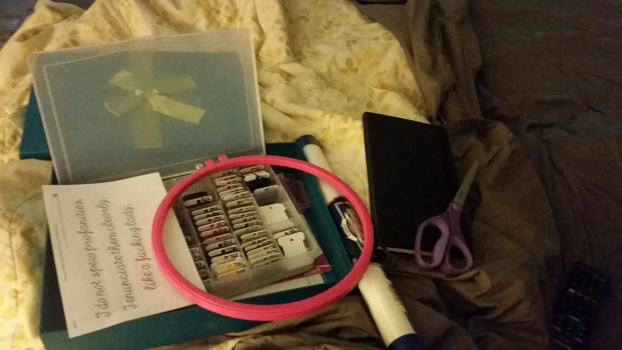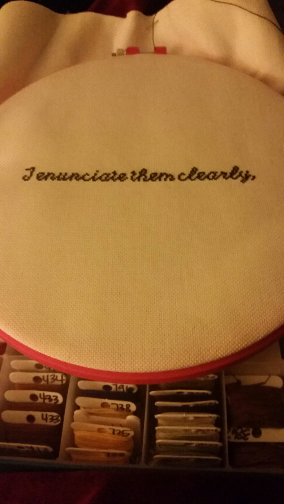So, since I’m too fatigued to sit at my desk, I decided to start on another project that I need to work on. My friend has a friend that is turning 40 this year, and she wanted me to make her a fun, cross-stitched throw pillow! There’s a 3 line quote, but you have to start in the middle so it doesn’t end up all goofy. So, the line that’s done is the middle line of the phrase.