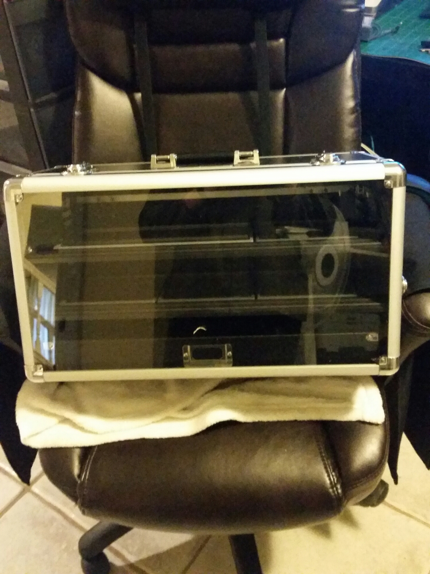 This is your scale picture. That’s a full sized office chair, and it fits snugly. I am a little concerned about the display front getting scratched, but such is life.