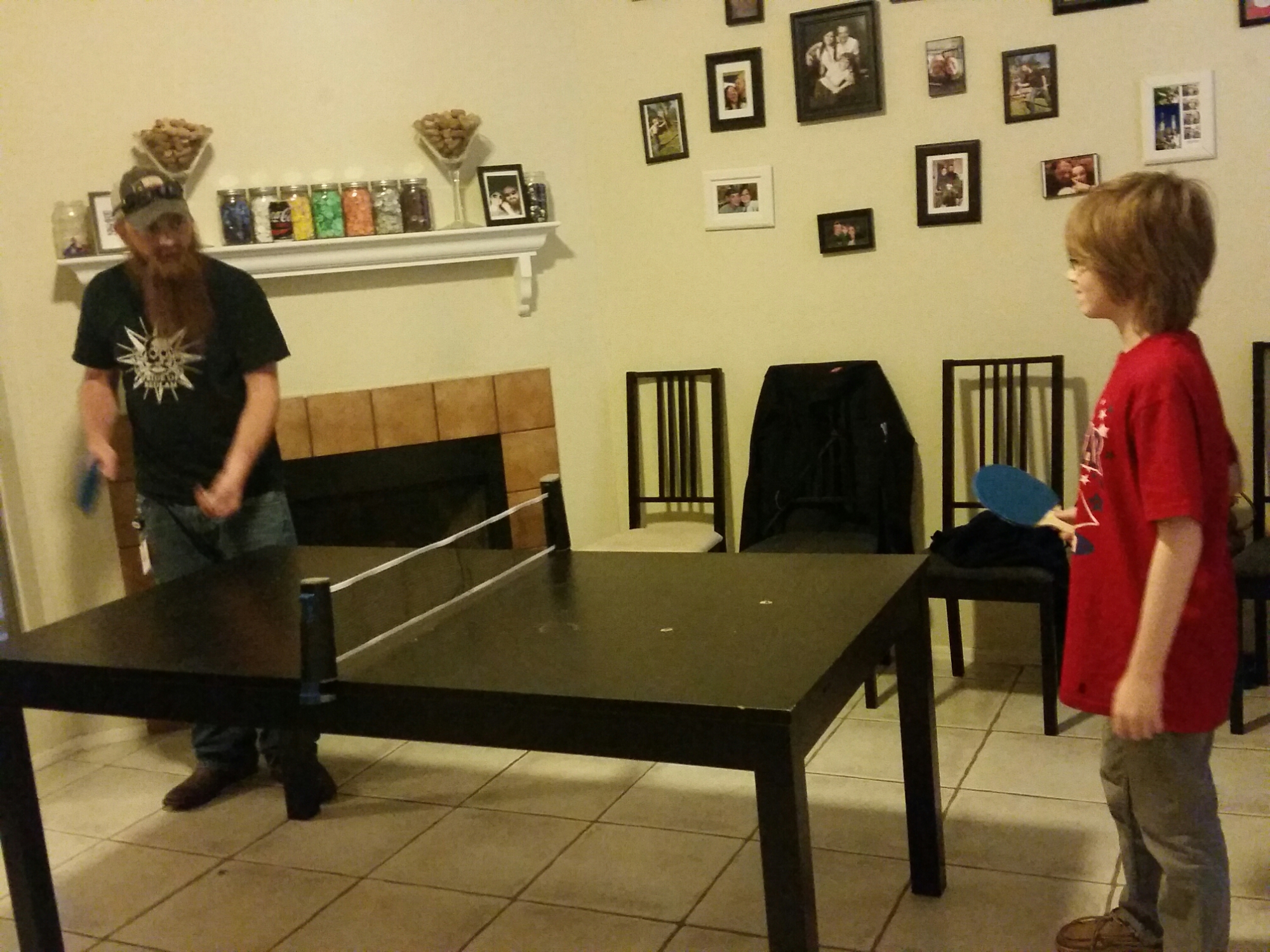 Then we got a cool little ping pong set that goes across the table, so the Midget and the Hubs cleared everything out and tried it!