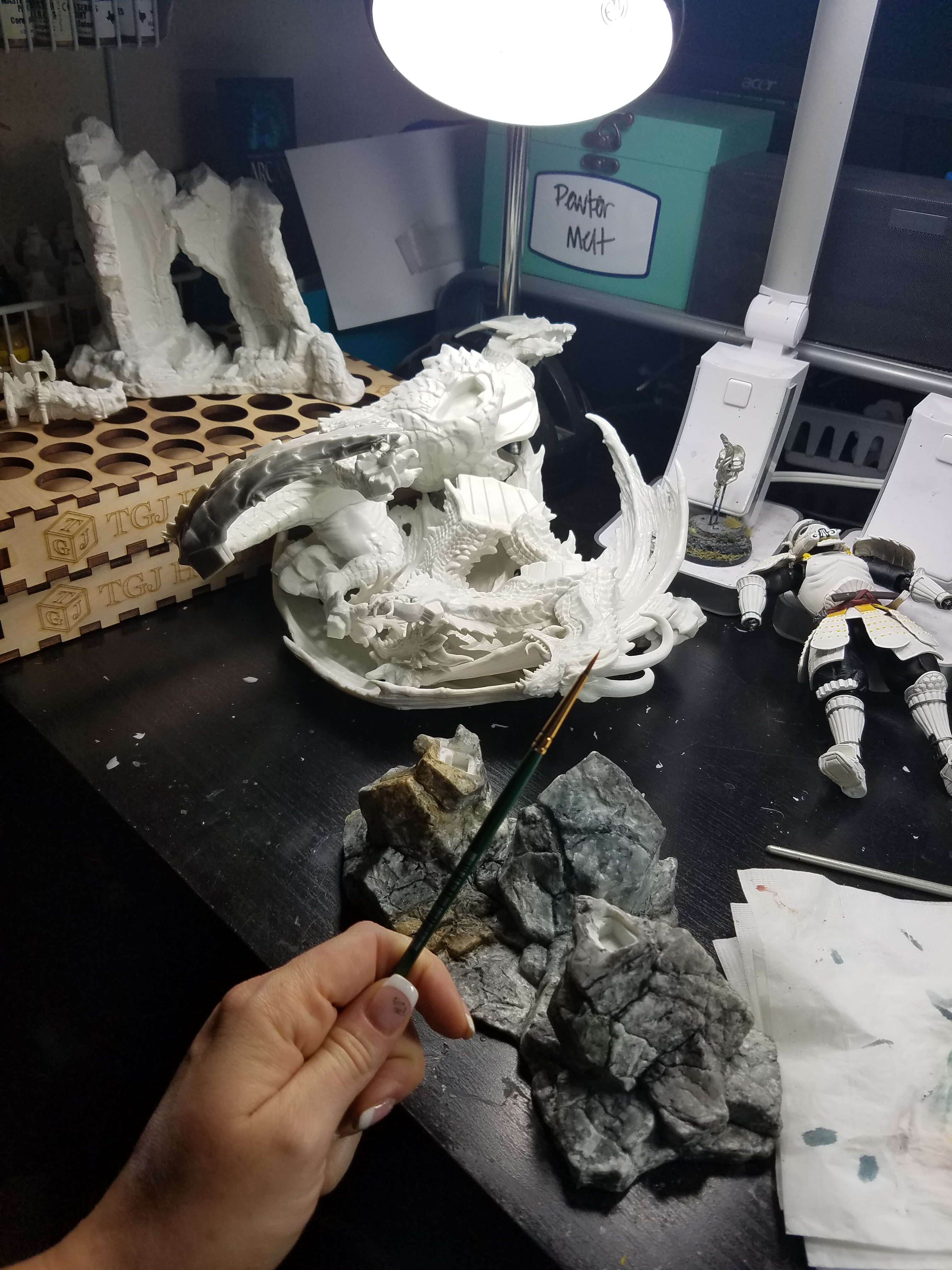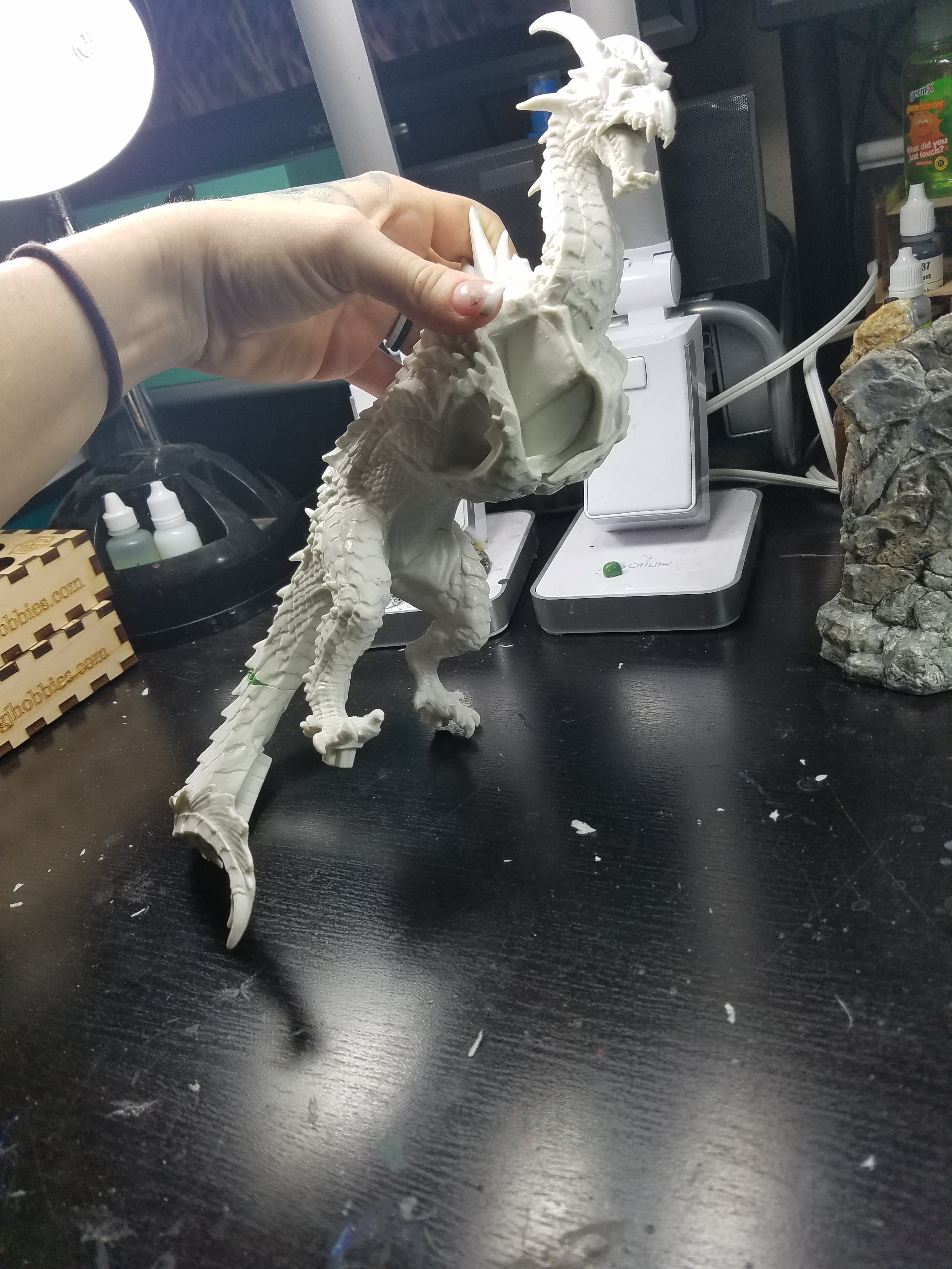 Got started on Ms.thing today! I seriously love this bigature. I am not sure yet if this one will be the one I do my 5 heads in 7 days challenge on or not, but I’m following all the rules, just in case. So, if I get her done, this is day 1. After 2 hours of cleaning mold lines and making a giant mess, I’m here! Her tail has been double pinned and green stuffed, to make sure it is super super sturdy since it is the third attachment point to the base.