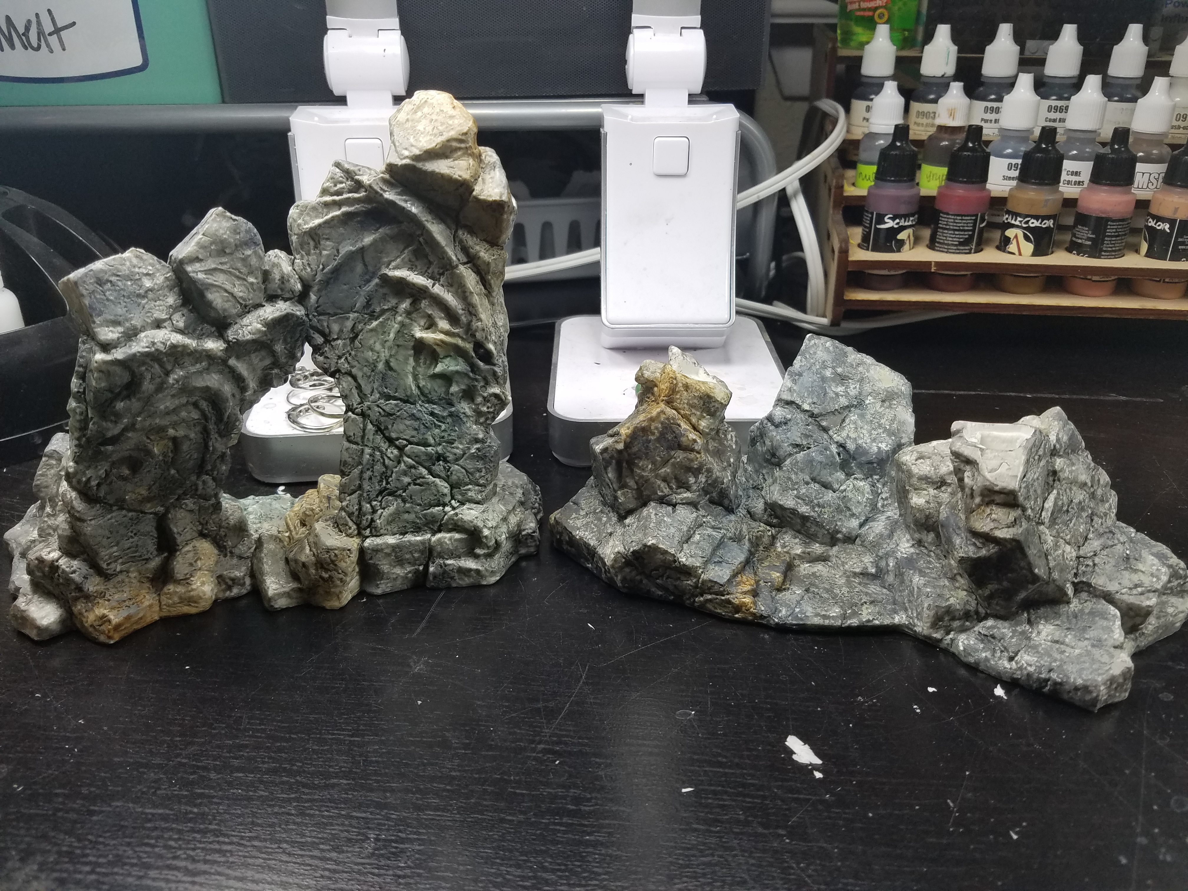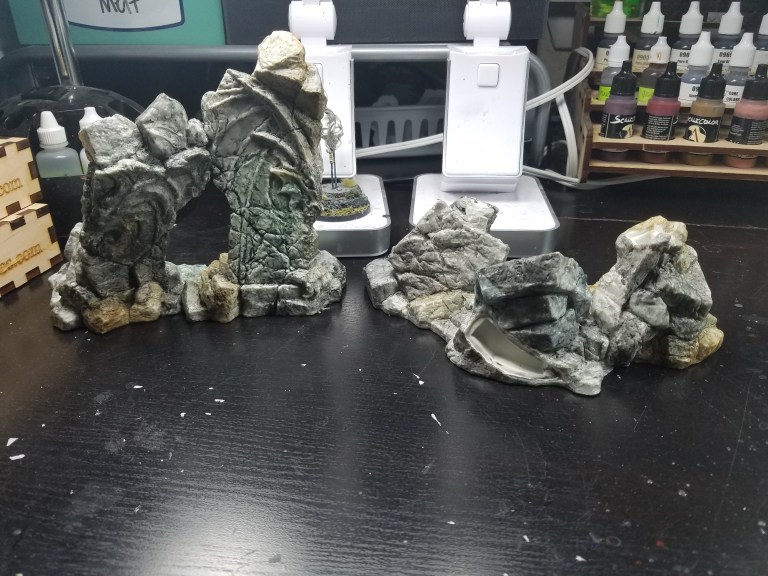 My big accomplishment tonight is that I got the rocks done! I used only a size 0 brush, and I had a great time getting all this texture. I’ll probably add a bunch of flocking and ivy and stuff later, but I gotta start somewhere!