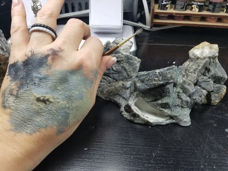 Then I took some armor grey, concrete grey, moldy skin, and shadow grey and blobbed them on top of the other liner colors. These colors were used in a much more dry manner, and I mixed them all up so it didn’t end up as distinctive blobs of one particular color.