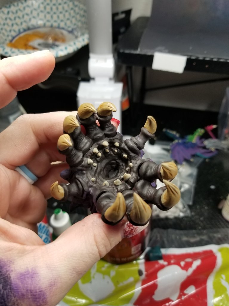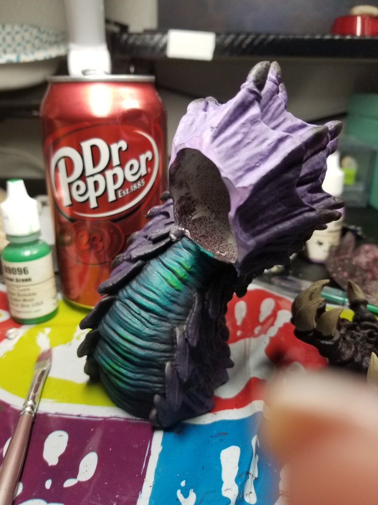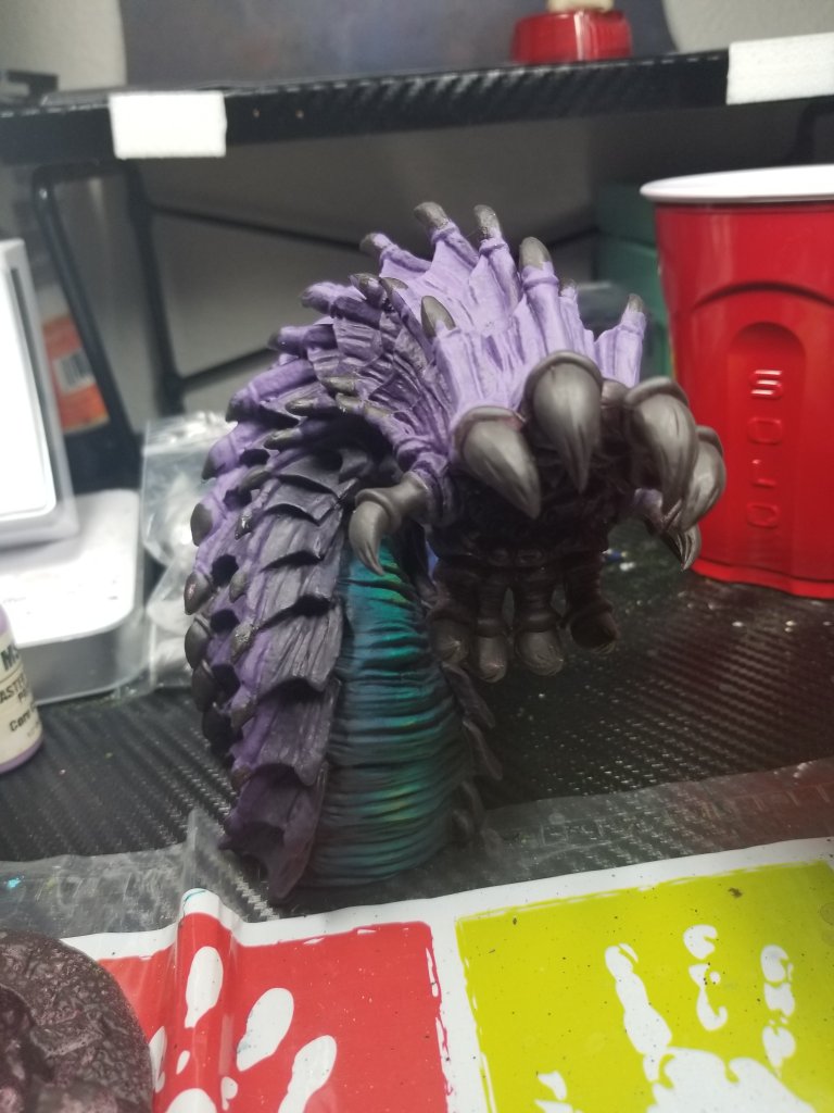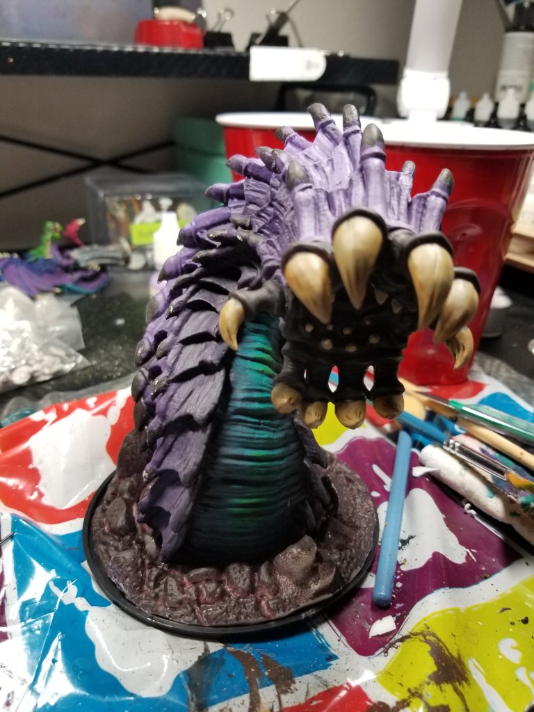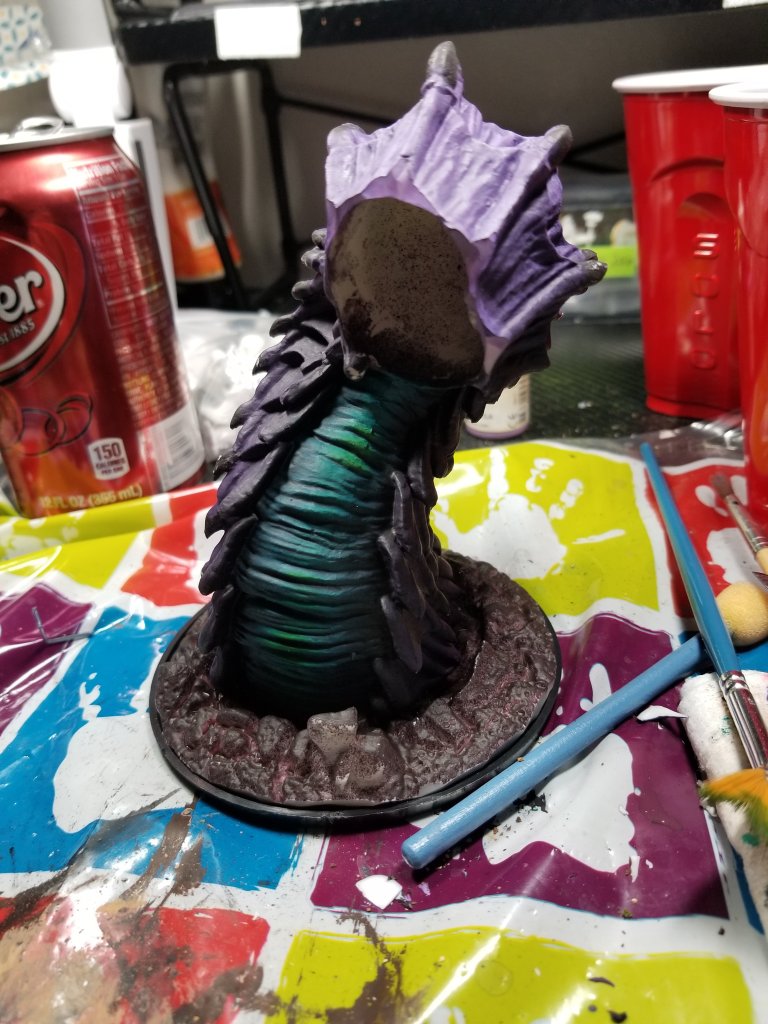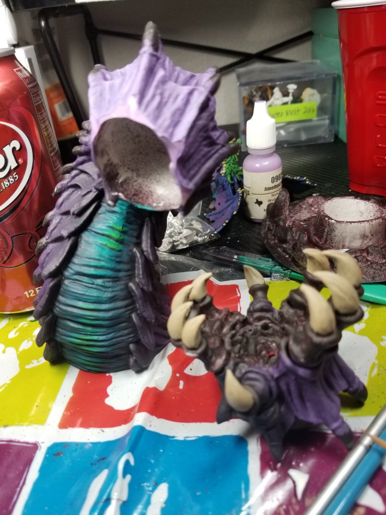So, you’ll see a lot of incremental changes in this purple worm because I’m working really hard to be present what I’m doing and take the time to do it. When someone talks about using paint that’s thinned down to the consistency of like skim milk or they’ll say it’s like painting with dirty water, usually thats when I tune out. LOL I just don’t see a lot of benefit to spending eight layers of paint on something when I could just do one. But that’s what I’m trying to change. I want to make my transition smoother, I want to work on getting all the values out of the colors that I’m using. If I had a New Year’s resolution as far as painting went it would be to take the time, and put in the effort to make the miniature look like I want it to look.