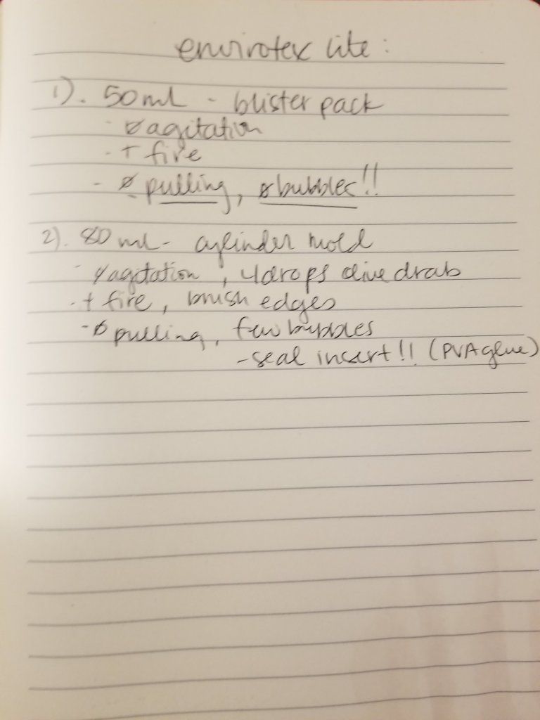 - (or 1) This was my first time with envirotex lite. I just poured into a blister to see how it would go. It went just fine, 50mL didn’t pull, and I didn’t use the dryer. I didn’t have any pulling or bubbles. Very happy. It’s a little more yellow and less clear than the other brand. Since I’m planning on tinting it, it doesn’t matter to me. Just FYI.