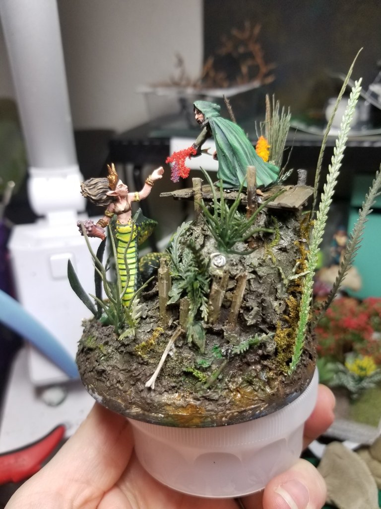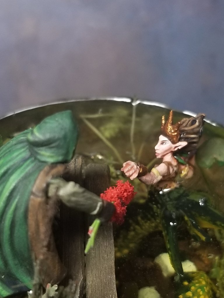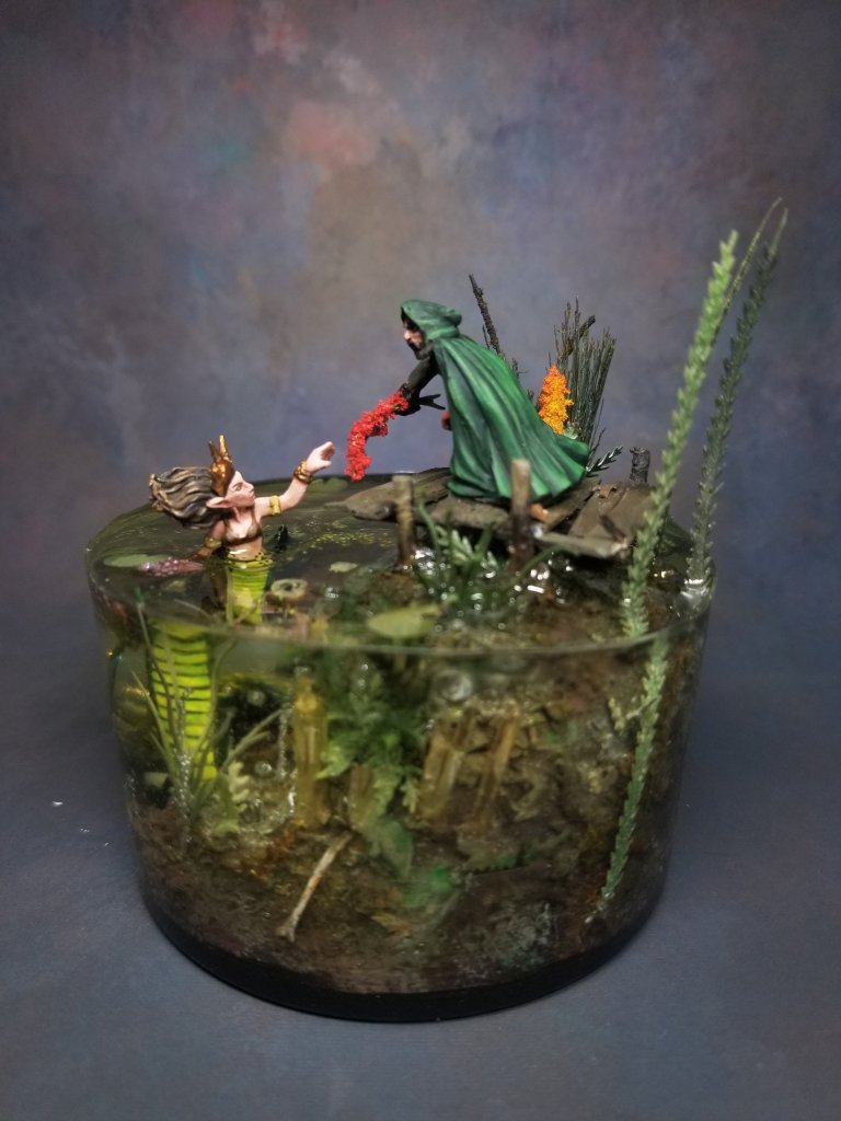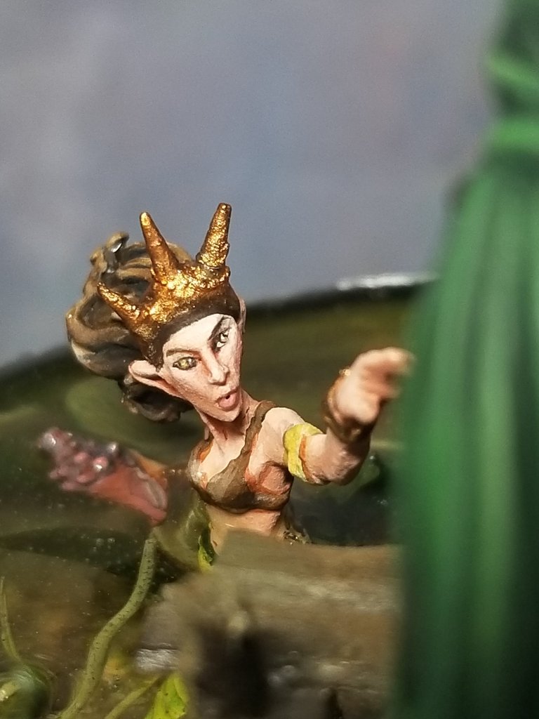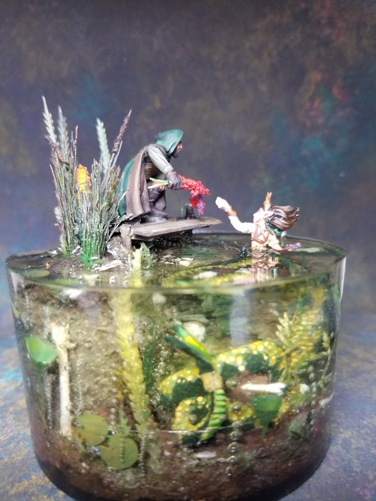 Looks fantastic. I like how the murkiness of the resin works with your over-highlighting. It very much evokes some of the bogs I have seen. Well, minus the creepy snake lady.