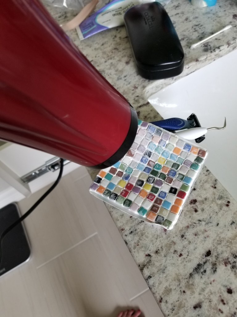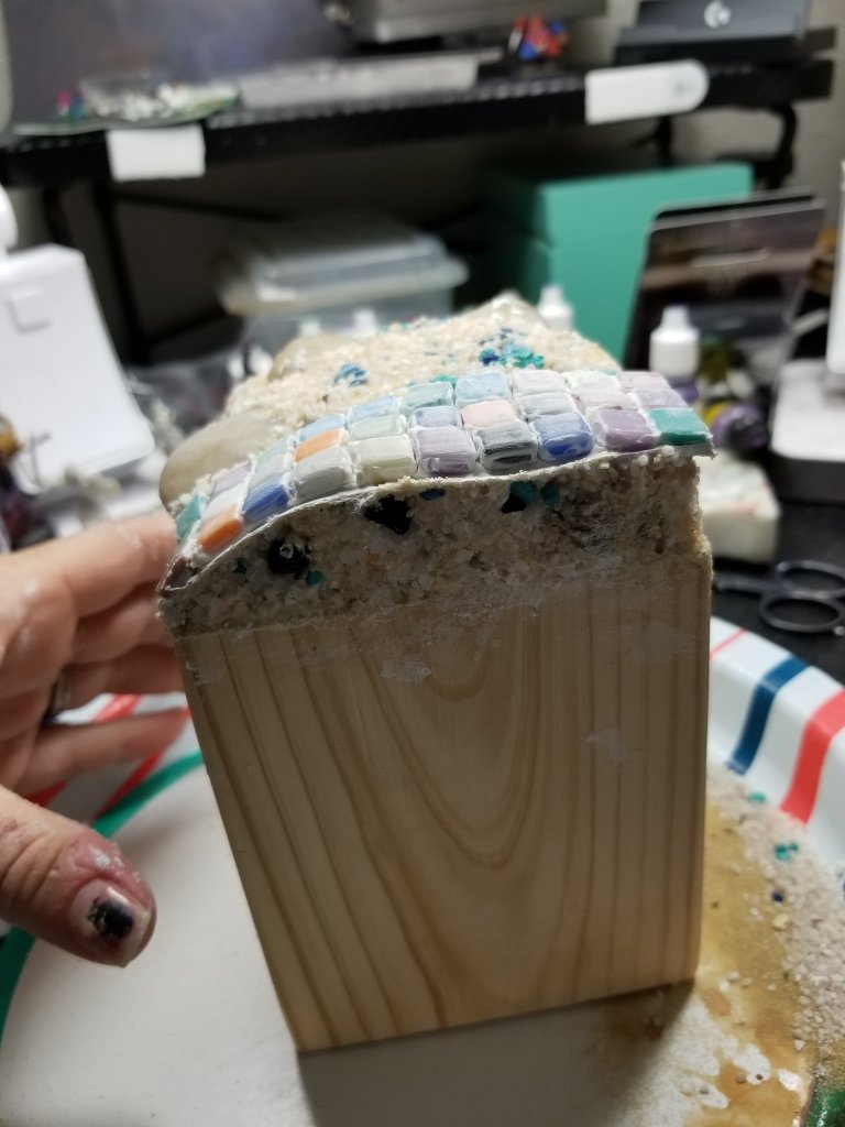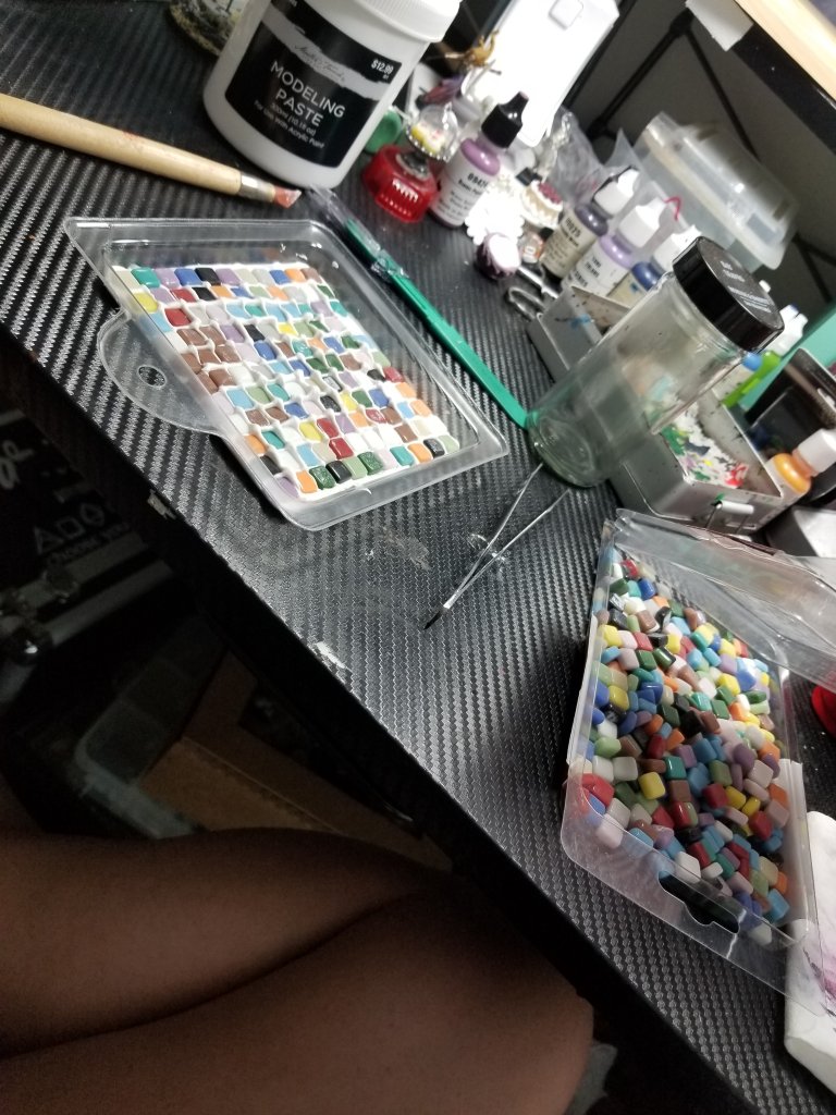 I started on the LJ&C base. Here I am, regretting not buying the already done mosaic. lolUnder my desk you can see the overflow ‘basing’ area. I have 2 entire boxes full of stuff. I just can’t help it. I have to HAVE ALL OF IT. But seriously, if you need something, call me. 😀