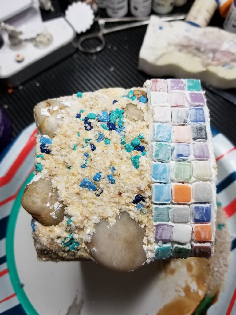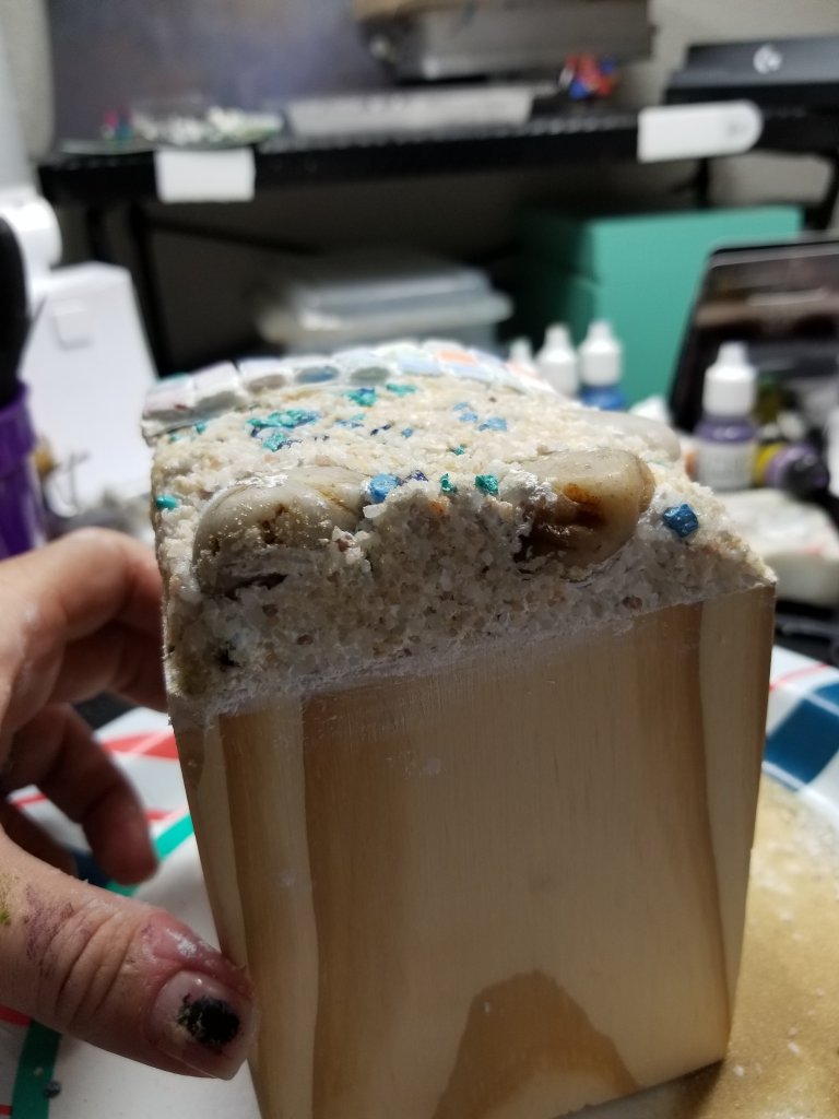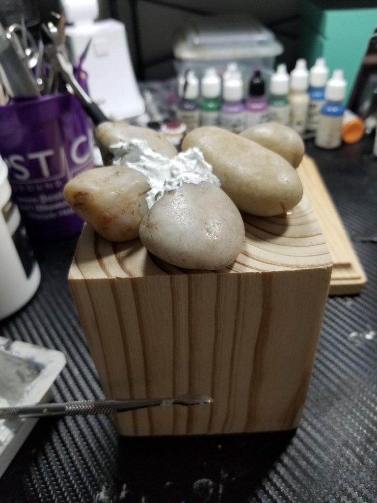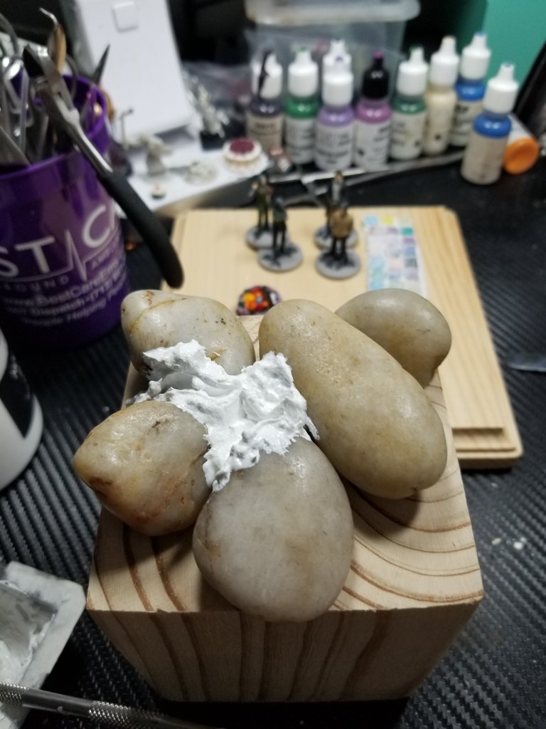Sleep when the baby sleeps, my ass. lol. Gotta get this stuff done! So you blow dry when the baby sleeps!!! Don’t mind the modge podge of stuff under the rocks. I was trying to get a ‘rolling hills’ effect. This is where it starts! Rocks and stuff. At this point, I will mention that I should have gone with milliput. I own that and green stuff, but it didn’t occur to me to use it until I had this mushy mess that I was trying to shape. And let me tell you, wet stuff does NOT shape well. lol. I could have saved myself the trouble if I had used milliput instead of heavy texture paint. Don’t be like Marineal. Then there was more!