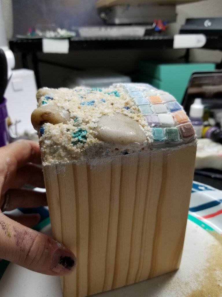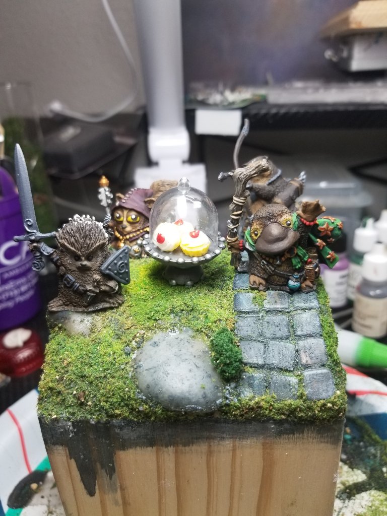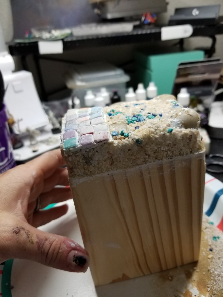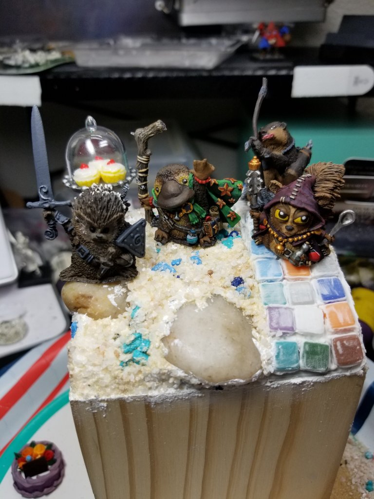 Sleep when the baby sleeps, my ass. lol. Gotta get this stuff done! So you blow dry when the baby sleeps!!! Don’t mind the modge podge of stuff under the rocks. I was trying to get a ‘rolling hills’ effect. This is where it starts! Rocks and stuff. At this point, I will mention that I should have gone with milliput. I own that and green stuff, but it didn’t occur to me to use it until I had this mushy mess that I was trying to shape. And let me tell you, wet stuff does NOT shape well. lol. I could have saved myself the trouble if I had used milliput instead of heavy texture paint. Don’t be like Marineal. Then there was more!