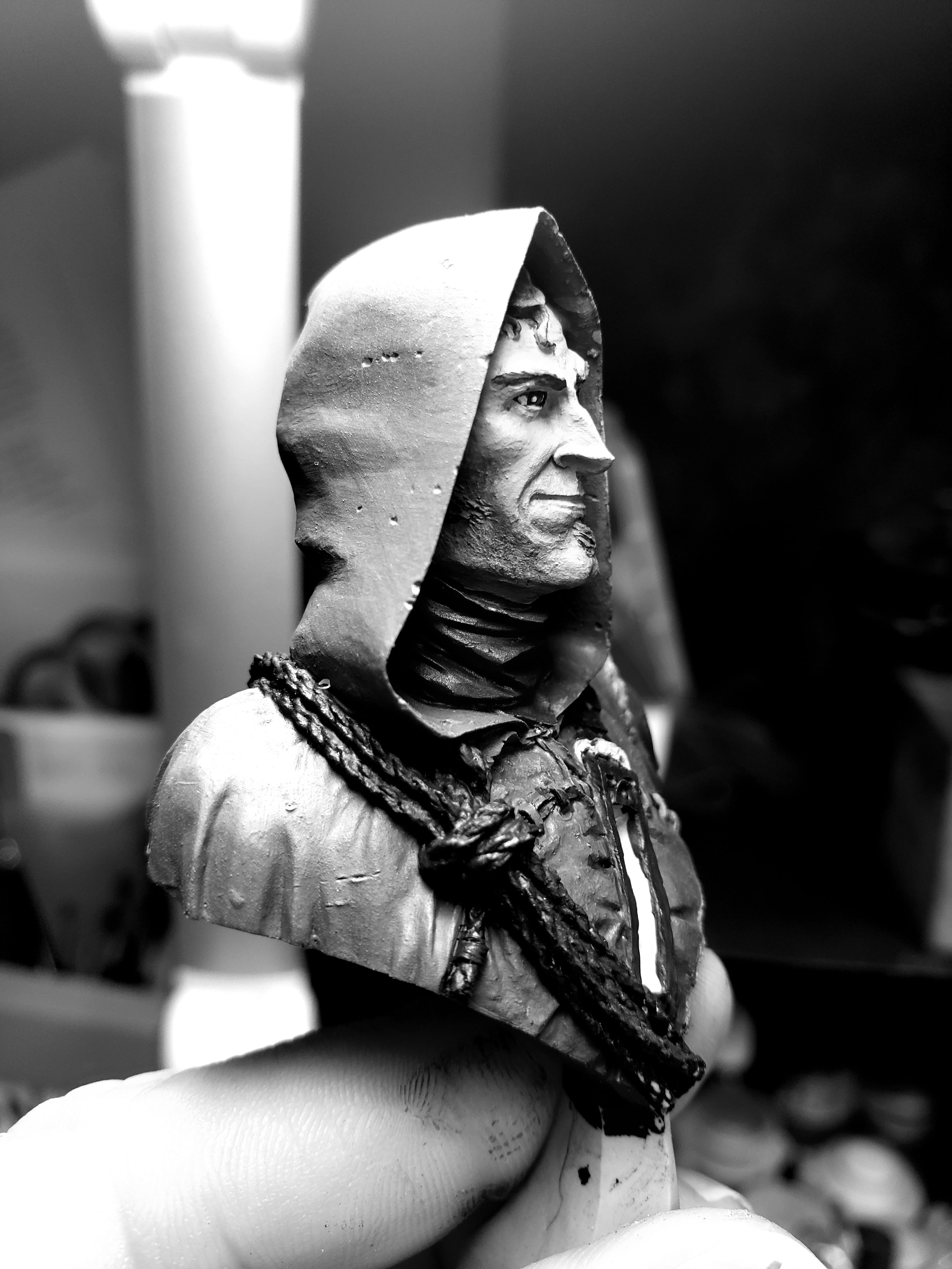 I like to take black and white shots when I’m looking for hard contrast. Since he’s a bust, this is all the skin I’ve got to work with, so I need it to be spot on. I also love that this effect made him look like someone out of fallout. 😁