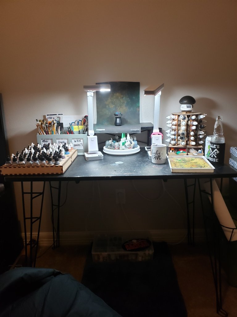 The desk doesn’t look much different. Just have the paint racks on the desk instead of the wall for the moment, and no overhead led anymore. I’m not sure it was doing a whole lot anyways. The most exciting part is the storage.