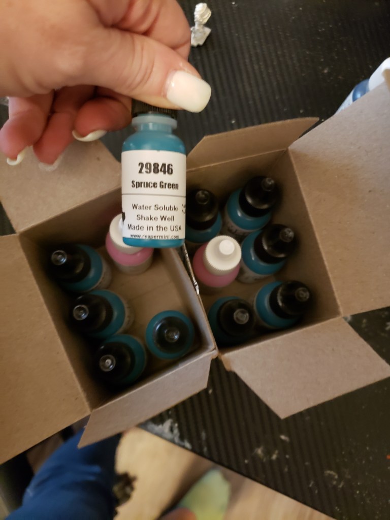 A few weeks after Reapercon, I saw a post on the forums that said that if you wanted a paint color that they no longer made, you could order it. The catch was that you had to order 10 bottles at $5 a piece. To get Spruce Green, I would have paid it twice. Lol. So I placed my order straight away, and I was super super excited!! I have already used it on a few things. I love it so much.