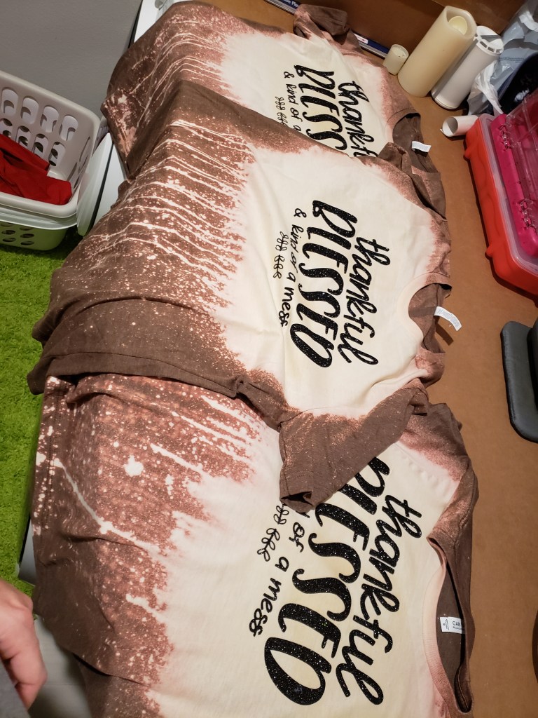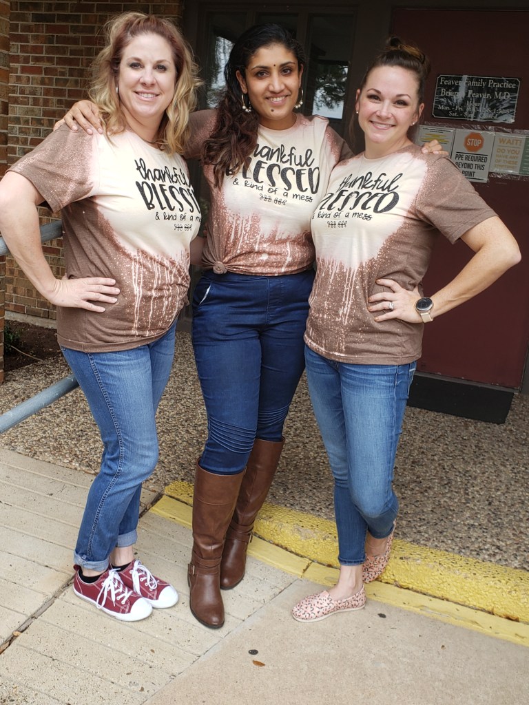 I also made some fun shirts for our providers to wear for Thanksgiving. I tried out the bleach thing, and it was pretty fun! It literally involves just spraying the shirts with bleach. lol