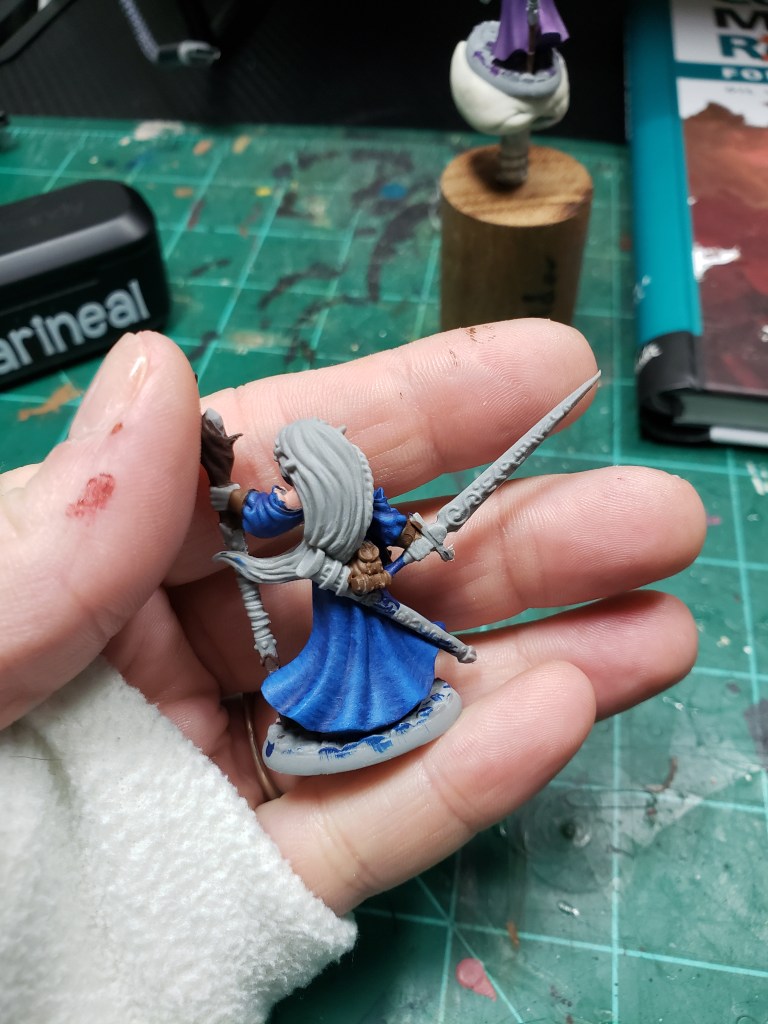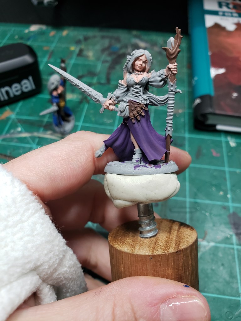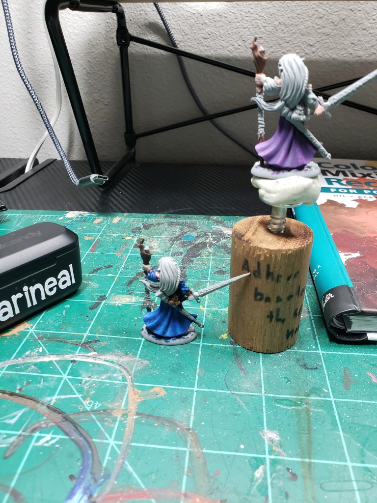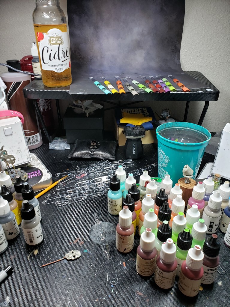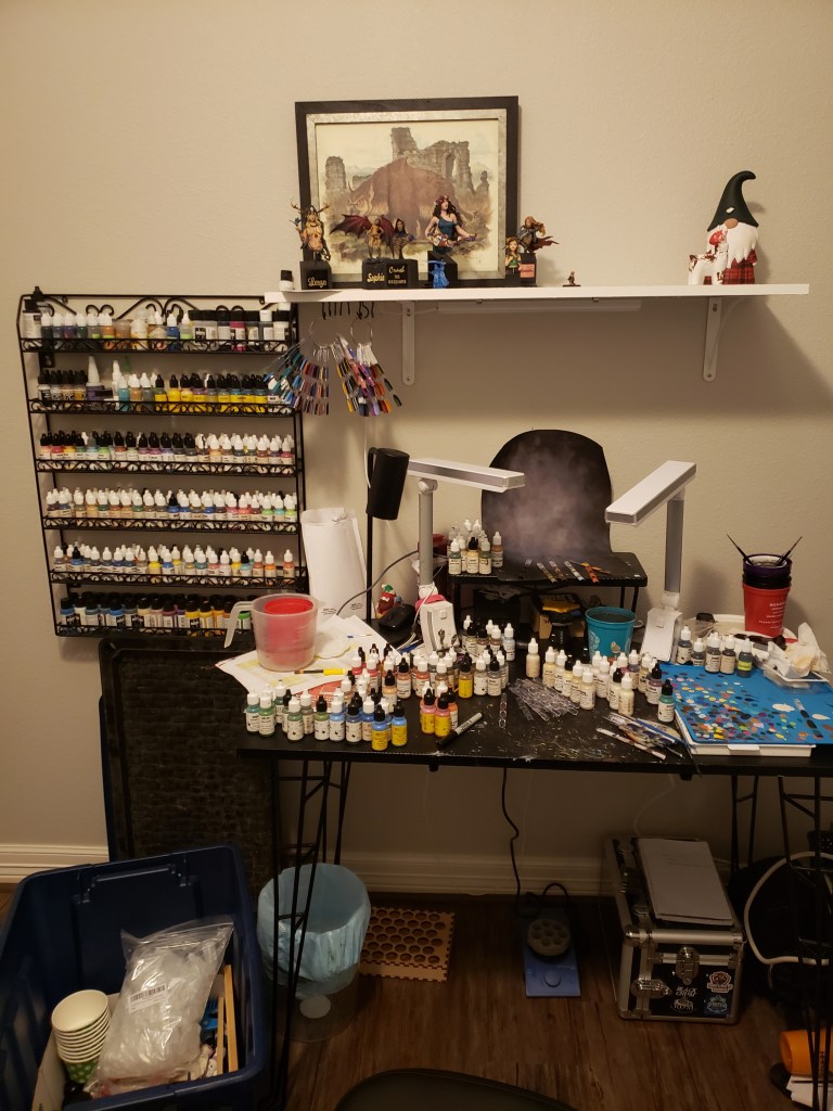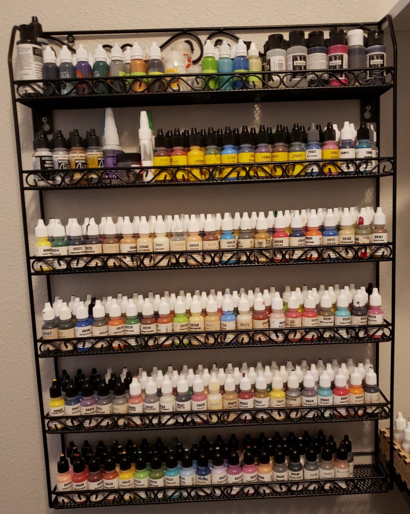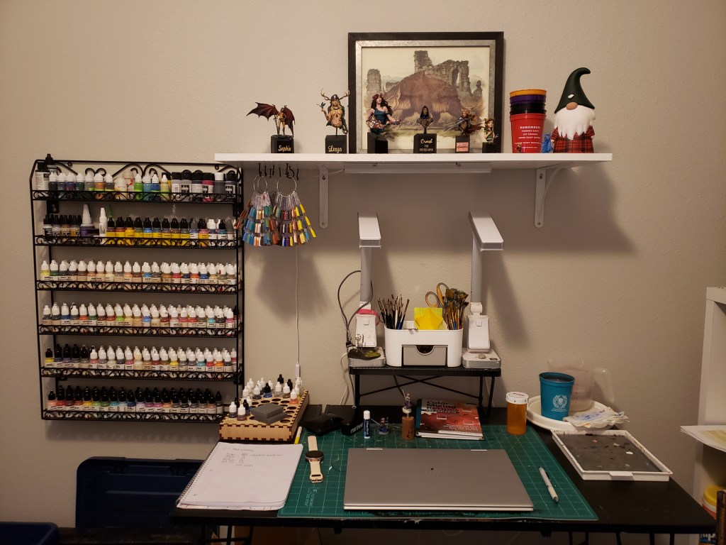 That’s how I did it! I’m sure hoping this helps. I also kept one small paint rack on my desk for my additives, black and white, primers, and paints I’m currently using. My goal is that I put them away before I fill the rack. We shall see… Onto the painting!