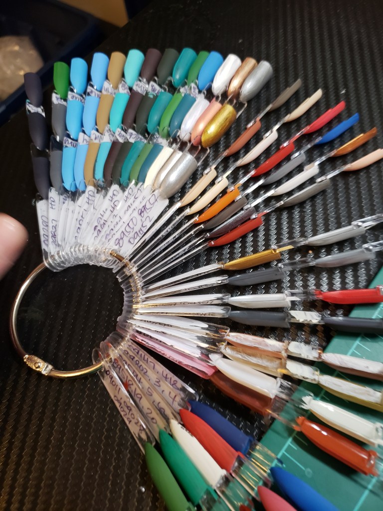 Some advice if you decide to hurt yourself like me… If I had it to do over again, I would buy the opaque nails rather than the clear ones. Metallics didn’t show up well without an undercoat, and I had to paint white under the sku on the swatch so I could read it. At first I tried writing the sku on each little area, but it was really difficult. It was much easier to just write all three at the top and then go.