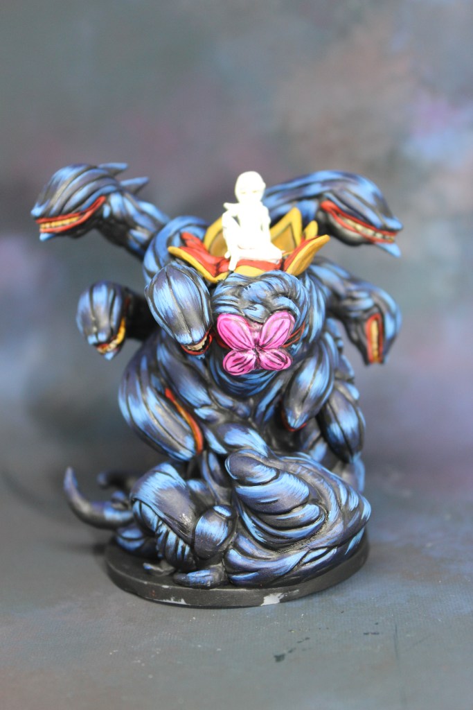 I started with this guy, the Lich Wurm from the game Middara (which is super fun, but toddlers are not conducive to gameplay). I decided not to worry about the chick on top since she is just straight white in the concept art, and her details were a little soft anyways. I also didn’t try to do NMM on the gold. I’m working on figuring out one thing at a time, thank you. I was going for a sort of “Venom” look on this, and I don’t think it turned out too shabby! Definitely want to go back to some more saturated, lighter colors, but this was a good practice piece.