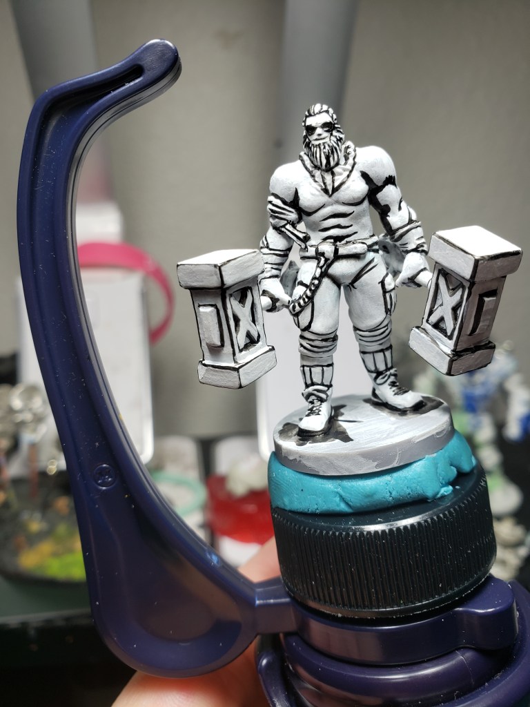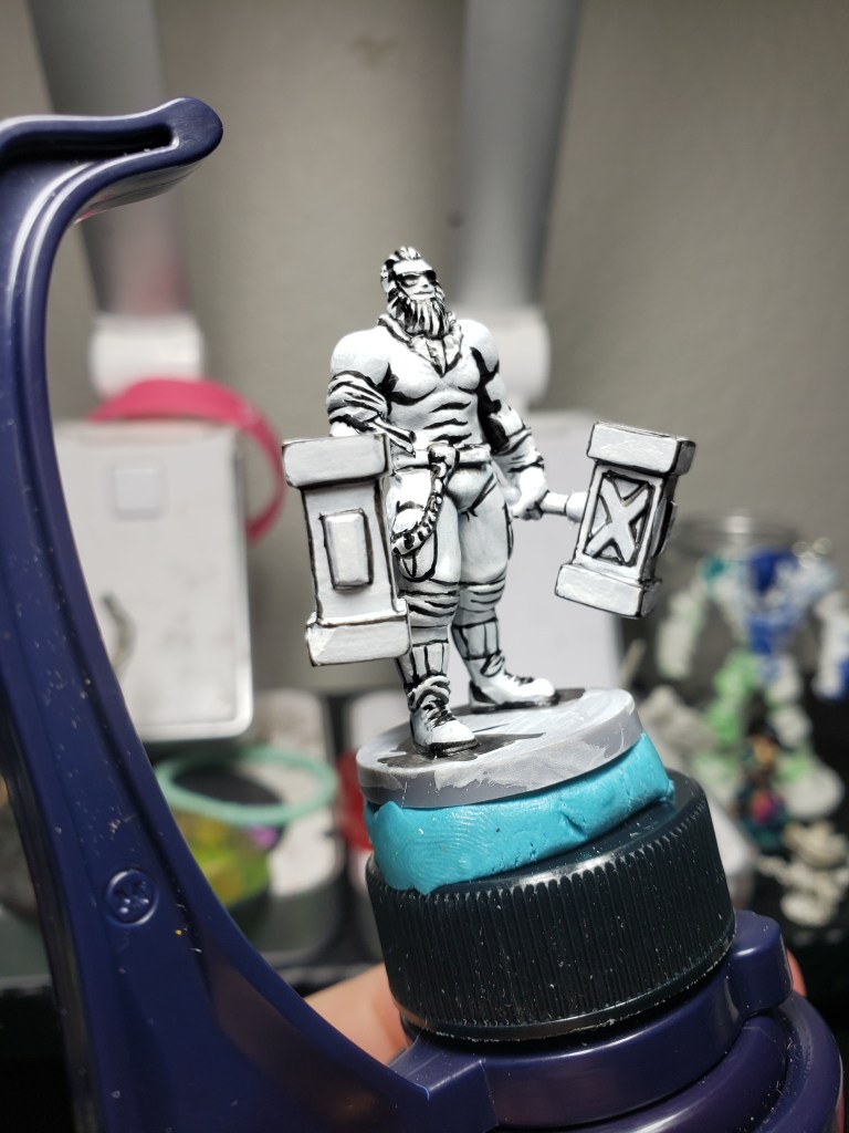 Then I decided to try something else different. One of the Epic Duck Studios videos covers painting just white and lining, and then using contrast paints to sort of ‘color in’ the mini. I found this super interesting, as the model was completely amazing to my eye when it was just black and white. I kept having to remind my brain that it was 3d and not 2d and that was exciting to me! So I decided to try my hand at it. Remember, I am no expert. I definitely found a few areas I need to work on with this mini.