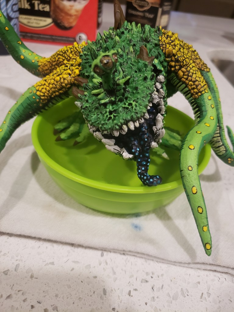 So he got a pedicure. Little soak in some keurig water, then he was nice a flat! But his tentacles kept scraping the counter, so I put him on a little round plinth. It’s really hard to see in the picture, but that actually makes me happy. 🙂 So he’s based and stable, and I’m going to become unstable painting lines.