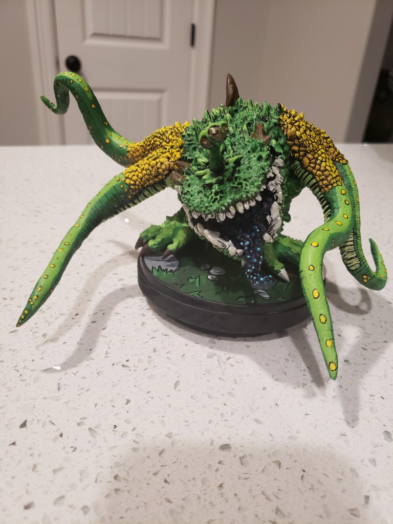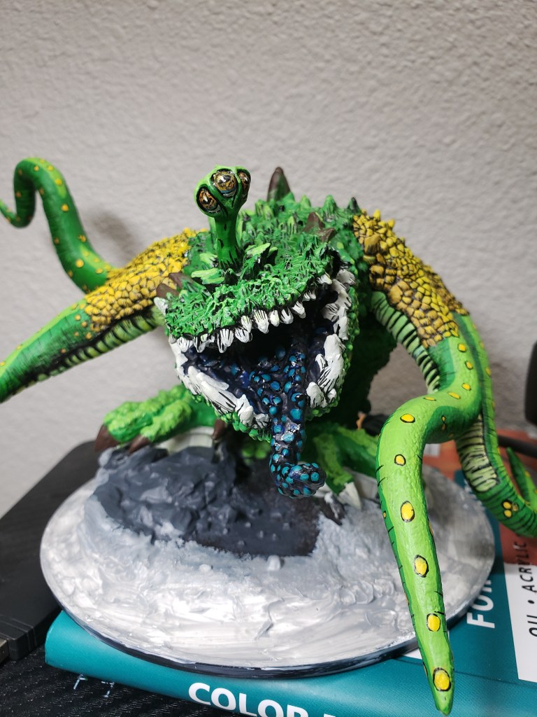 On the mini front, I had an awesome one-on-one with Mike Cousins of Epic Duck Studios the other day! I really enjoyed it, we commiserated on our Tiny Overlords, and talked some painting. He agreed that the only way forward on the froghemoth is to just start lining on the green and go until it looks like comic style. We talked about how Captain America’s scales aren’t all drawn, just enough to give the impression of scales. It’s a lot, but not all of them.