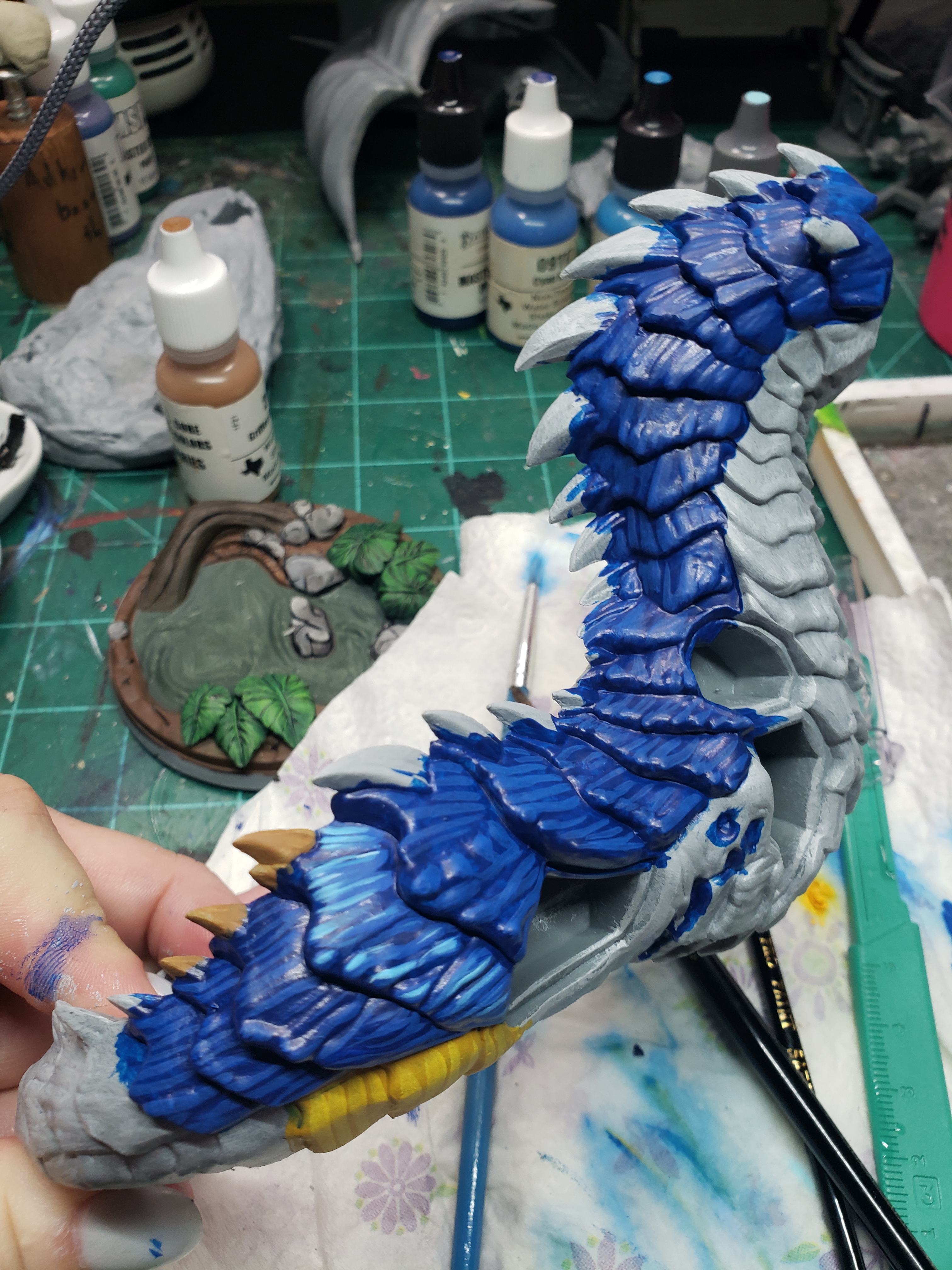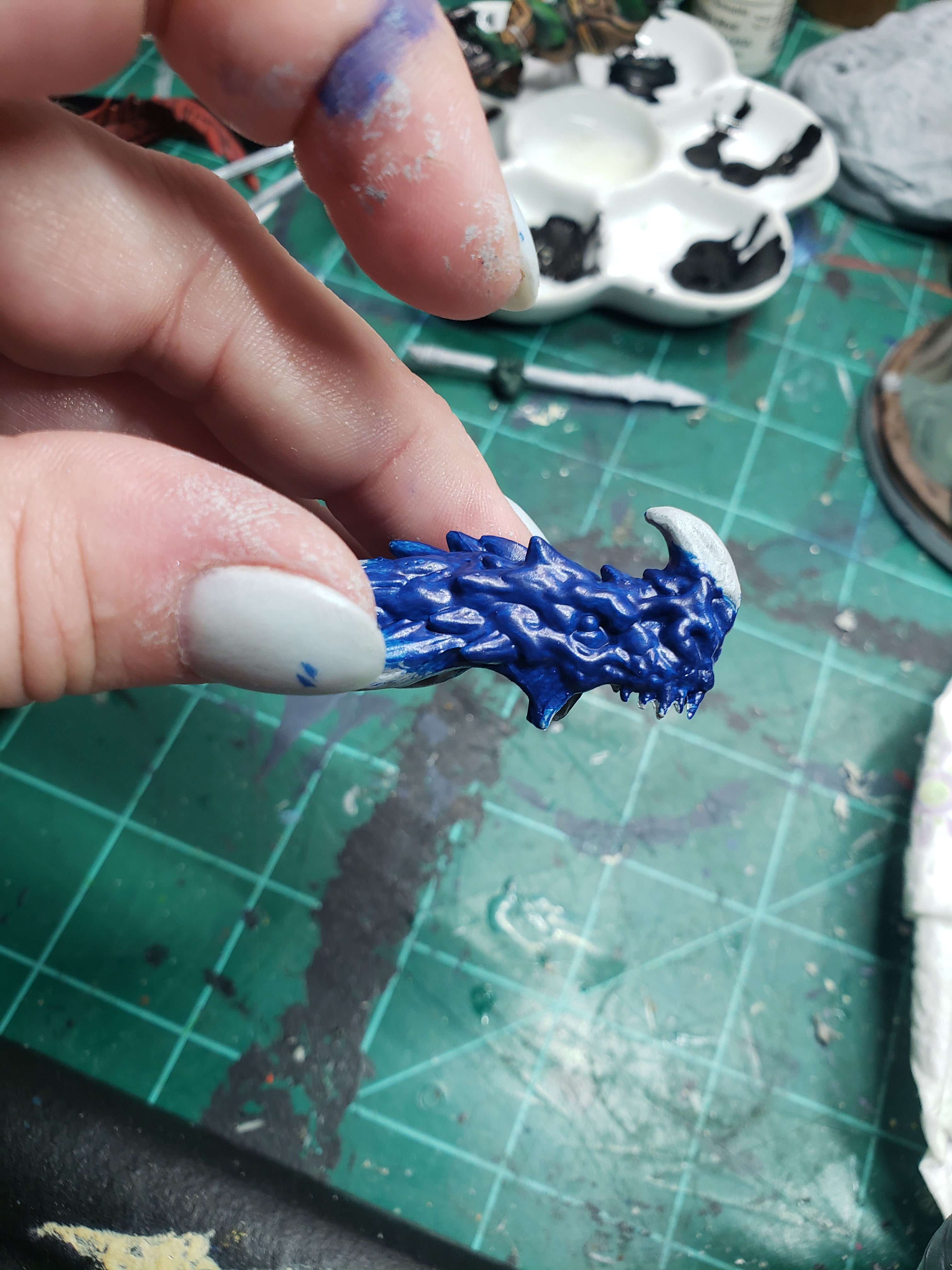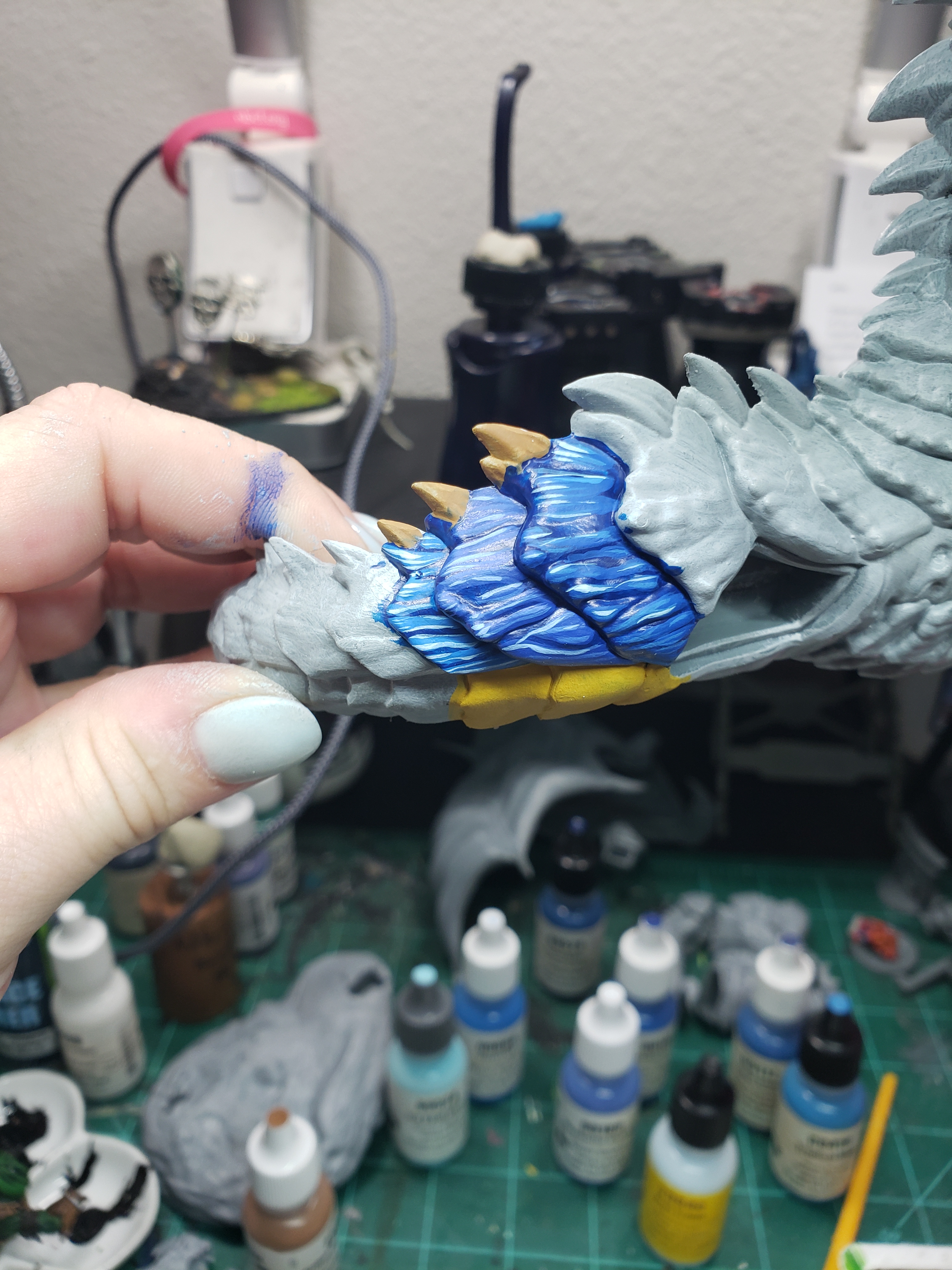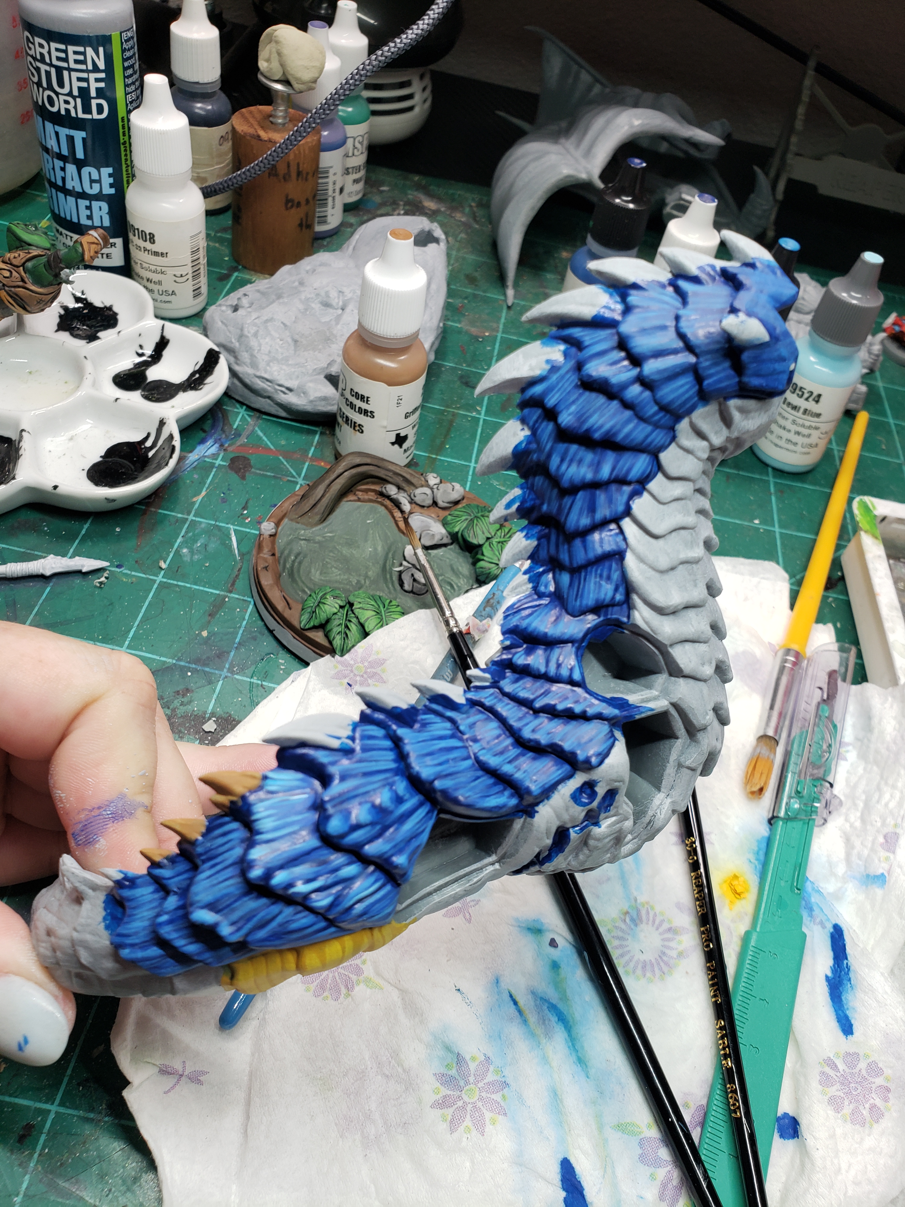This last guy will definitely end up with his own post at some point, so forgive me if you see these pictures again. But I decided to try my hand at a whole dragon. I love this guy, and his beefy wings, so I figured I’d go with him. He’s Shavynra from Reaper. And he’s a blue dragon, cause check out that nose. lol. I’m going with a different sort of lining pattern for texture, and I really like it! Obviously there’s a lot more work to be done, but this is where I’m at currently