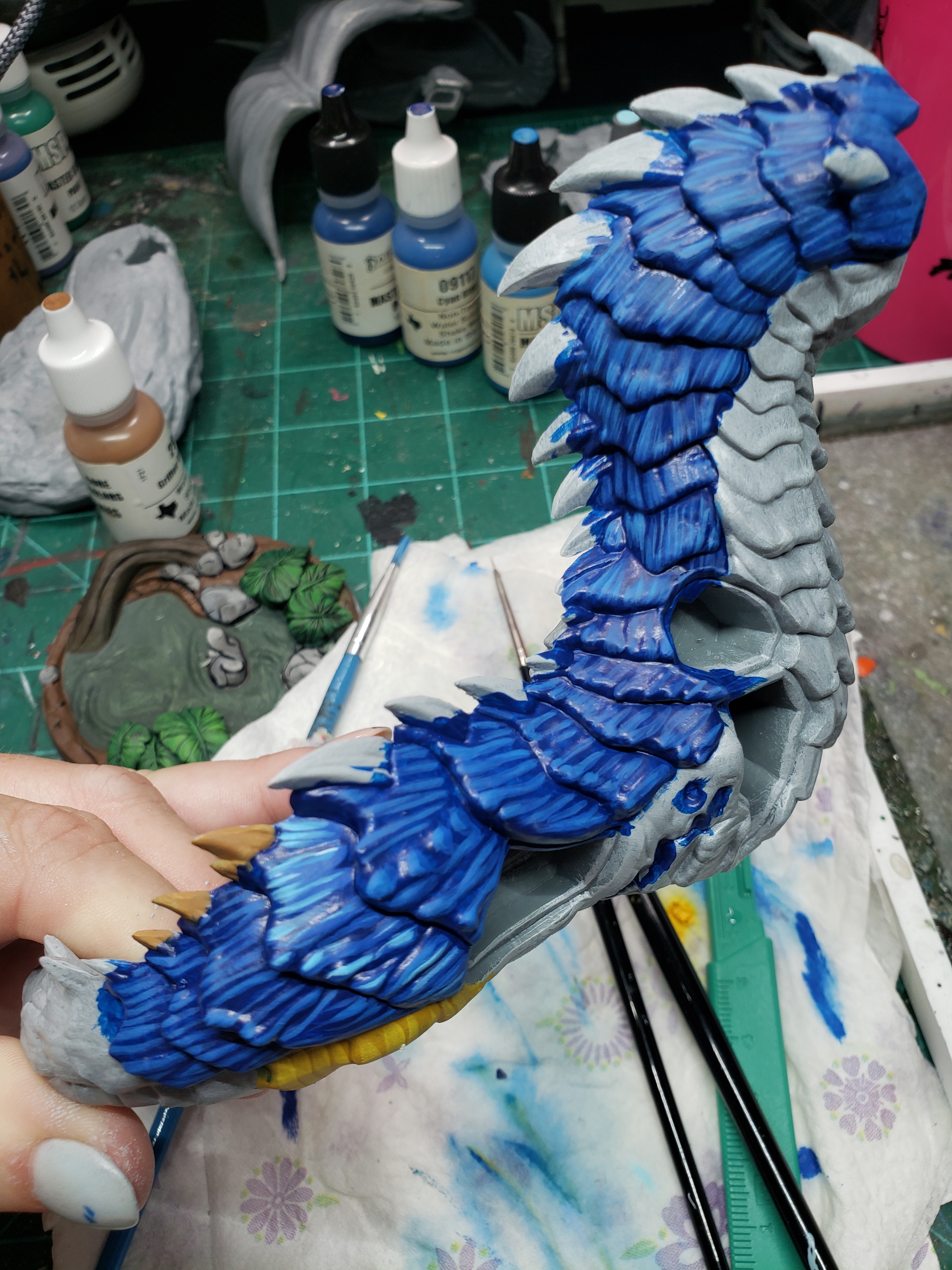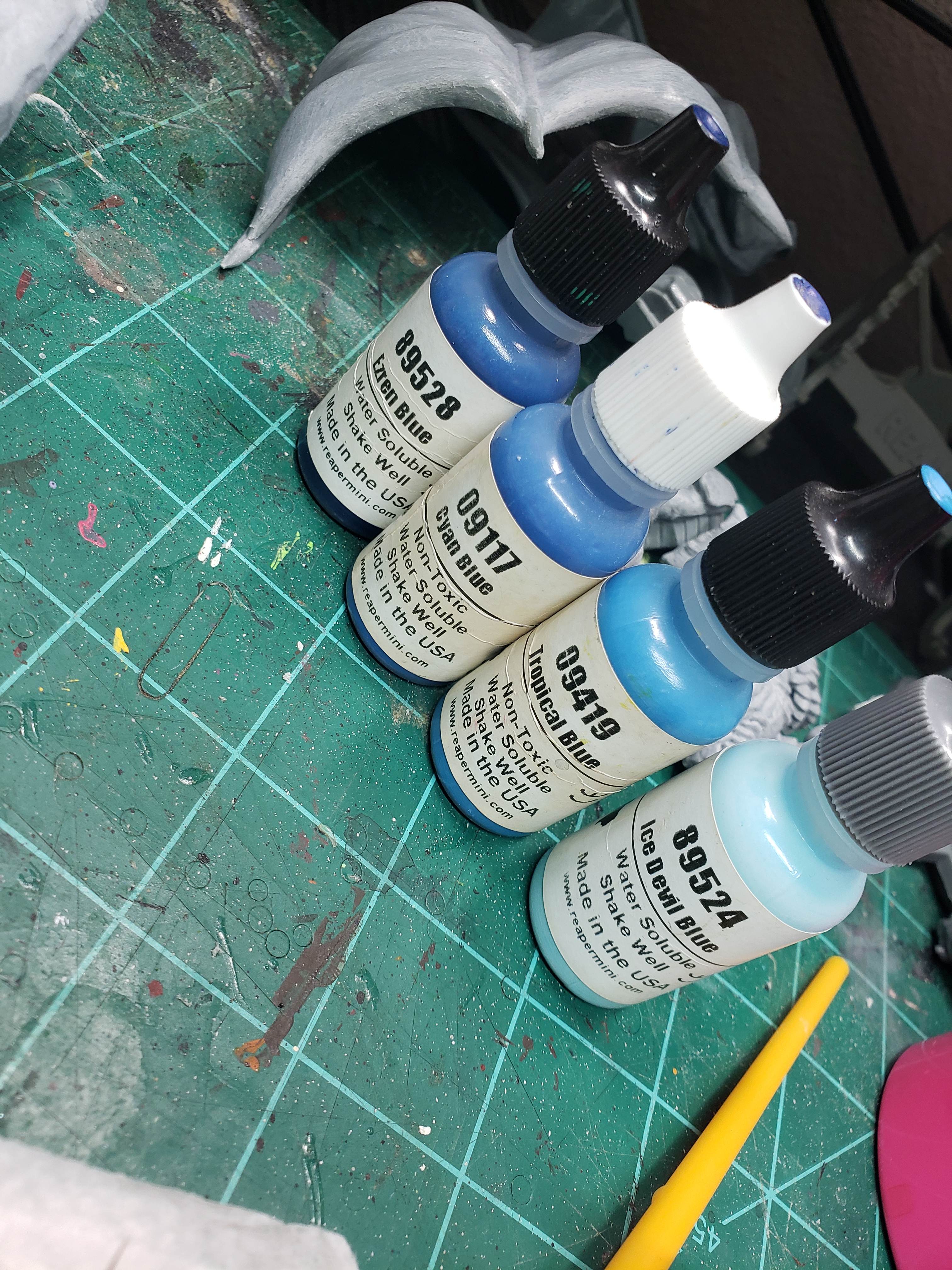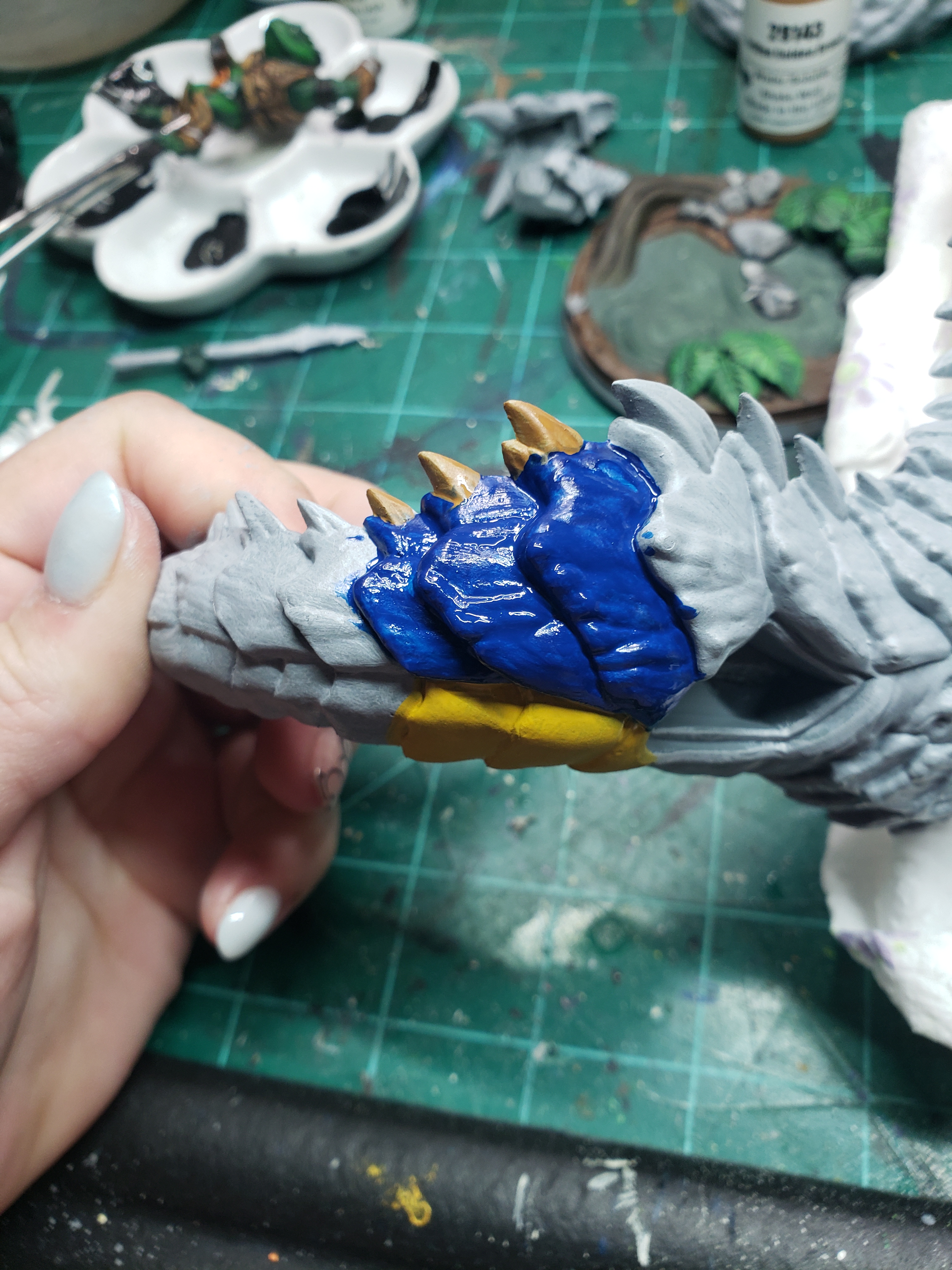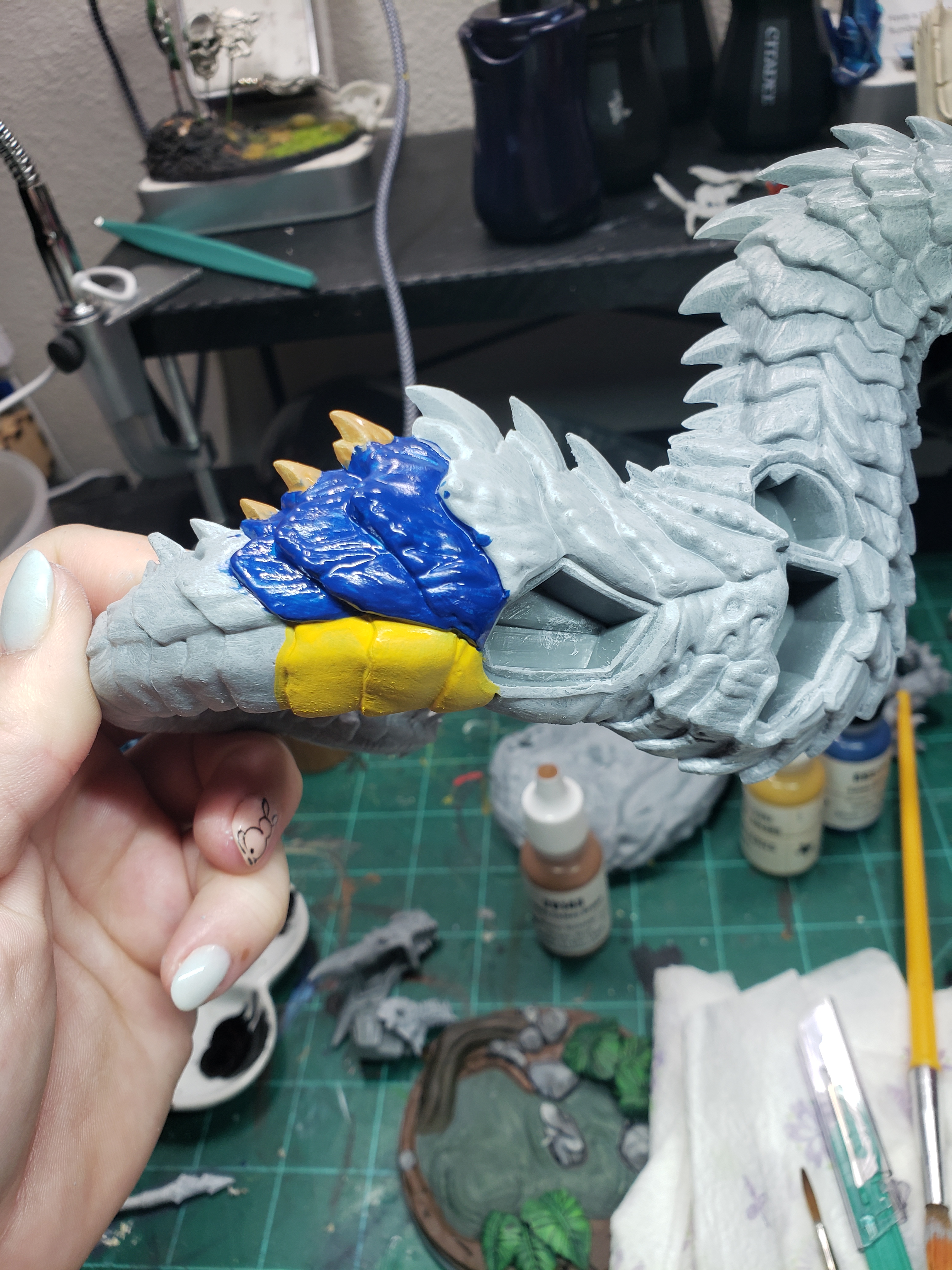 This last guy will definitely end up with his own post at some point, so forgive me if you see these pictures again. But I decided to try my hand at a whole dragon. I love this guy, and his beefy wings, so I figured I’d go with him. He’s Shavynra from Reaper. And he’s a blue dragon, cause check out that nose. lol. I’m going with a different sort of lining pattern for texture, and I really like it! Obviously there’s a lot more work to be done, but this is where I’m at currently