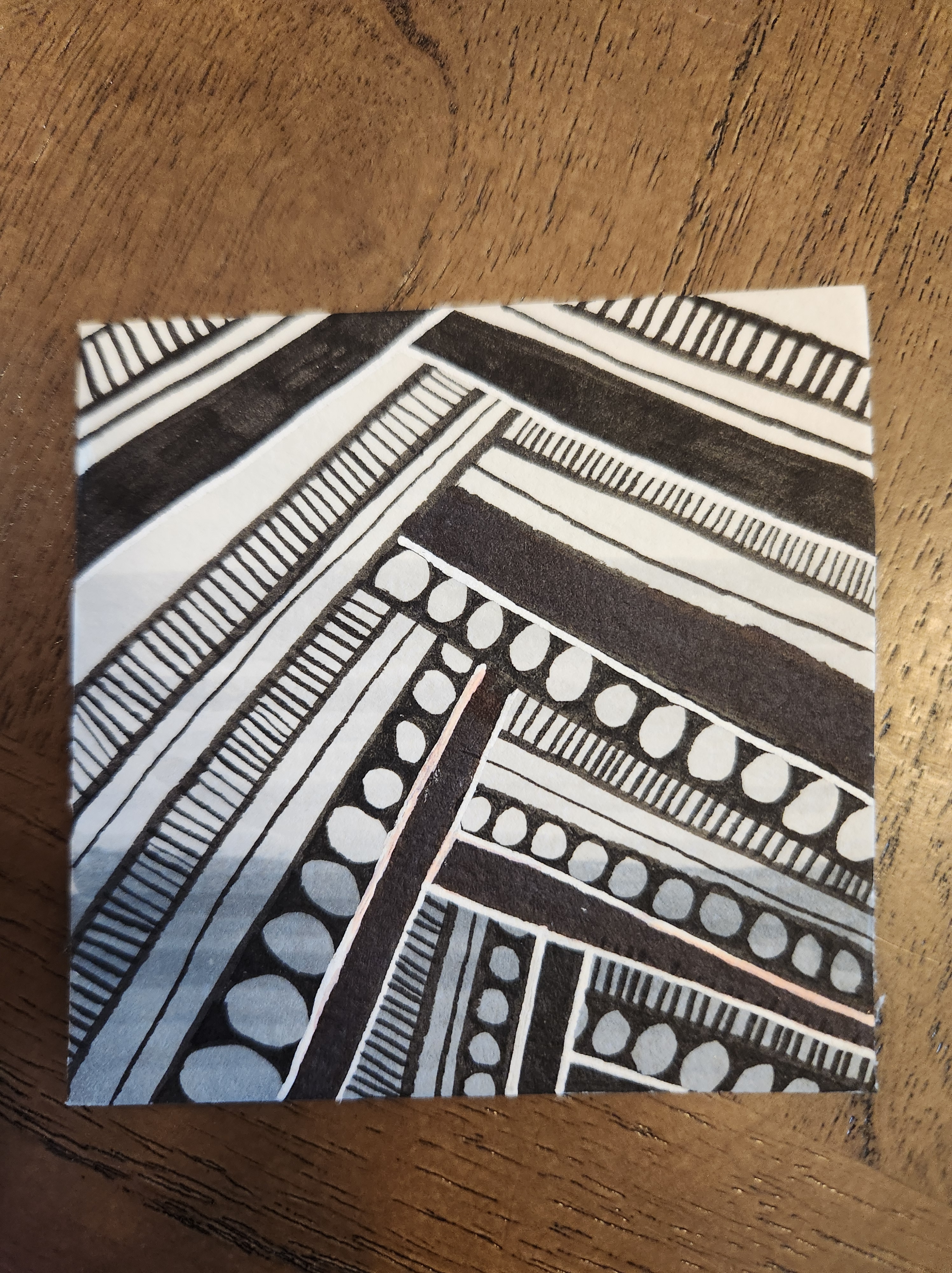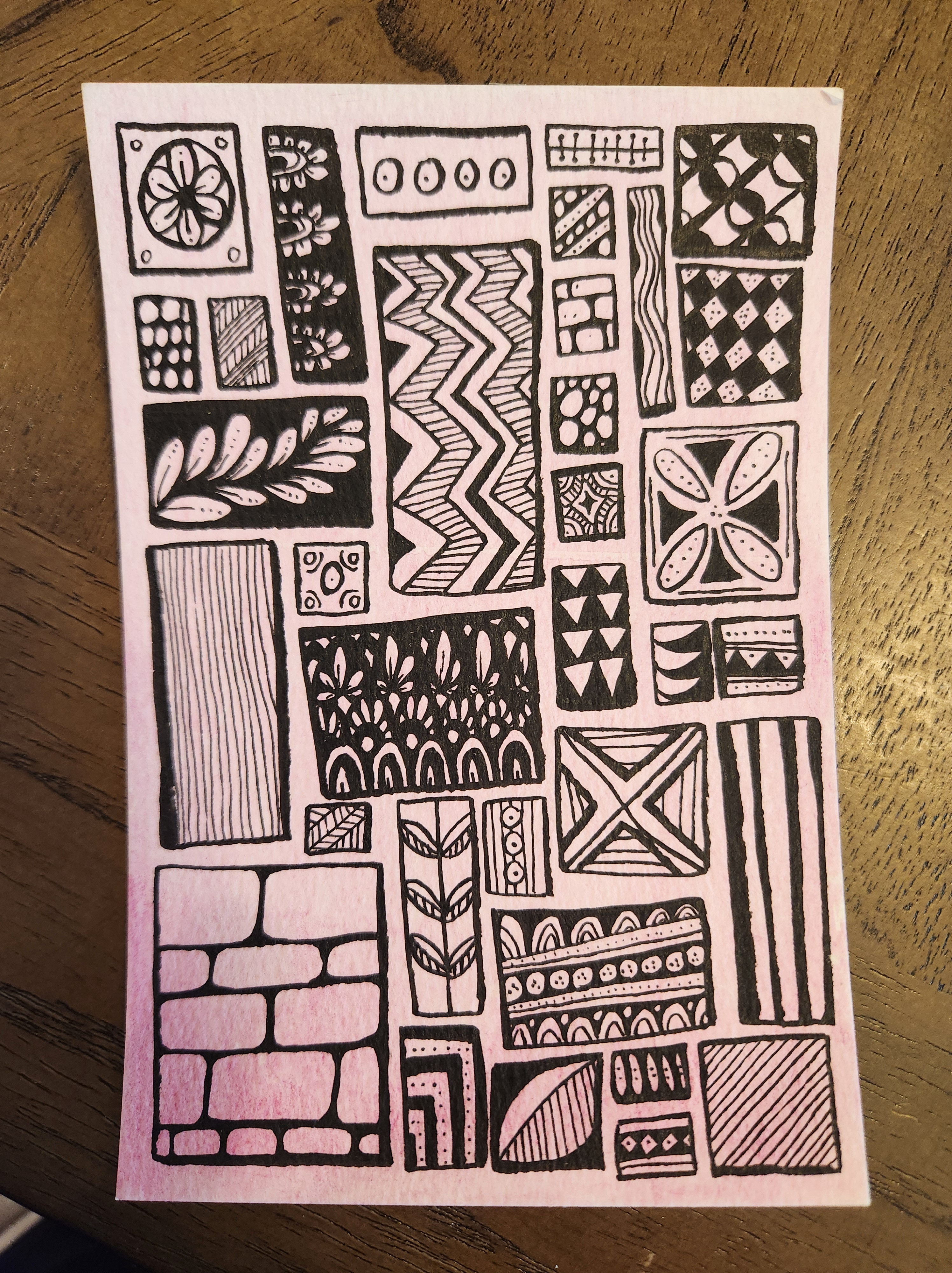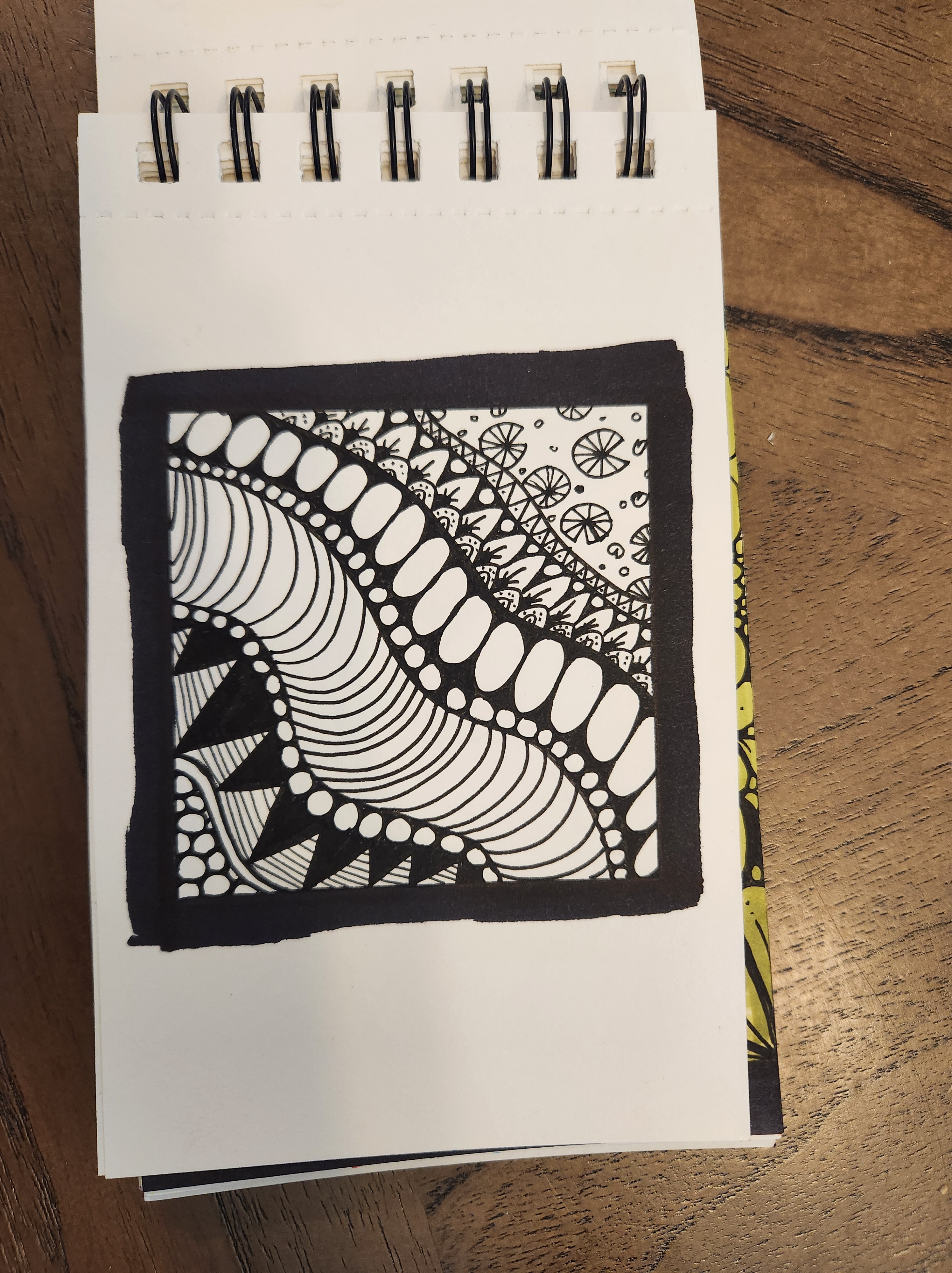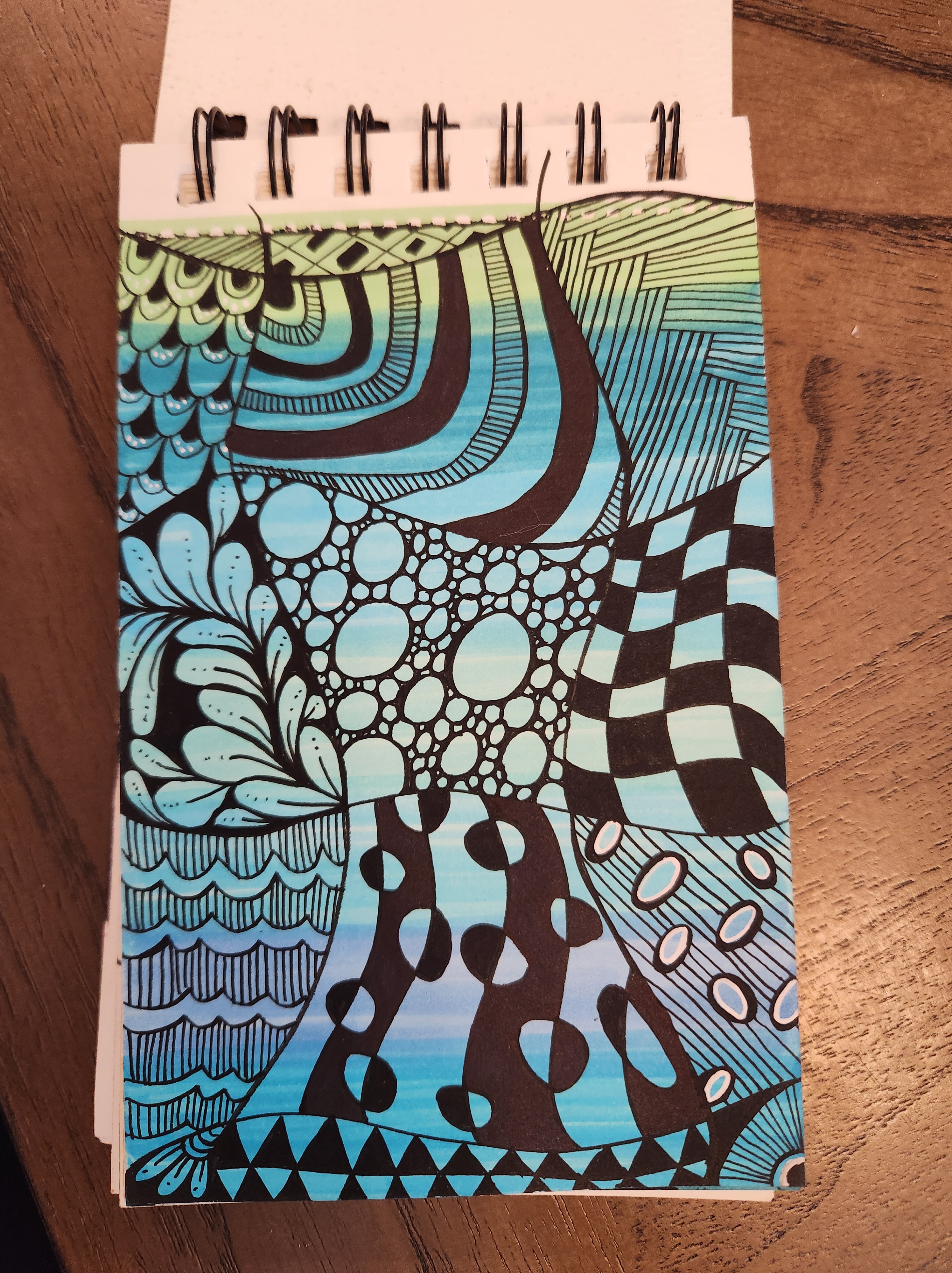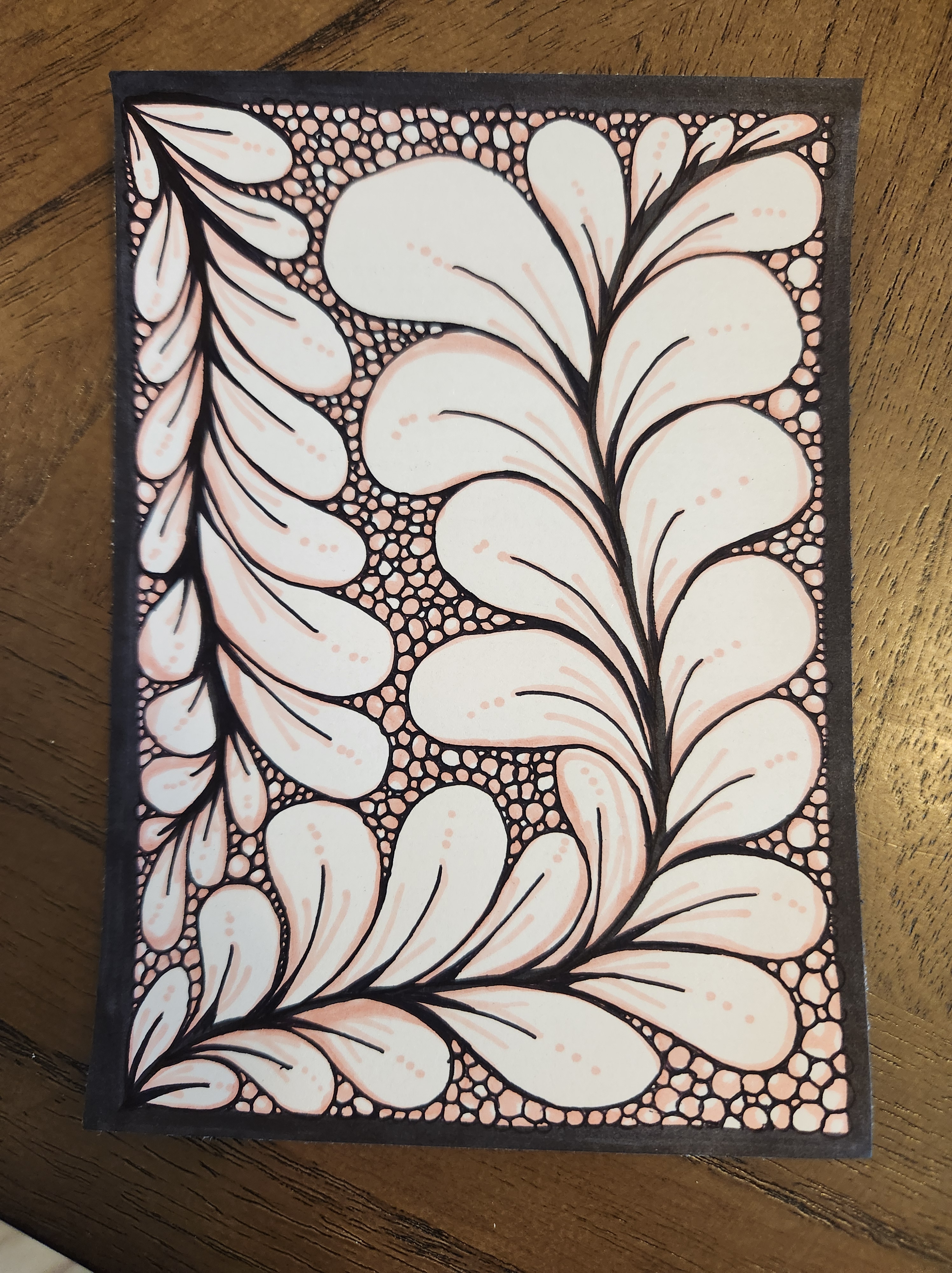It is a lot, a LOT of pictures. So I hope you’re ready for some serious zentangles. Lol. I do recommend those by the way, as they gave me kind of a free form space to start from. I also really like Tombow fudenosuke brush pens the best of everything I tried. I had a bunch of micron pens laying around so I used them at first, but I did change quickly.
