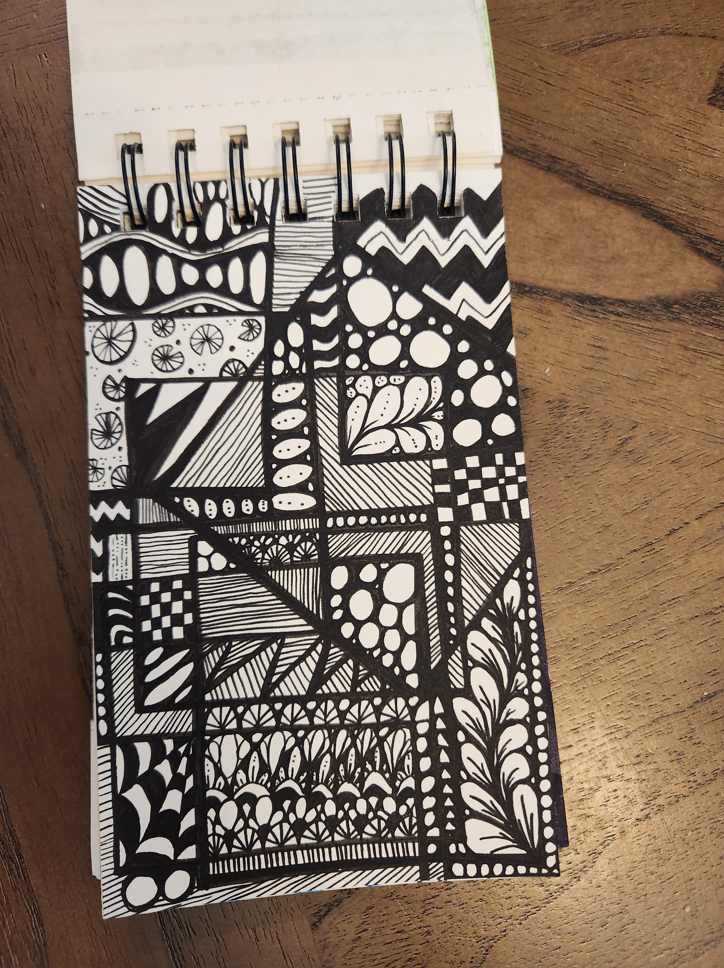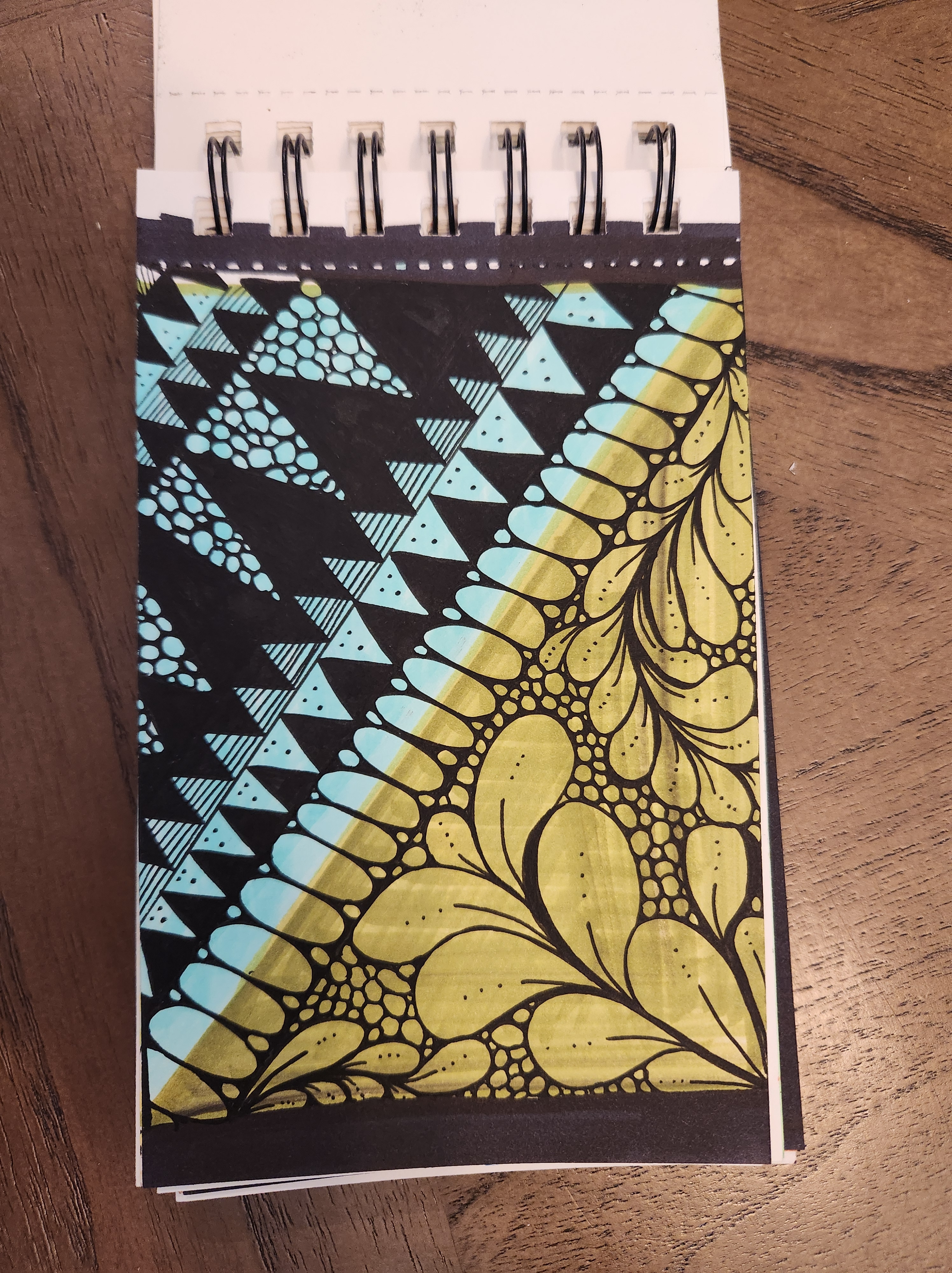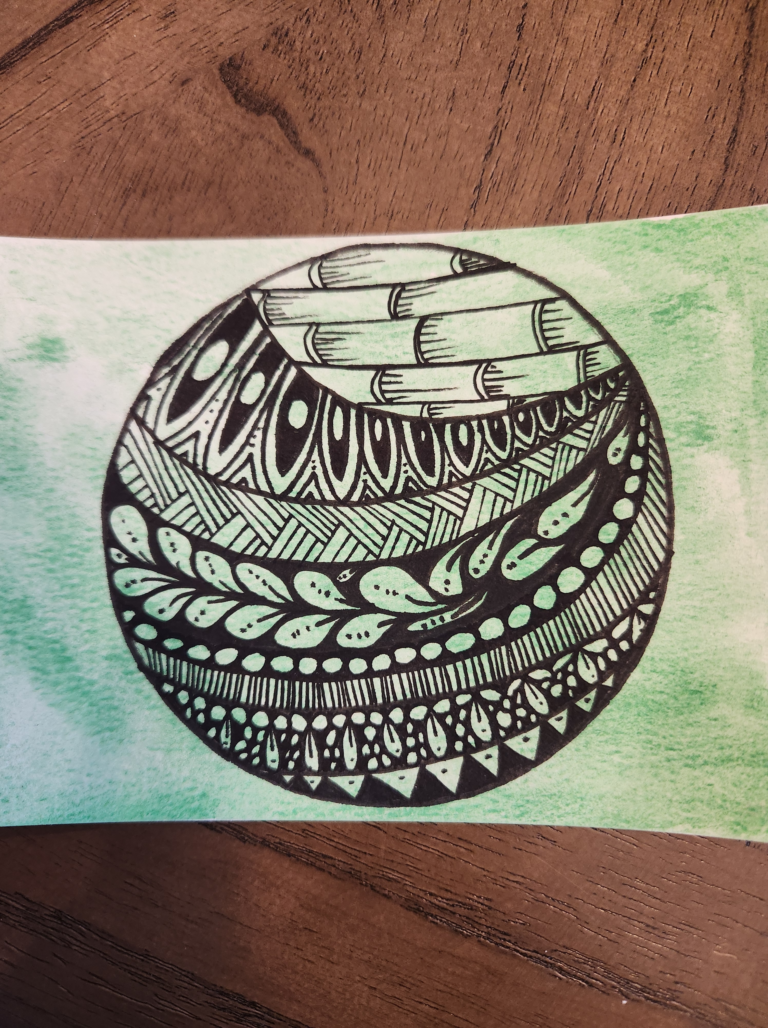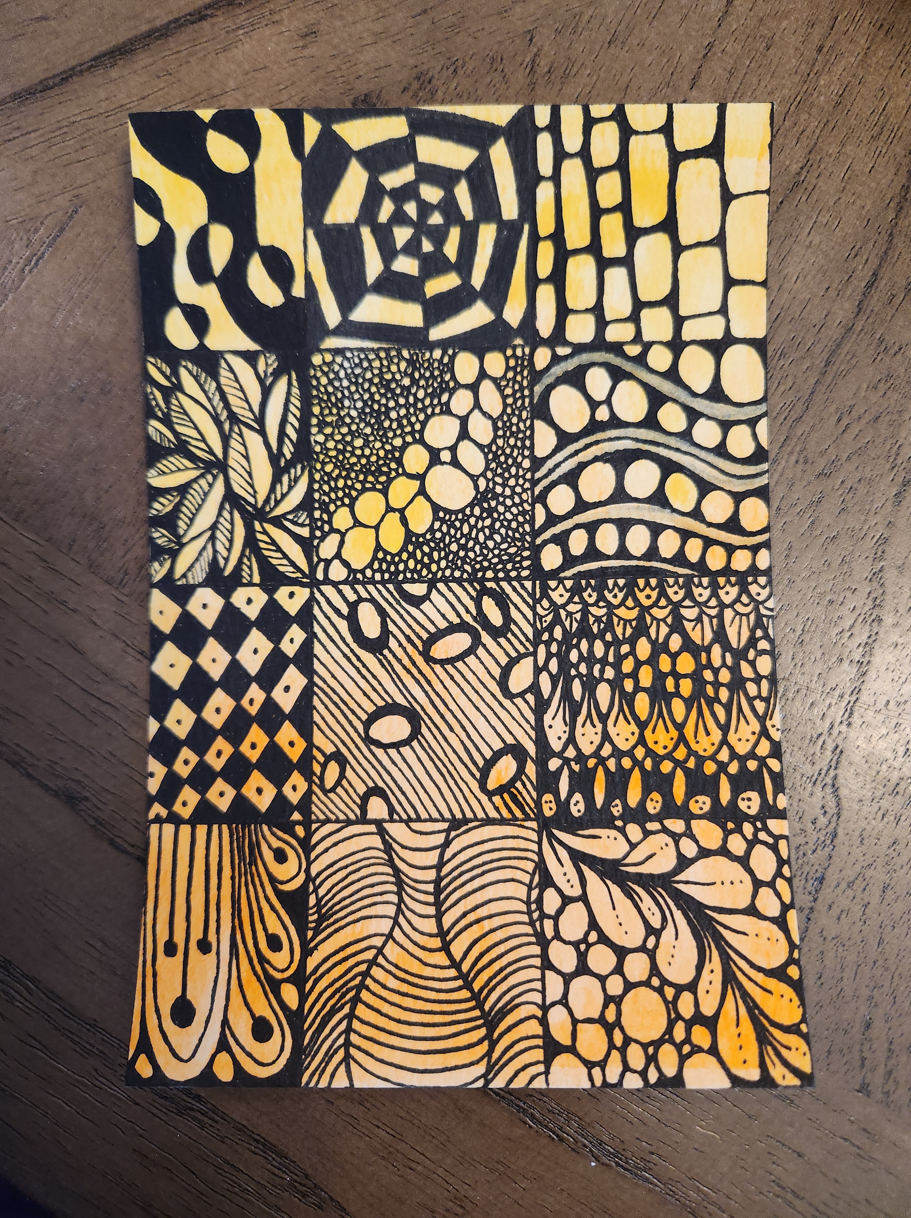 It is a lot, a LOT of pictures. So I hope you’re ready for some serious zentangles. Lol. I do recommend those by the way, as they gave me kind of a free form space to start from. I also really like Tombow fudenosuke brush pens the best of everything I tried. I had a bunch of micron pens laying around so I used them at first, but I did change quickly.