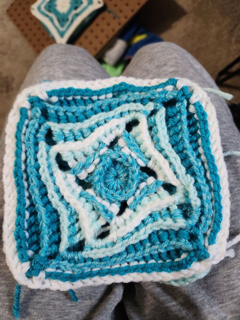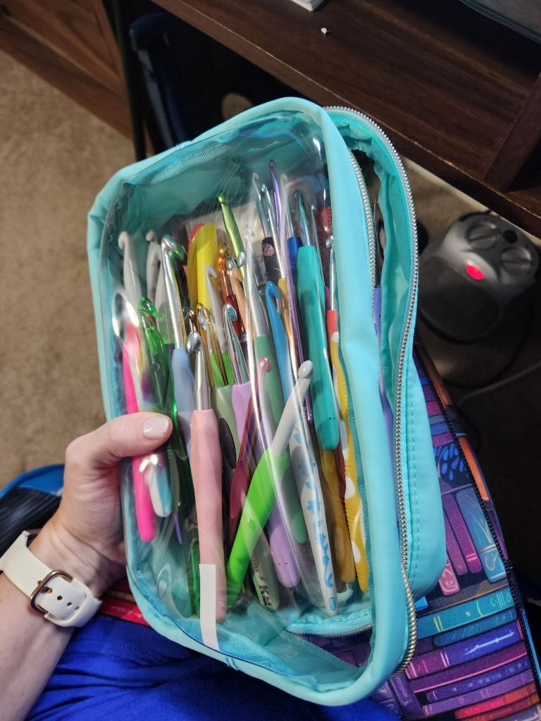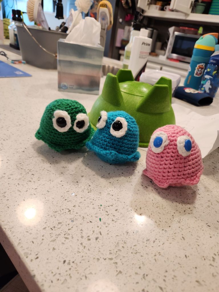 Then I crocheted a bunch of other stuff. Some granny squares (my brain likes the ‘complete’ dopamine they give quickly. lol) A mermaid tail blanket for one of my friends’ kiddos that is going through it, and some pac-man ghosts in custom colors. TO only likes ‘teal’ and CG likes anything green. Also, i organized my crochet hooks. there are too many of them.