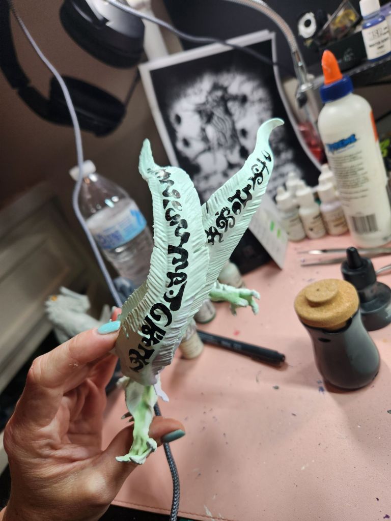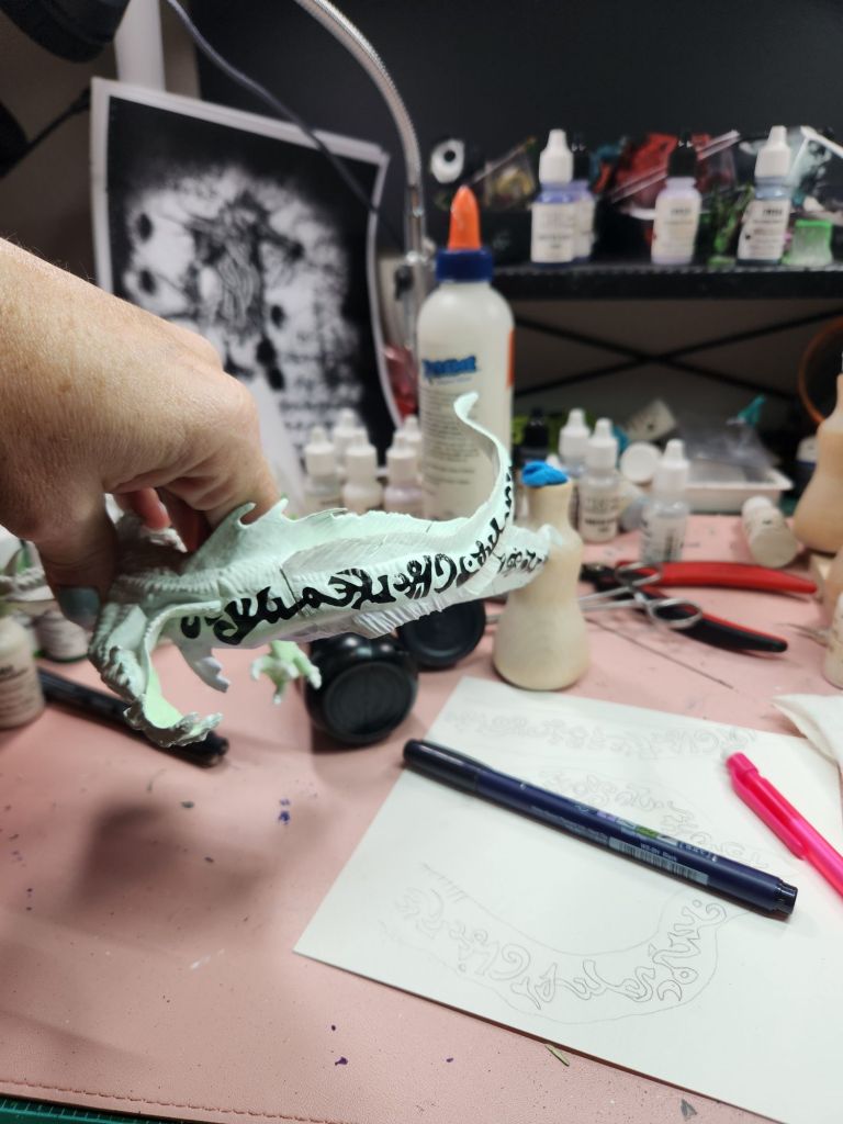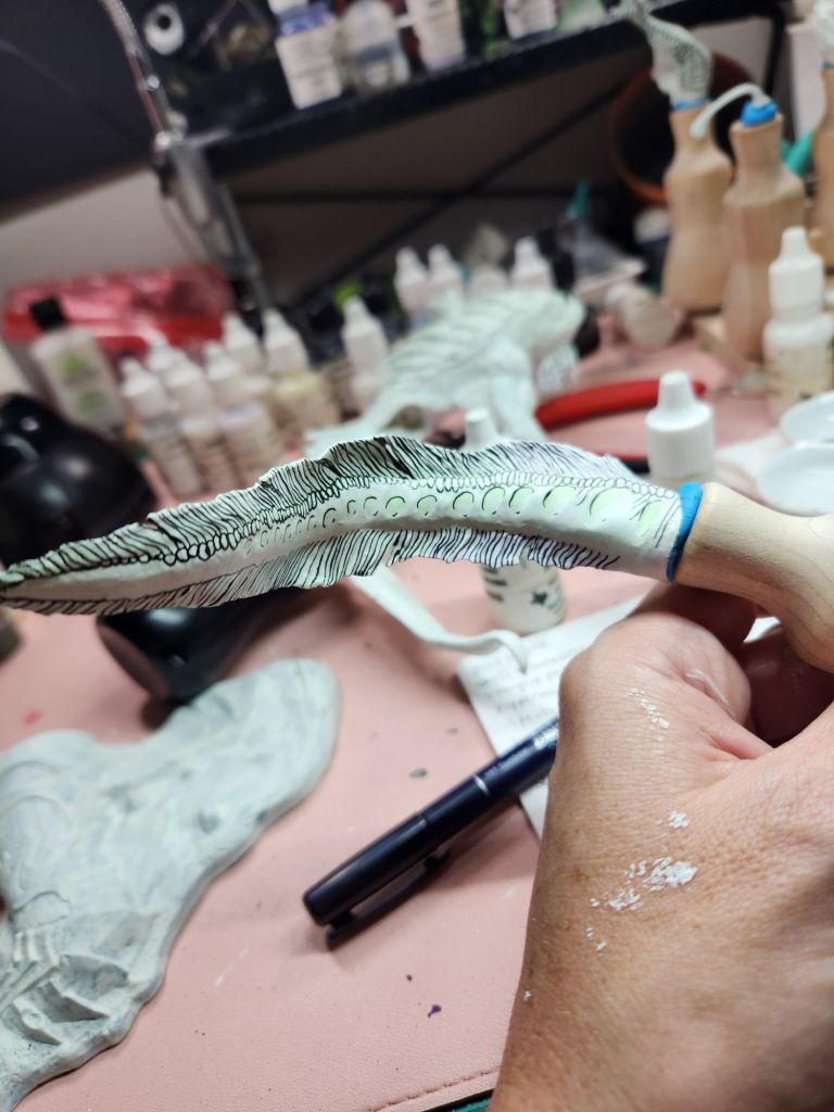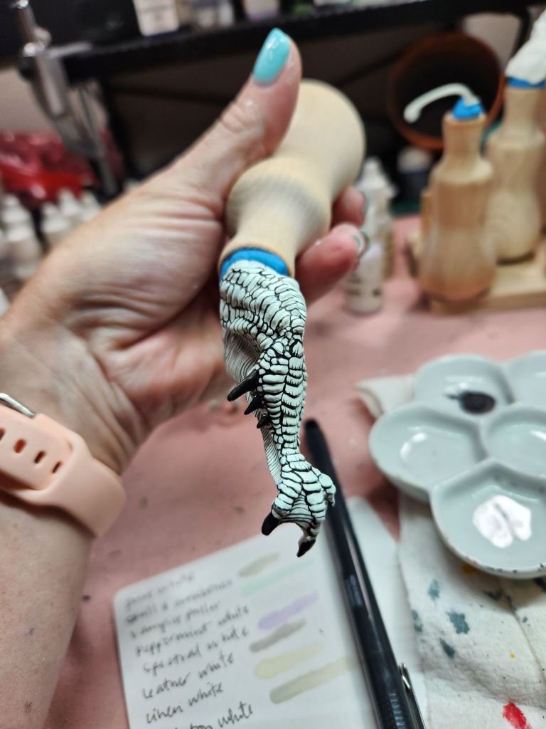 I started my “proof of concept” with a leg. I know it looks like an arm, but it’s a leg. lol. And I loved it! I know I nailed it when I take it to GBO and he goes, “oh yeah, that’s great!”. So that was where I started, and the scales make me happy. ( you can see part of the swatch on the left. It’s nuts how different they are!)