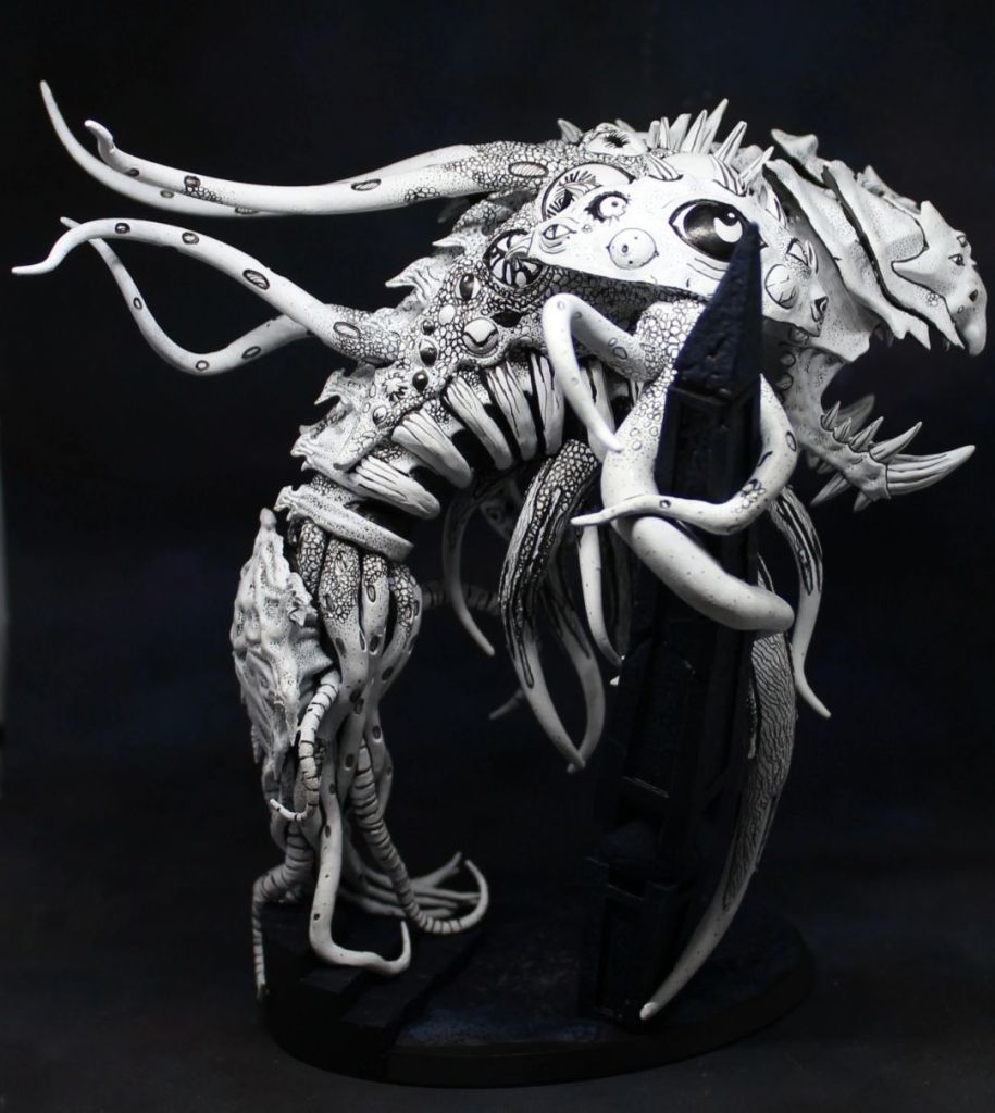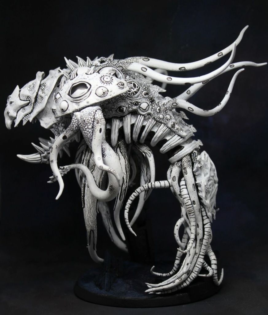 So onto more painting! I have been really having trouble finding motivation. I sat around and fussed and whined and decided that I needed to figure out what part of painting is still enjoyable to me. I really only paint for about one month of the year, when I’m gearing up for reapercon. But I do line art almost every single day. So I decided to go back to my black and white that I love ad practice regularly. I got some fairly negative feedback last time I tried this, but I only ever get rave reviews when people actually pick up Yog Sothoth. (Reminder of what he looks like below). I really enjoy the lines and the concept of just black and white to make all of the effects I like.
