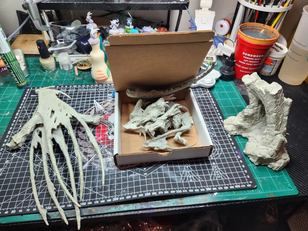 I started working on this big old boy. I was super lucky to have been gifted this at Reapercon last year. (This is the box he came in, with some saran wrap thrown in. lol) He’s the BIG resin Nethyrmaul. The bones model was mistakenly made significantly smaller, pic for scale.