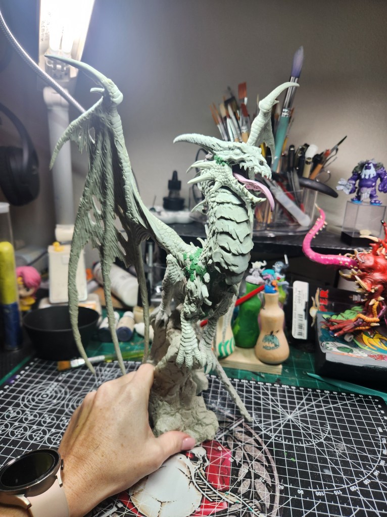 Anyways, I got started prepping him. I’m not sure if you’ve ever painted one of these older resin sets (he’s from Bones 1, so that was 2012), but they are quite a bit of work. The gaps are huge, as are the mold lines. I definitely had to bust out my nail drill, and had to get a whole set of bits for it to really clean it up. It also required a lot of green stuff work. I had to go buy more to make sure I had enough. This kit has been sitting in Ron’s office in a random box for *a decade* so it was also missing a few pieces, and had some bits broken off. So I made a new tail, sculpted some extra back bones, and lots and lots of scales. Please, Dearest Julie Guthrie, forgive me for sculpting on your beautiful work. It felt like repairing the Mona Lisa.